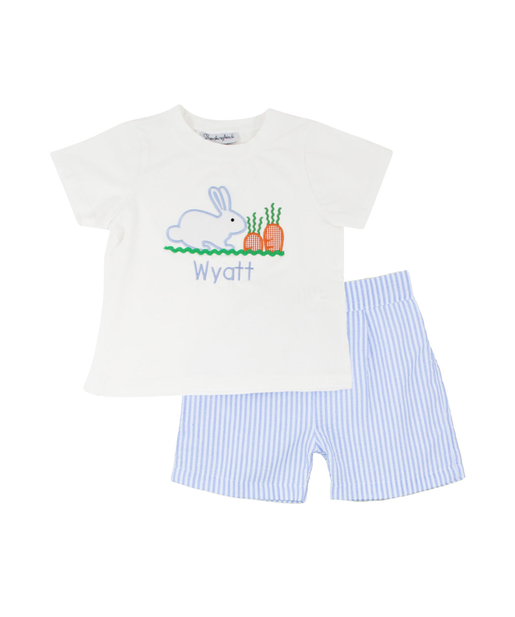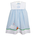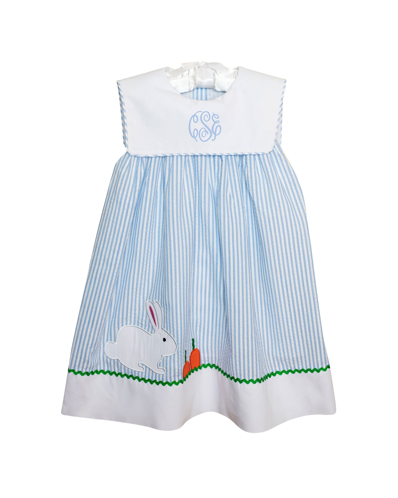 This is our bestselling Easter outfit. Your little one is sure to love this applique bunny and carrots on blue seersucker dress with white bib collar. Add a name or monogram for a personal touch. It's perfect for all the Easter festivities.