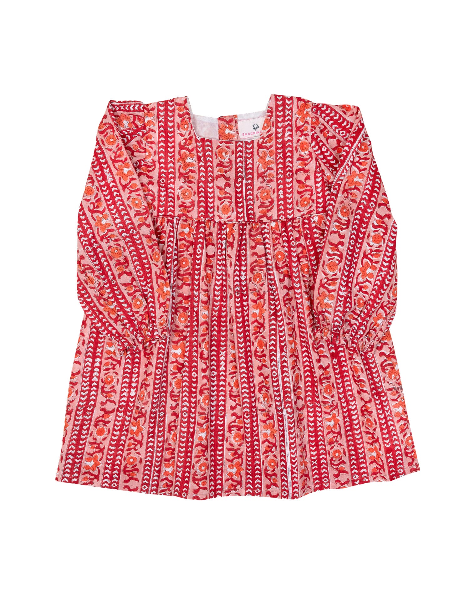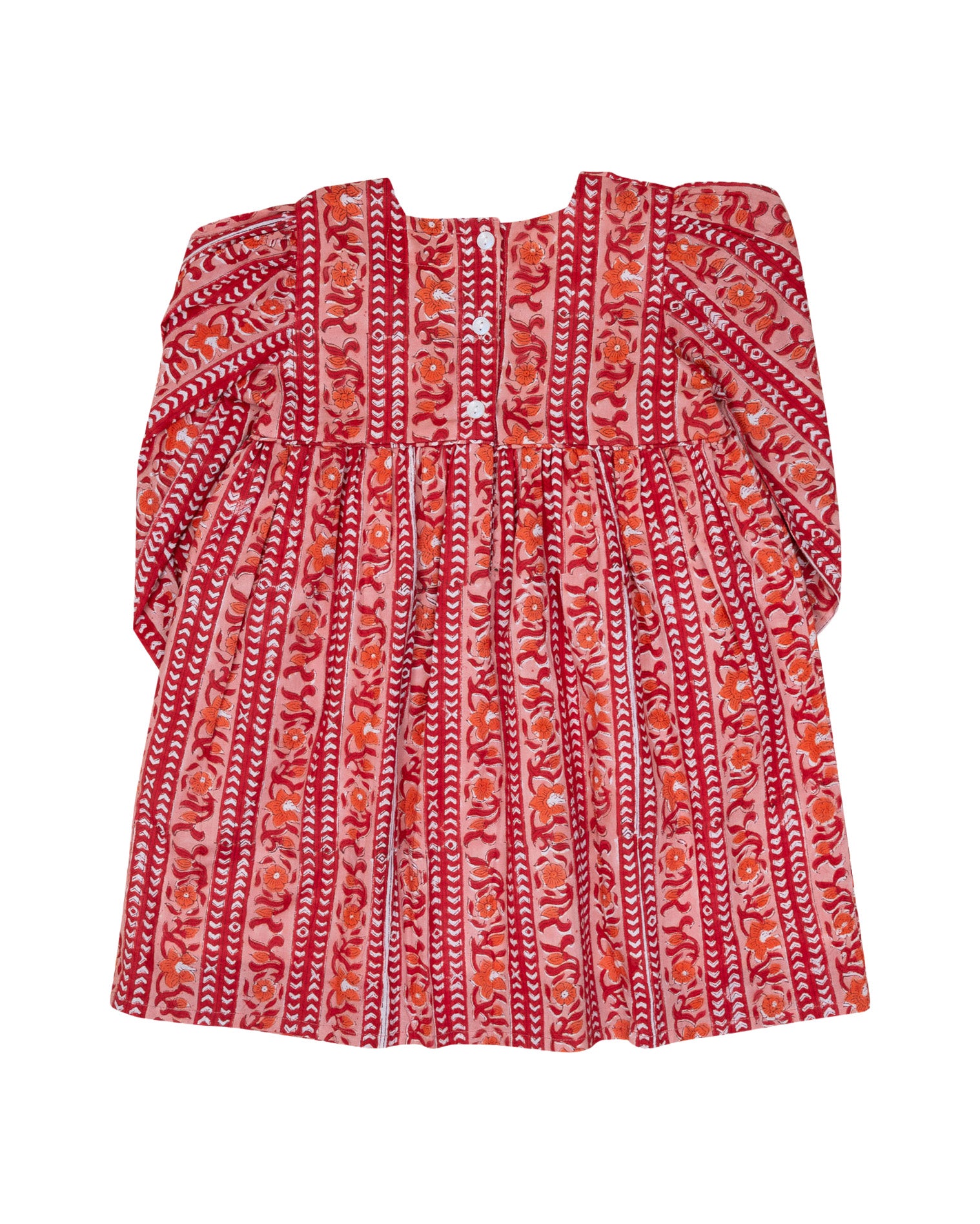 Celebrate Valentine's in timeless elegance with our Persimmon Block Print Dress. This beautifully crafted dress features a rich red and pink block print adorned with delicate florals, long puffed sleeves with ruffle cuffs, and a square neckline for a classic yet modern look.