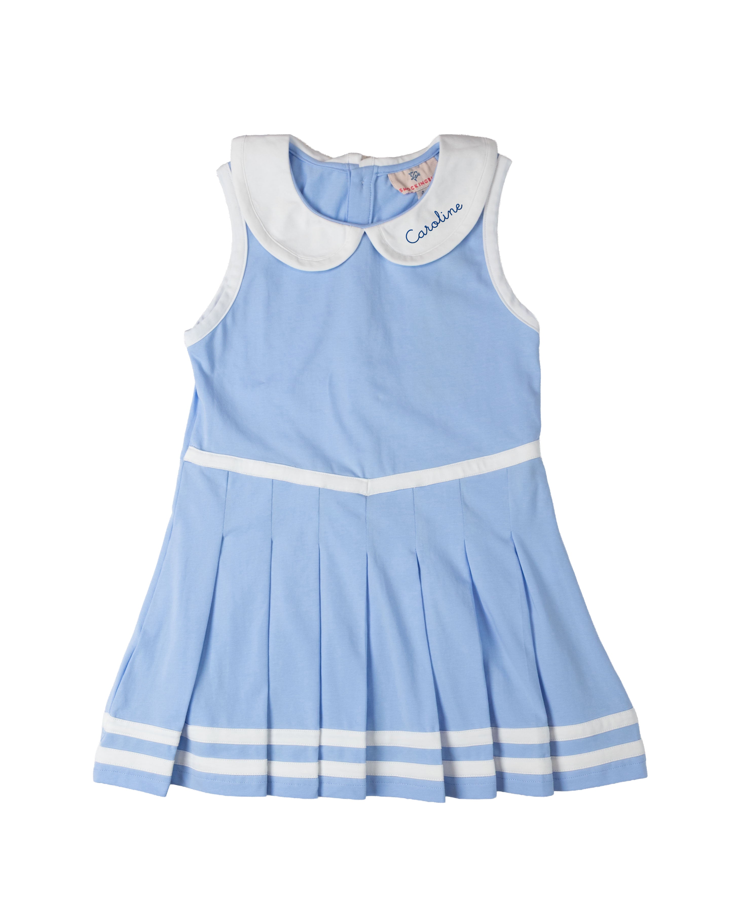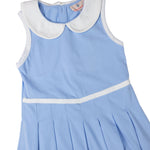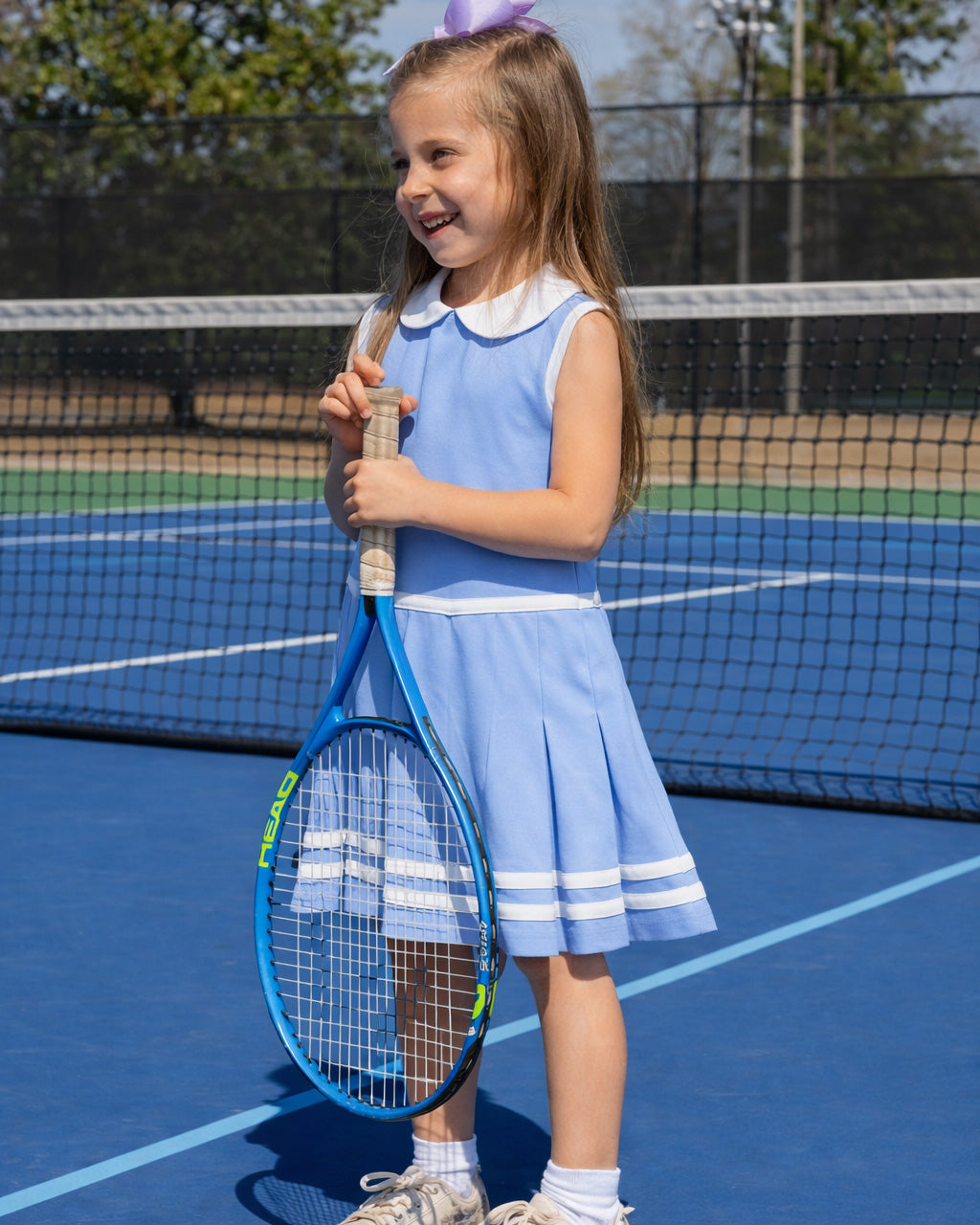 Elevate your game of tennis in this Light Blue Knit Tennis Dress. Dress features white trim along the sleeves, collar, and a pleated hem. Add a name or monogram to this dress for a personal touch.