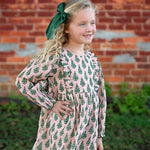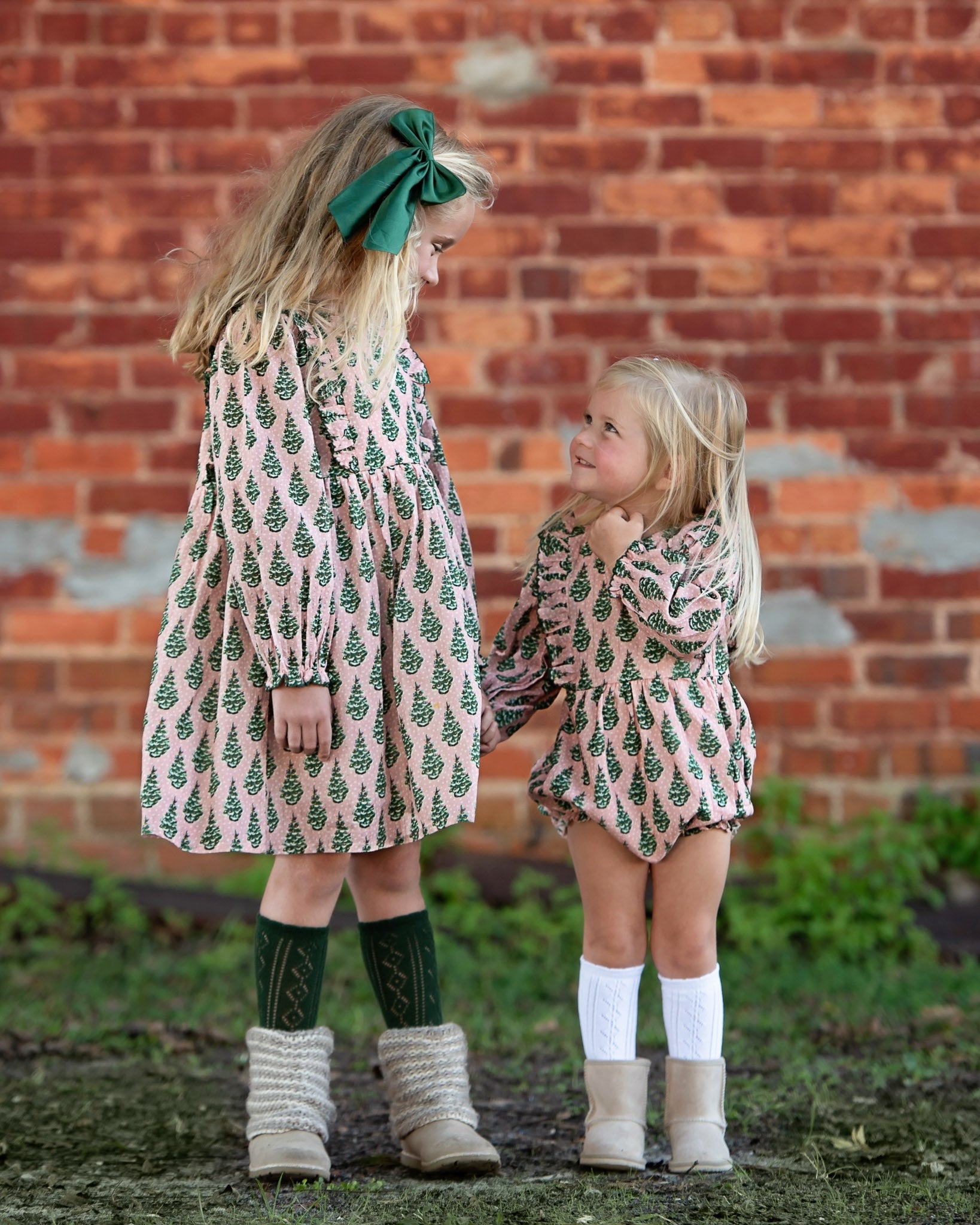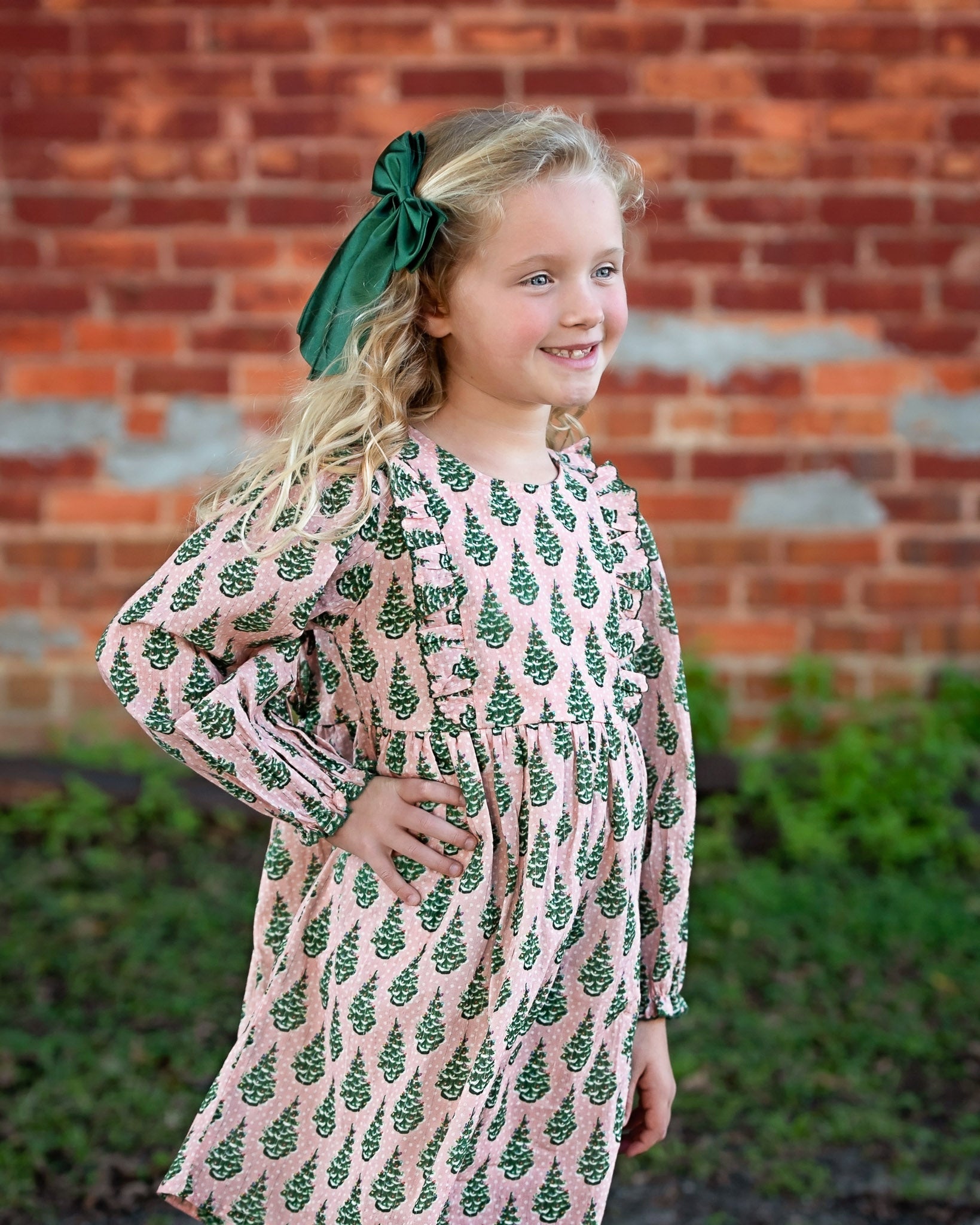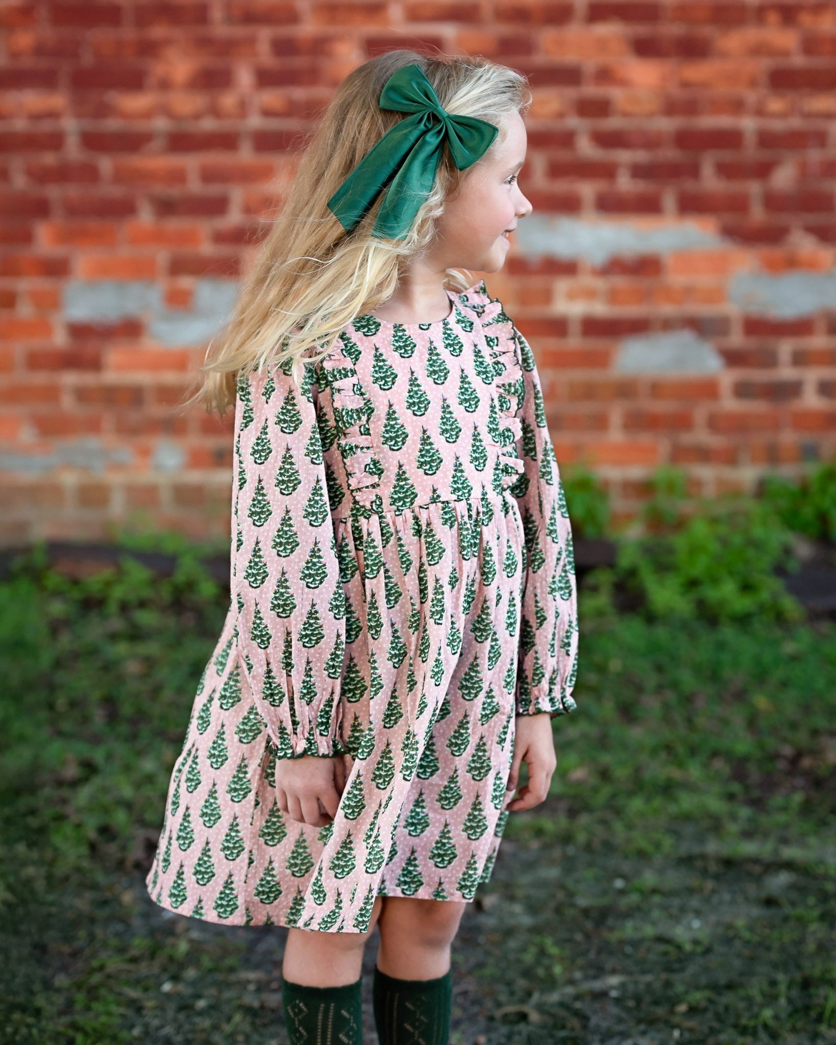 A nostalgic holiday dream! Our Vintage Ceramic Christmas Tree Dress captures the magic of Christmas past with a charming tree print accented by shimmering silver lurex. The classic long-sleeve silhouette is adorned with delicate ruffle details, while the soft, breathable fabric ensures all-day comfort. Perfect for family gatherings, holiday photos, and twirling under the Christmas lights!