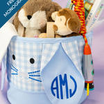 This adorable basket is the perfect size for egg hunts and basket stuffers! Add a free name or monogram to the ear to complete the look.
