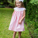 This precious dress is the perfect outfit for any occasion. Using Pink gingham and a large round White collar trimmed with hand embroidered rosettes your little one will be the center of attention. Add a hair bow for the finishing touch!