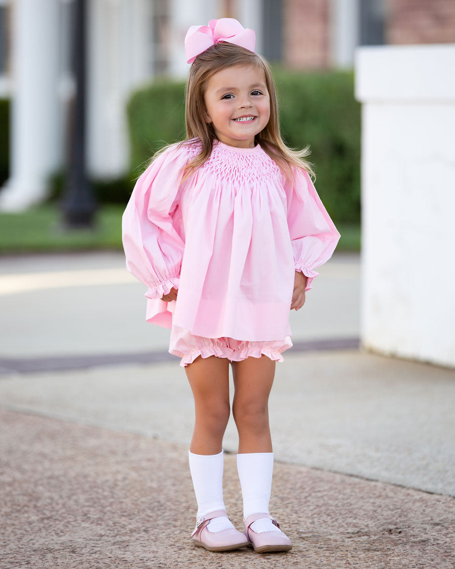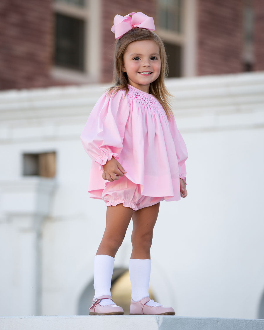 This precious bloomer set is made of plain pink pique fabric with honeycomb smocking around the neck. Elastic at the arms and legs allow for a small ruffle. Add knee socks and a bow to complete the look!