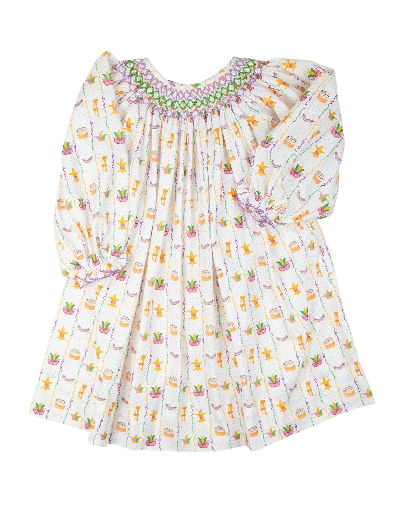 Let the good times roll with our festive Mardi Gras Smocked Dress! Featuring a playful Mardi Gras-inspired print with crowns, masks, and beads, this dress is perfect for celebrating in style. Designed with a classic smocked neckline, long sleeves, and a twirl-worthy silhouette, it ensures comfort and charm for your little one during any festive occasion.