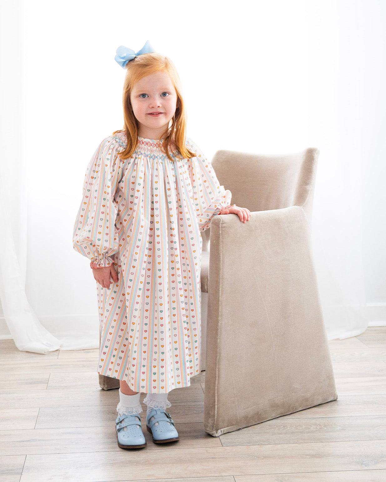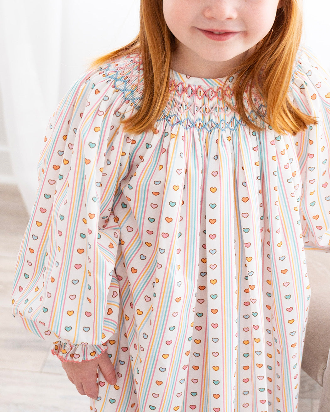 Make Valentine’s moments extra special with our Vintage Smocked Heart Striped Dress! Featuring a lovely heart-patterned knit fabric, this dress is finished with a beautifully smocked yoke accented by sweet smocked hearts. It’s the perfect outfit for celebrating love in style.
