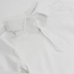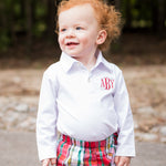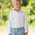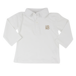 This white polo long sleeve shirt is the perfect addition to anyones wardrobe. This plain white polo collared shirt is perfect to pair with any of our seasonal pants, or by itself as staple shirt to pair with your favorite jeans at home. This soft and stretchy knit is the perfect combination between classic and comfort. Add a monogram or name to the left chest for a perfectly personalized outfit.