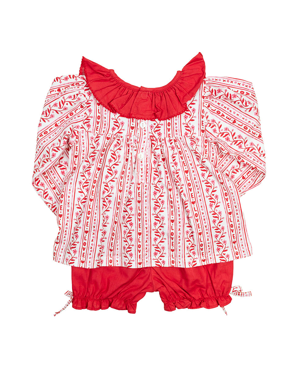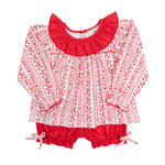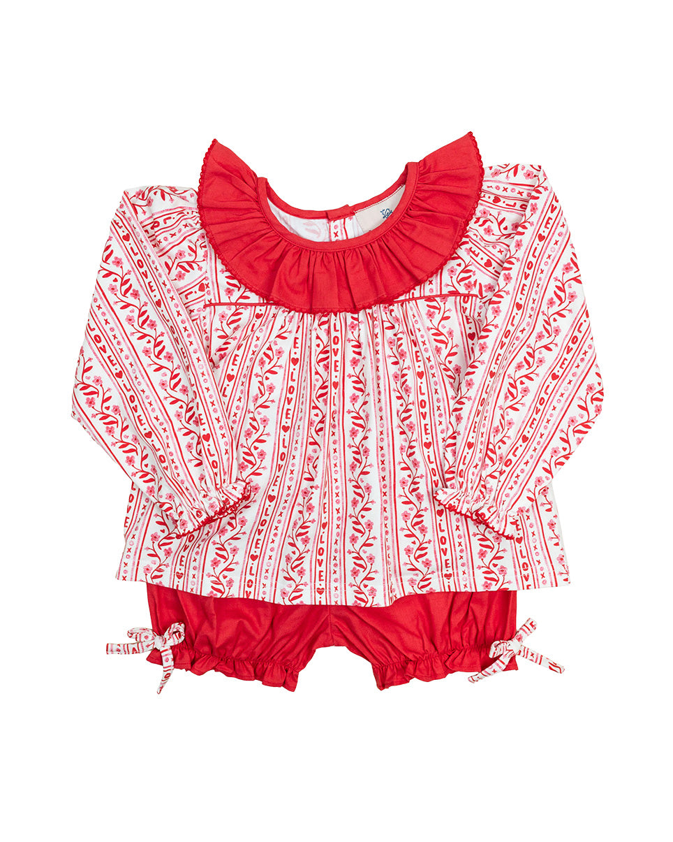 Say hello to Valentine-ready sweetness with our Be Mine Blossoms Bloomer Set. Featuring a dainty floral print and soft red bloomers trimmed with tiny bows, this darling duo captures the spirit of love in every stitch. Perfect for cozy days, playdates, or any occasion worth a little extra charm.