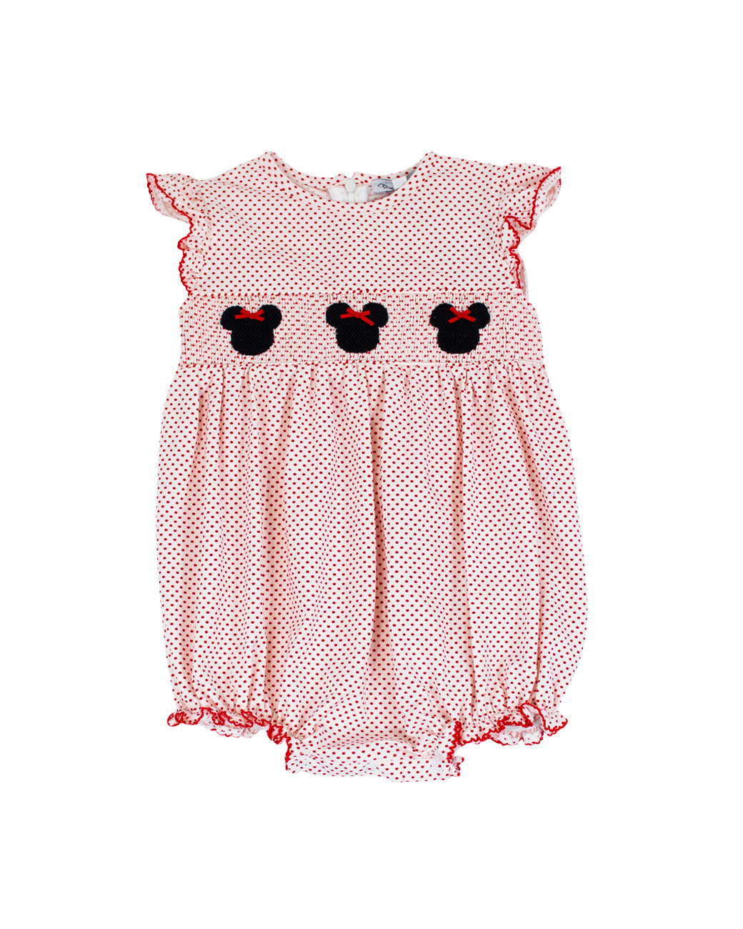 White knit bubble with tiny red polka dots with mouse smocking across chest.