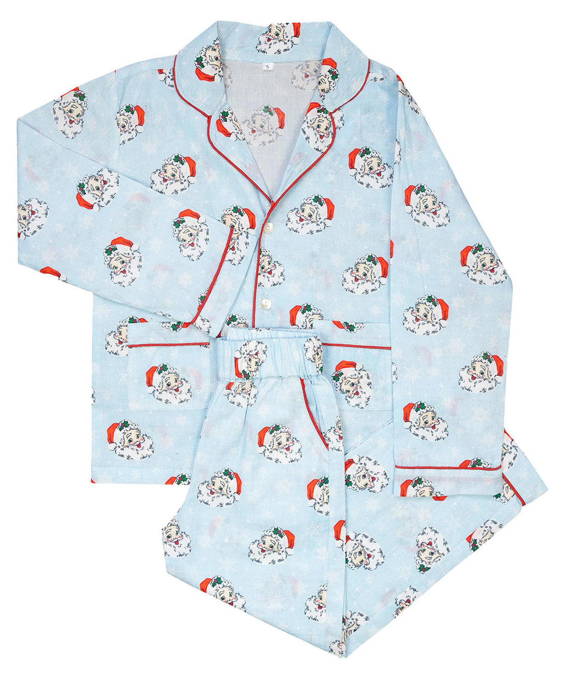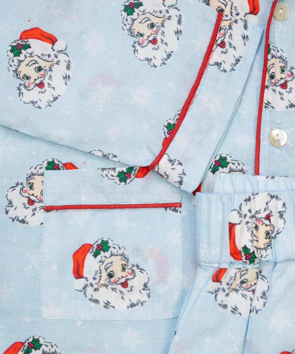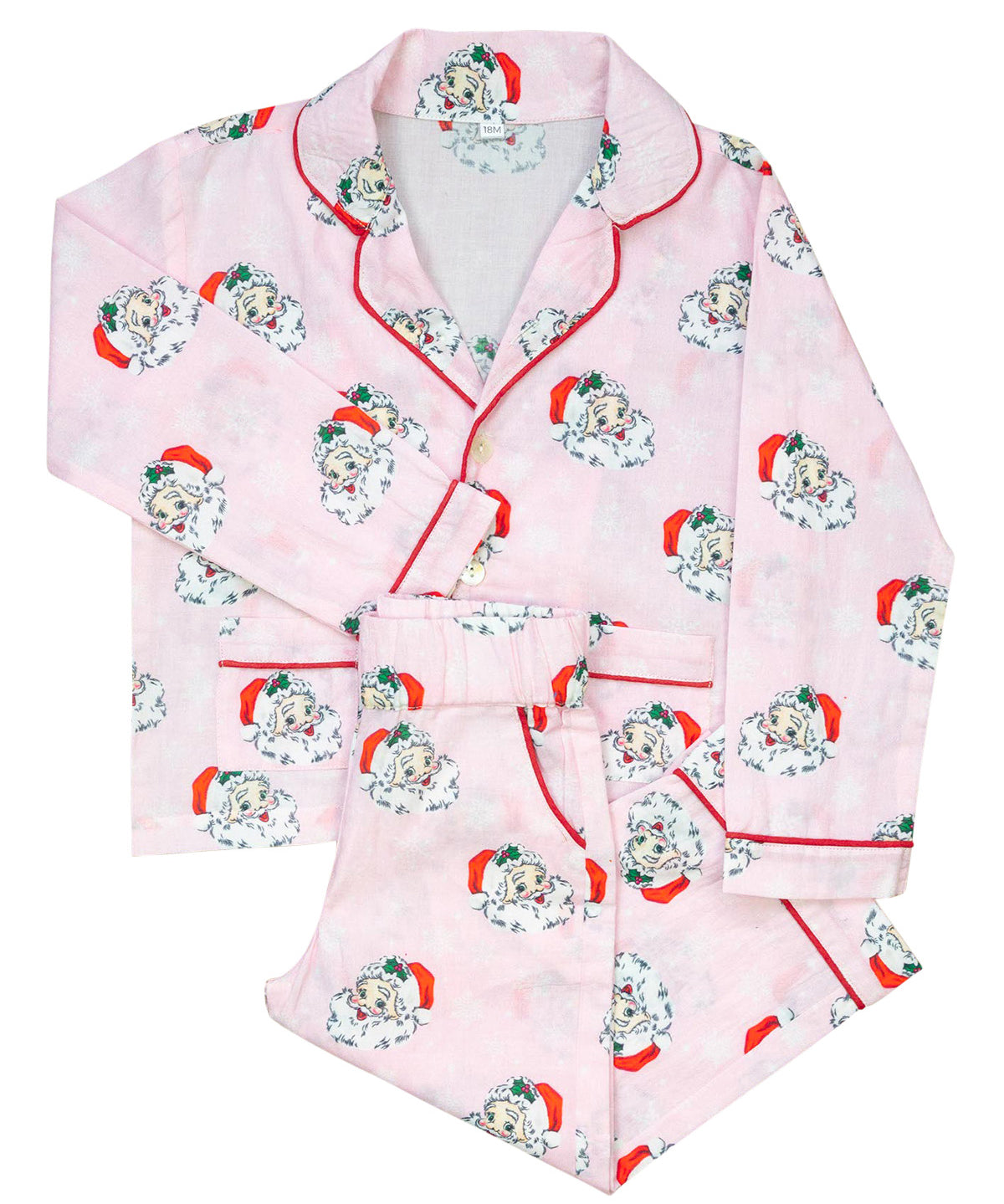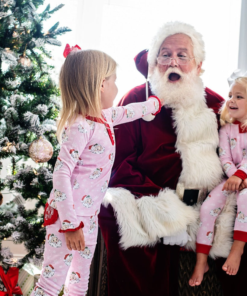 The same favorite Christmas print, in an all new style!! These ultra soft pink vintage Santa print pajamas button down the front, and have an elastic waist for a perfect fit. Matching kids sizes available for tons of fun this Christmas.
