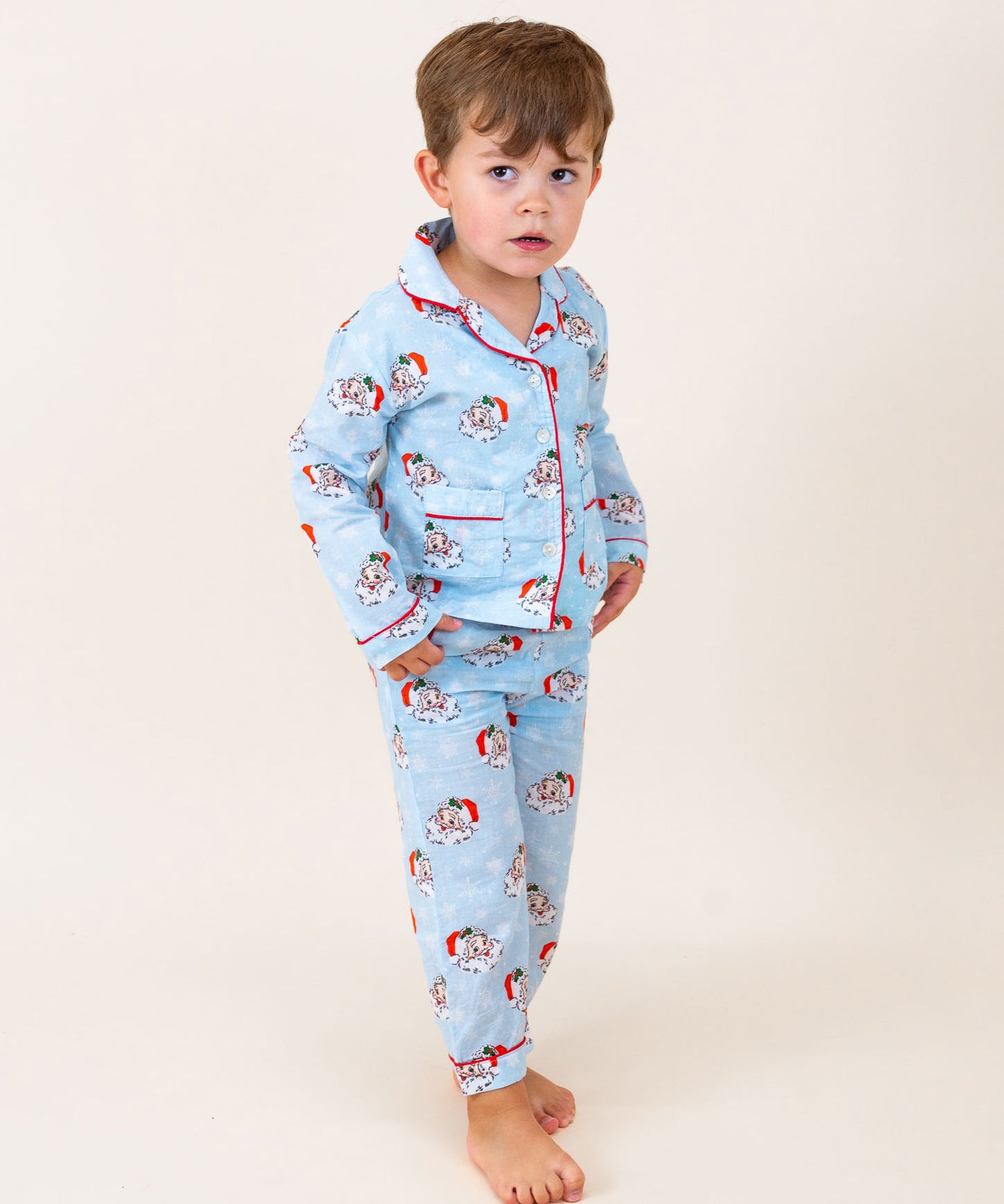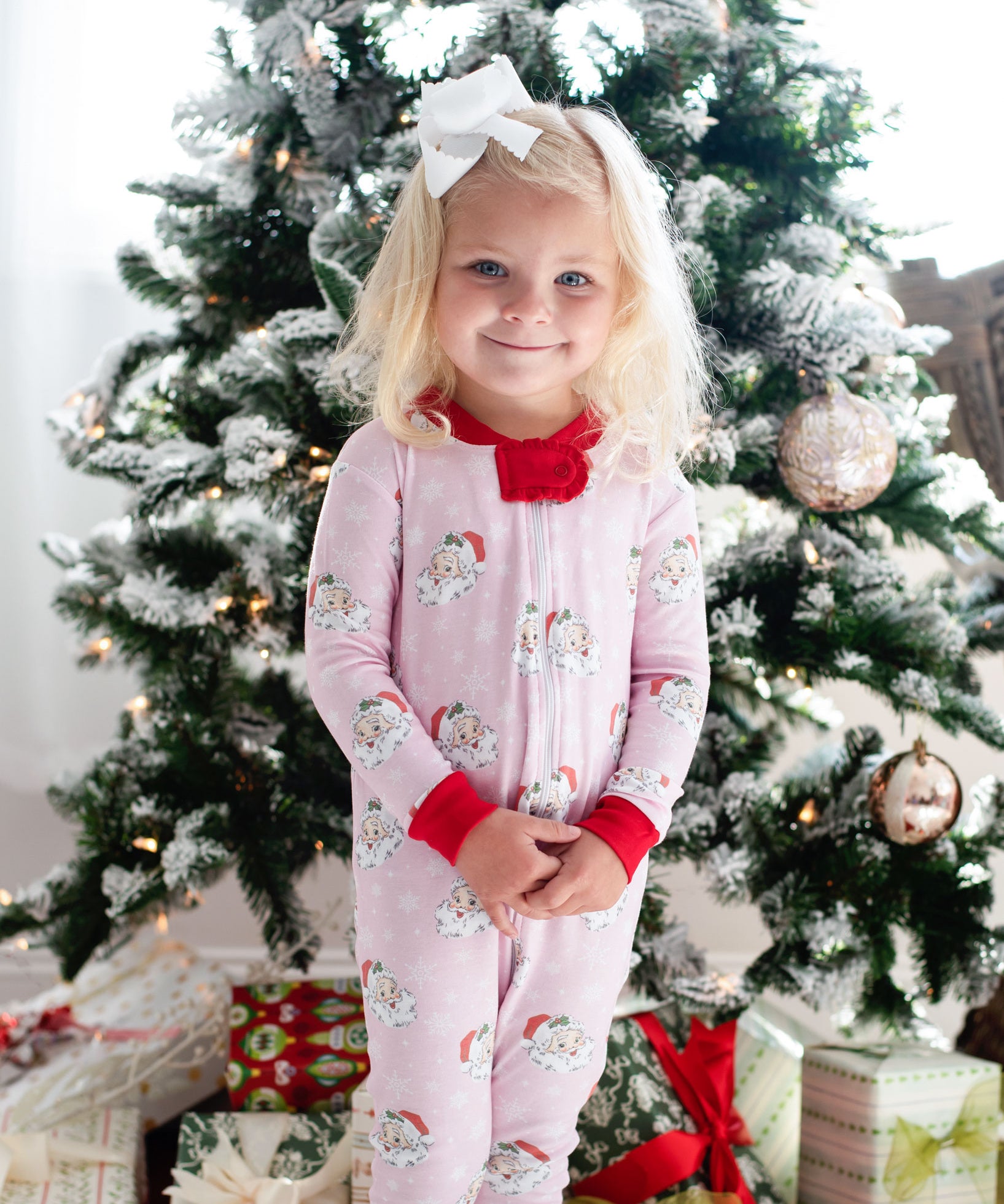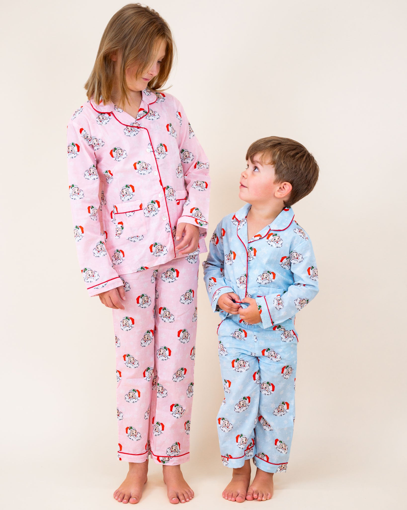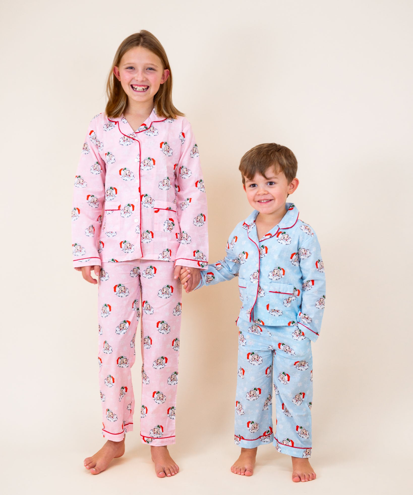 The same favorite Christmas print, in an all new style!! These ultra soft pink vintage Santa print pajamas button down the front, and have an elastic waist for a perfect fit. Matching kids sizes available for tons of fun this Christmas.