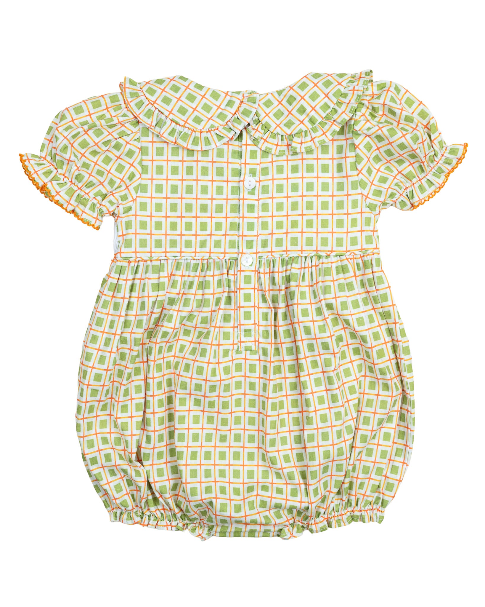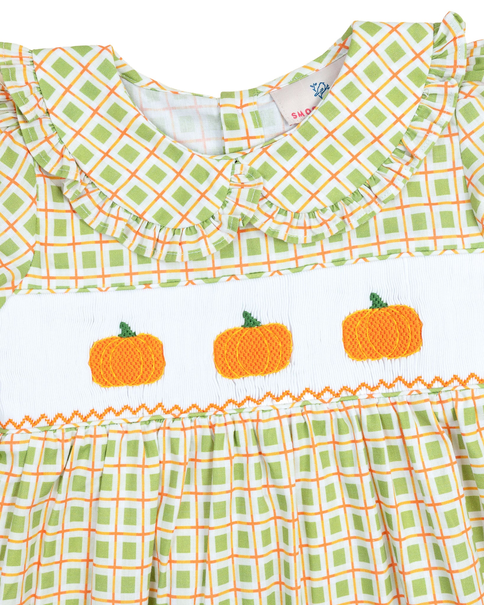 Pumpkin perfection for your little one! The Pumpkin Smocked Plaid Girl Bubble is full of fall charm with its hand-smocked pumpkin detail, ruffle collar, and comfy bubble silhouette. Snaps at the bottom make for easy changes, and the plaid fabric is as festive as it is soft.