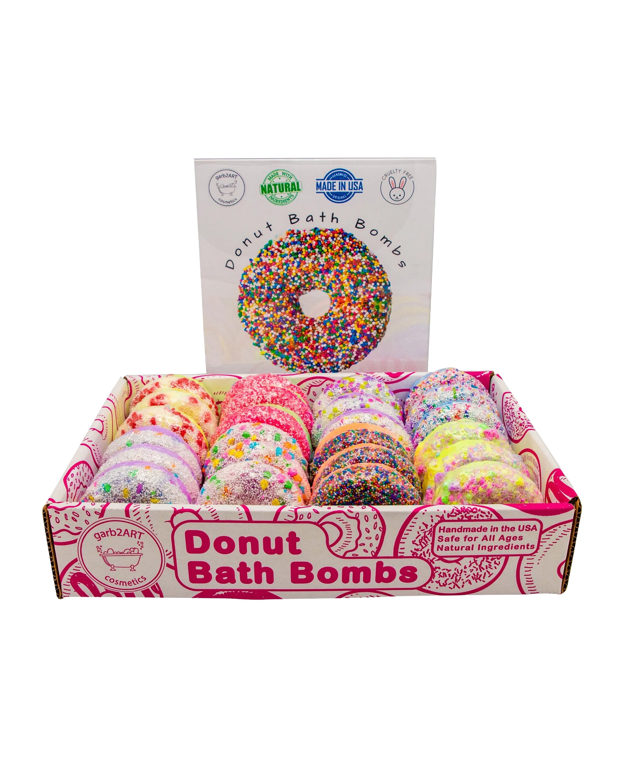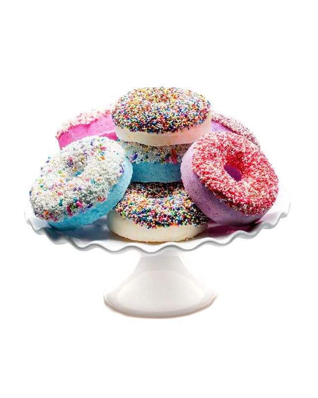 These bath bombs make the perfect gift! Each donut is pressed with epsom salt, shea butter & natural ingredients. Sprinkles, colors and scents will vary. Approximately 3" x 3" x 1" and 5 oz. Items sold separately (price per 1 item)