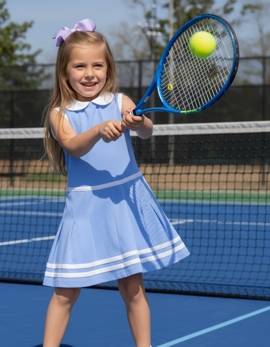 Elevate your game of tennis in this Light Blue Knit Tennis Dress. Dress features white trim along the sleeves, collar, and a pleated hem. Add a name or monogram to this dress for a personal touch.