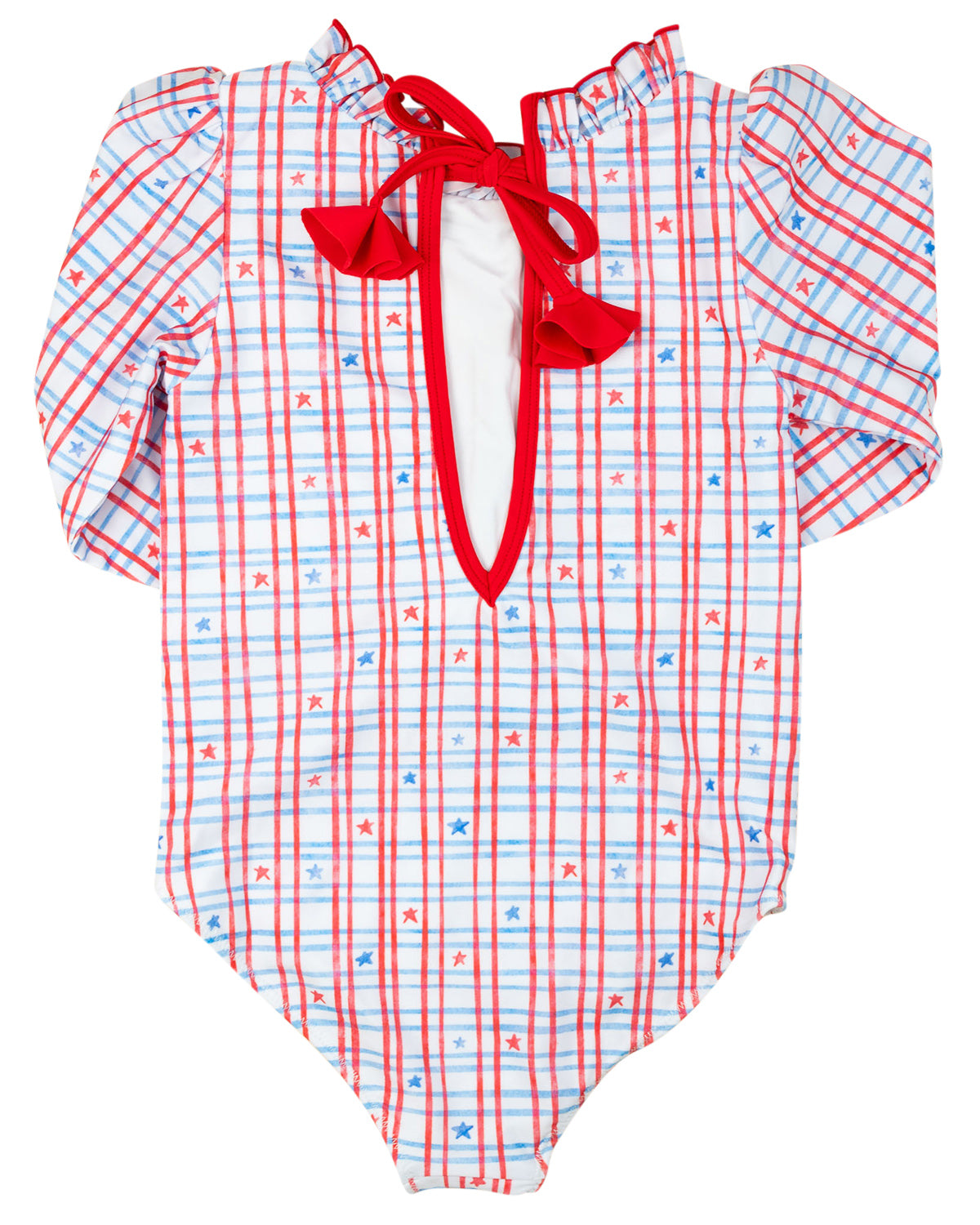 Dive into all-day fun with our Stars and Stripes Long Sleeve One Piece, blending style, comfort, and practicality! This one-piece swimsuit showcases a vibrant stars-and-stripes design in patriotic hues, perfect for summer outings. Crafted with long sleeves for added sun coverage, it features a tie-back closure for easy dressing and a snug yet flexible fit for active play. Whether splashing in the waves or building sandcastles, this suit is a standout choice for star-spangled fun!