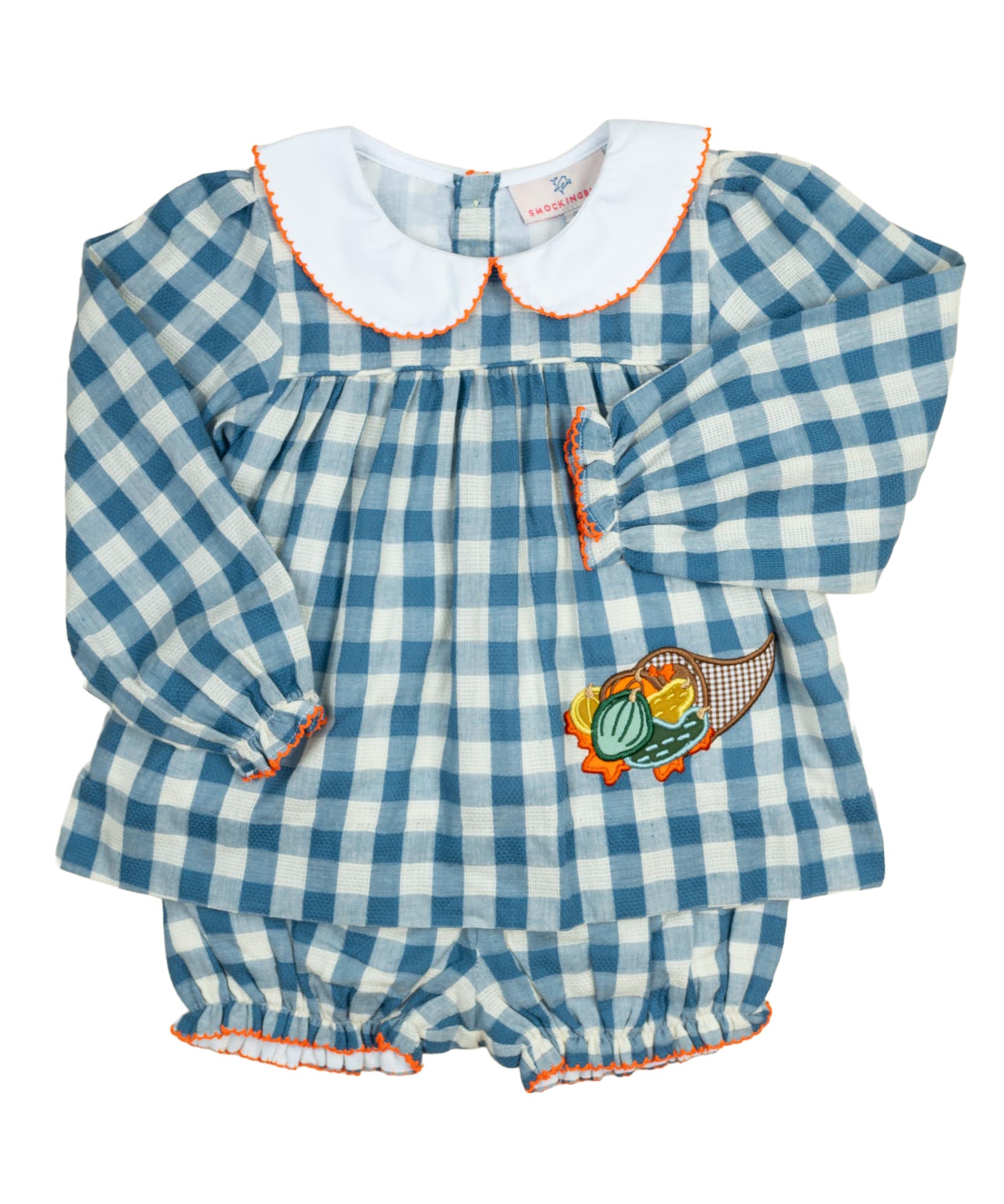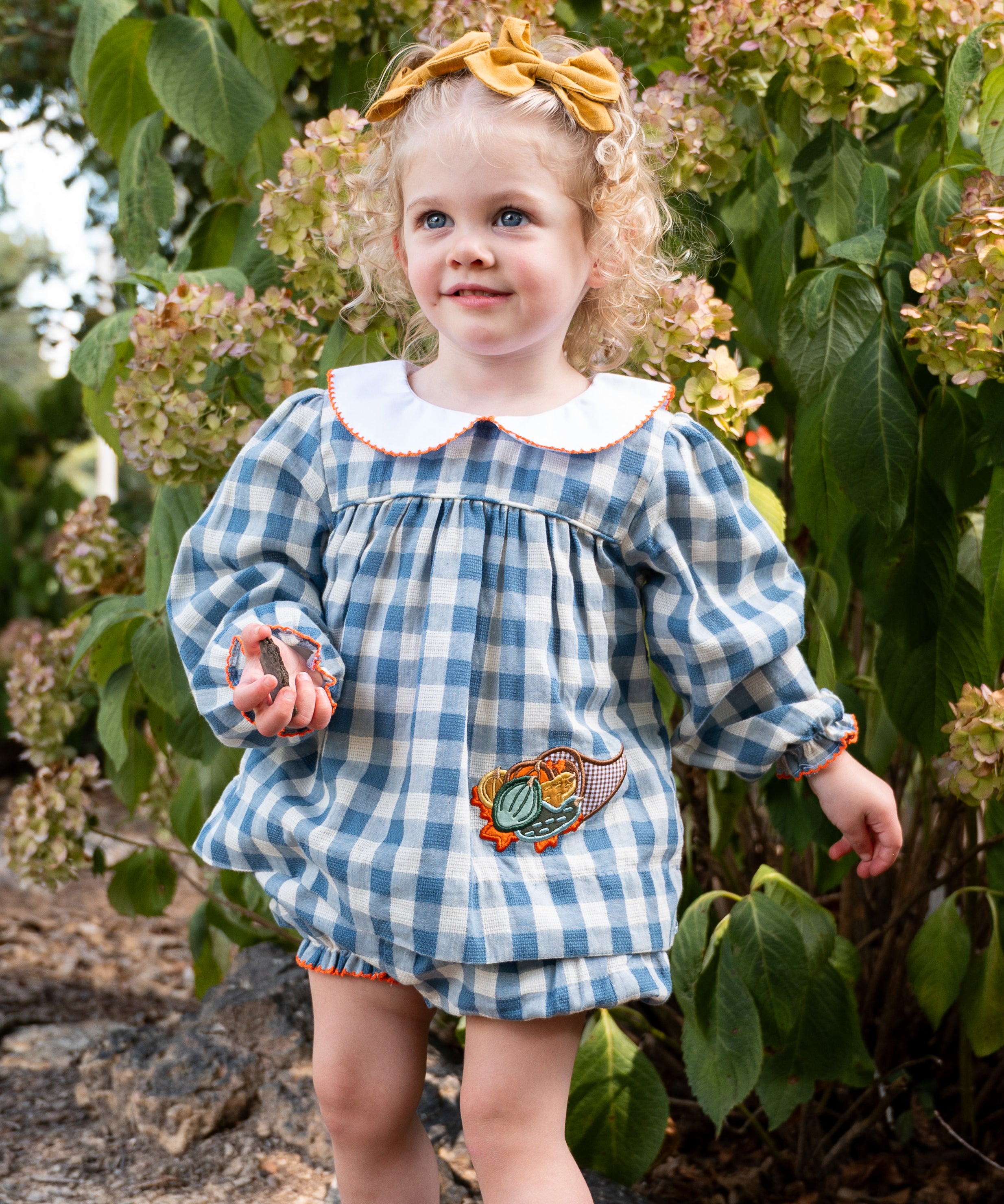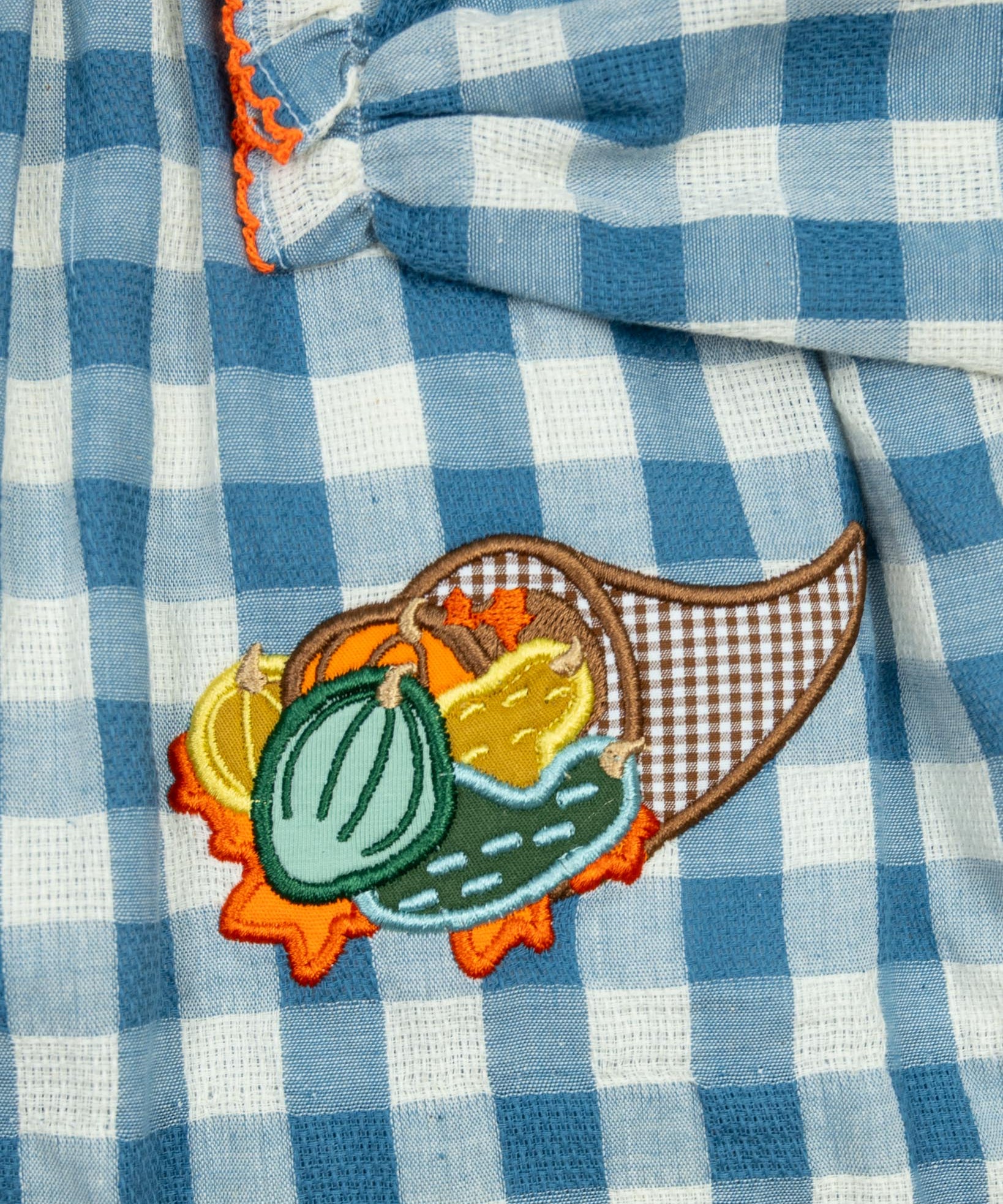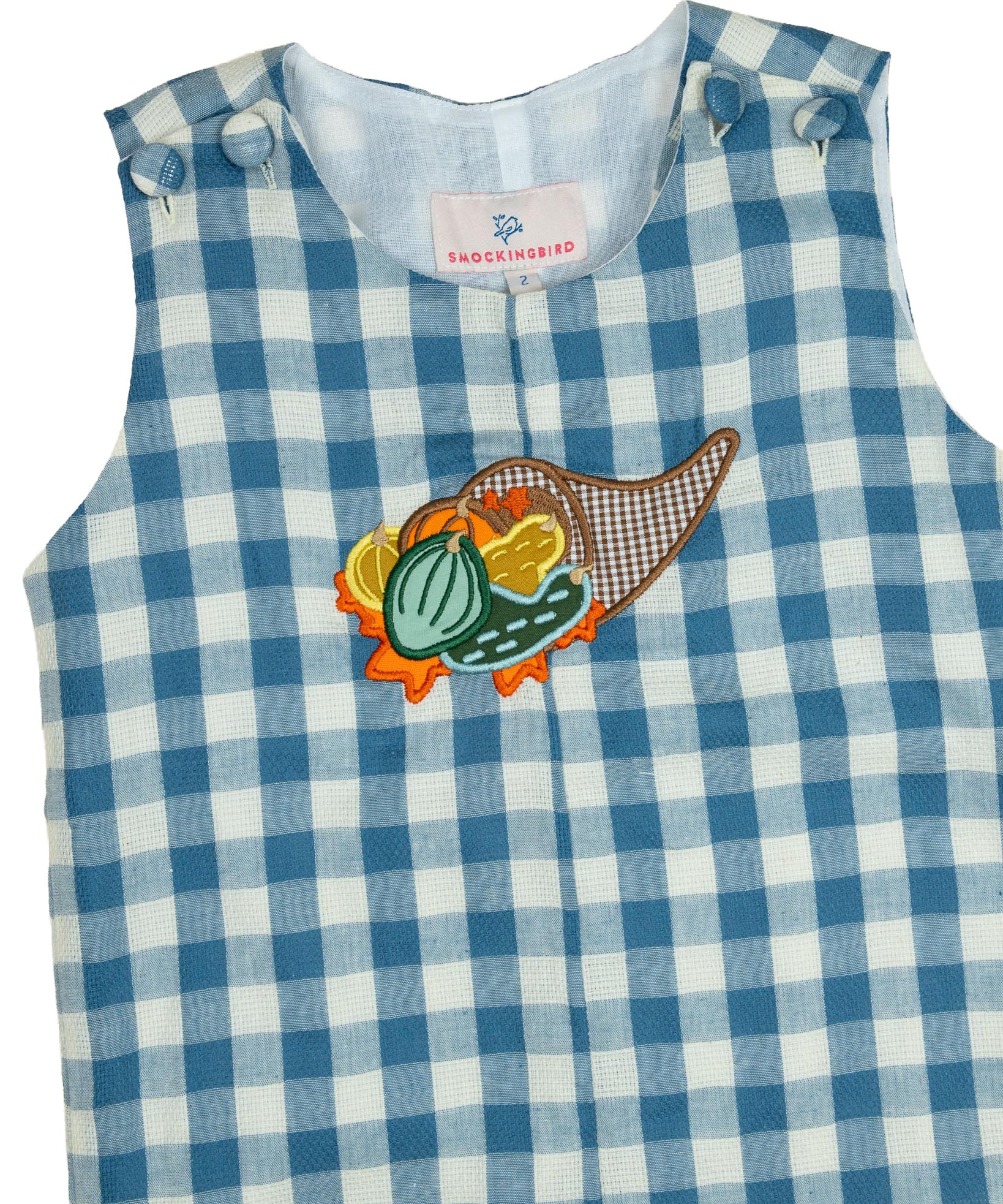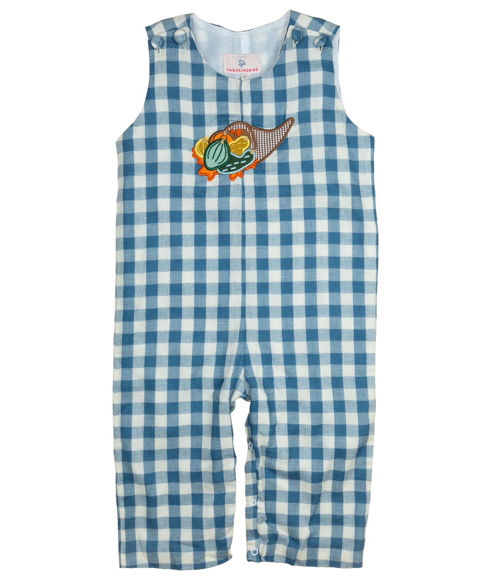 Dress your little guy in autumn charm with our Golden Harvest Applique Longall. Made in classic gingham and featuring an embroidered cornucopia, this soft and comfy one-piece is perfect for seasonal festivities. Pair it with a long sleeve shirt for an extra cozy, polished fall look.