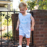 This Jack-O-Lantern Applique Gingham Shortall is a must-have for your little guy’s spooky season wardrobe! Made from classic blue gingham with a cheerful pumpkin face appliqué, this one-piece is great for Halloween fun and fall outings. Personalize it with his name for extra charm.