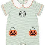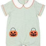 Celebrate Halloween in style with the Jack O' Lantern Applique Pocket Shortall! Featuring playful pumpkin appliqués, soft knit fabric, and an easy-to-wear design, this shortall is perfect for all of your little one’s autumn adventures. Cozy, cute, and full of festive fun!
