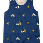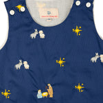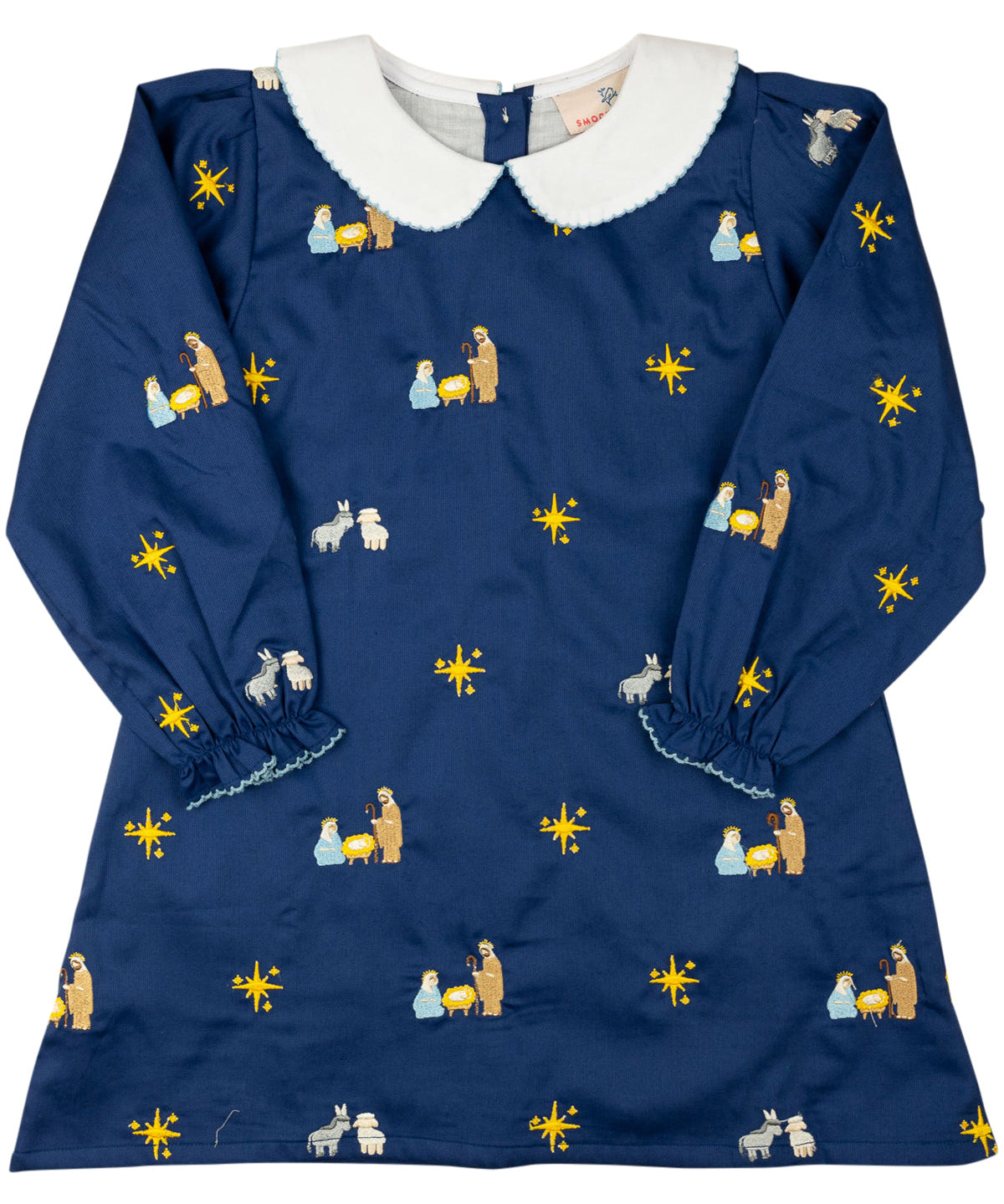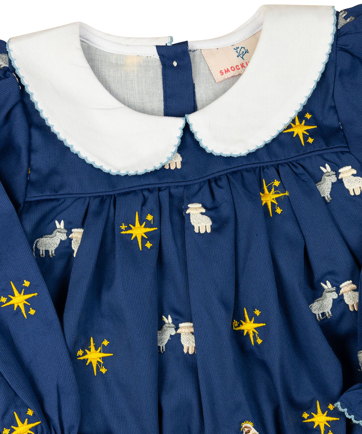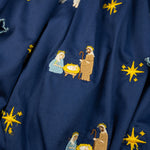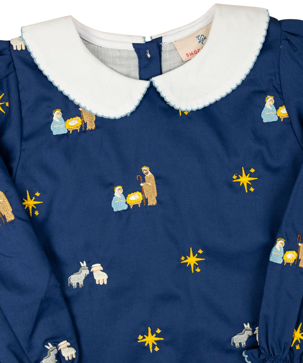 Dress your little one in timeless holiday charm with our Nativity Embroidered Navy Shortall. Designed with classic embroidered Nativity motifs, this shortall is both comfortable and stylish. Metal snaps in stride.