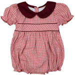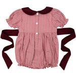Classic charm meets timeless elegance in our Pink and Maroon Tartan Bubble. Featuring a dark pink tartan print, puffed sleeves, and a rich maroon peter pan collar, this one-piece is perfect for your little darling’s special occasions. The ribbon tie adds a regal touch and perfect fit. A must-have for picture-perfect moments!