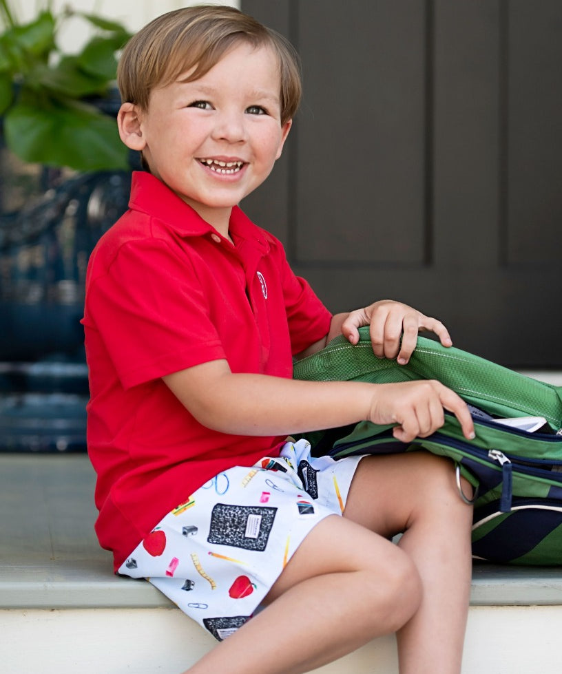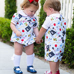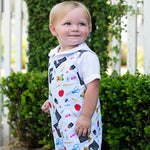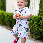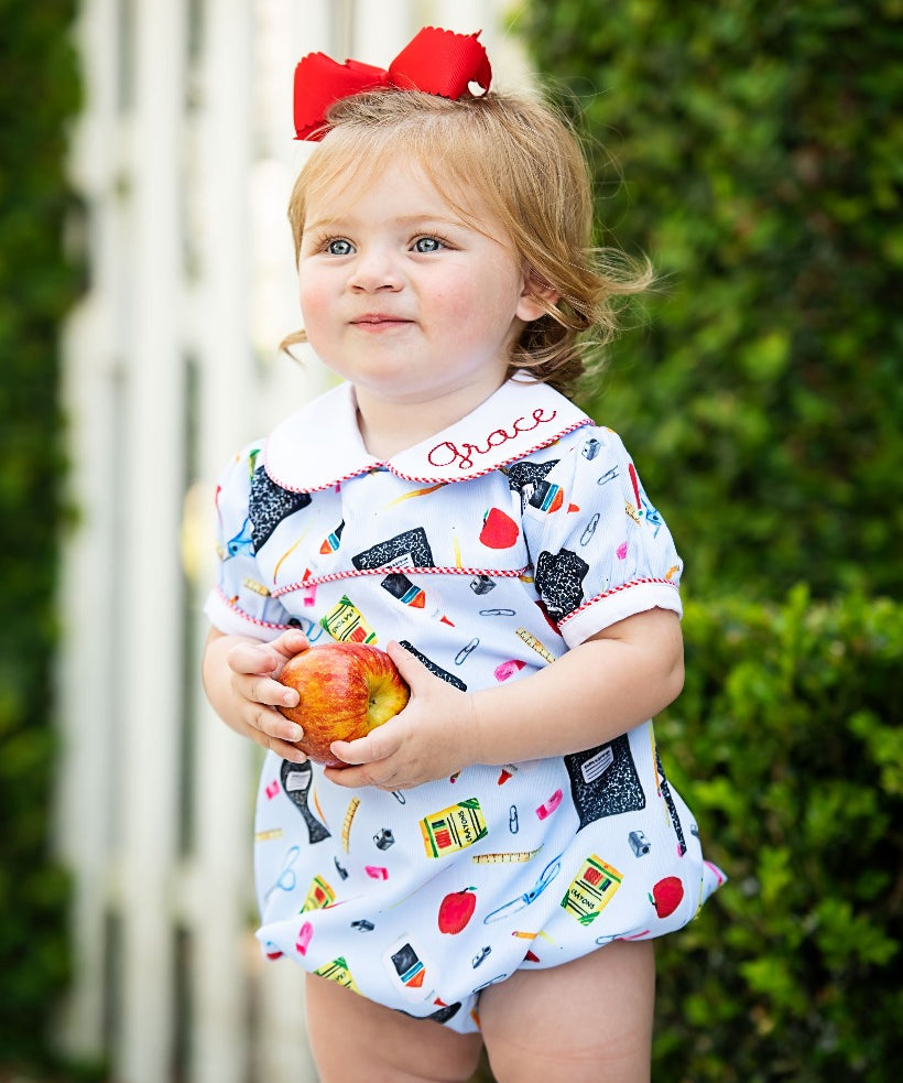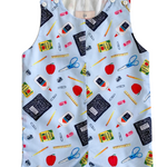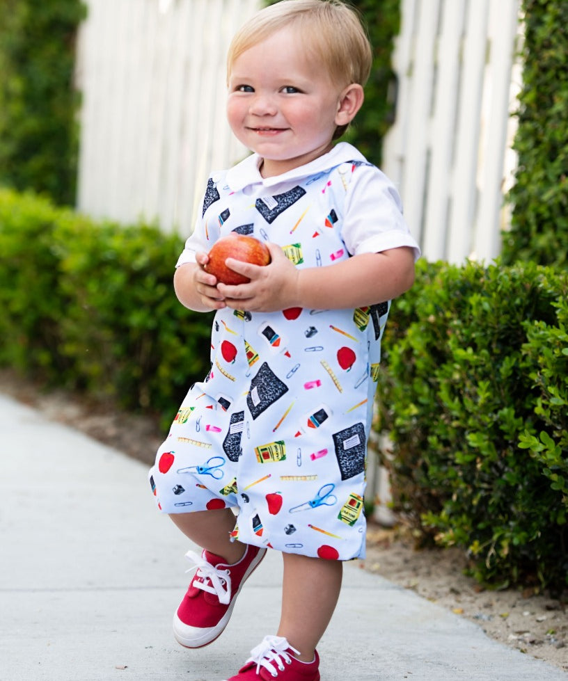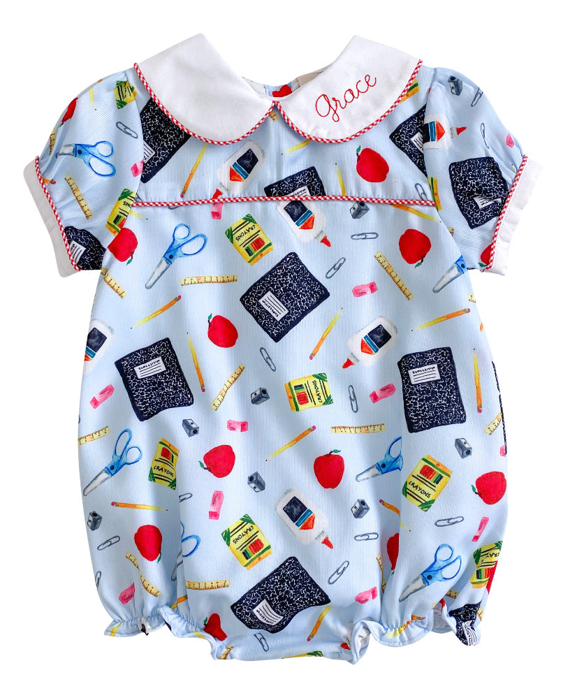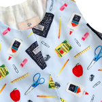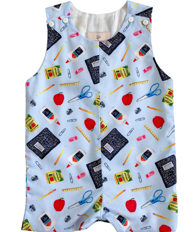 School is back in session and we have all your favorite school supplies on this adorable shortall. This custom school supplies printed shortall has two mother of pearl buttons on each strap. The shortall is fully lined and has metal snaps in stride for easy changing.