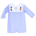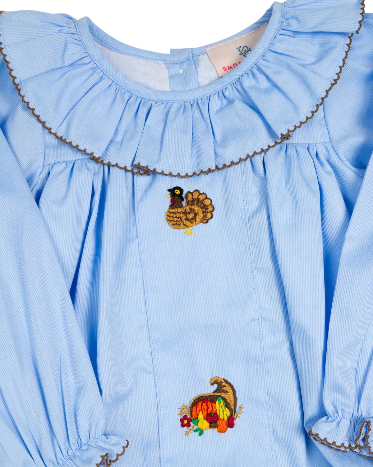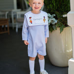 Dress him up for the season in this timeless Thanksgiving Embroidered Longall. Designed in a soft blue fabric with sweet white trim, this piece features festive embroidery across the chest, capturing the charm of fall gatherings. The classic longall silhouette is perfect for little boys on the move—comfortable enough for play, polished enough for holiday dinners. Add his name for a personalized touch that makes it extra special.