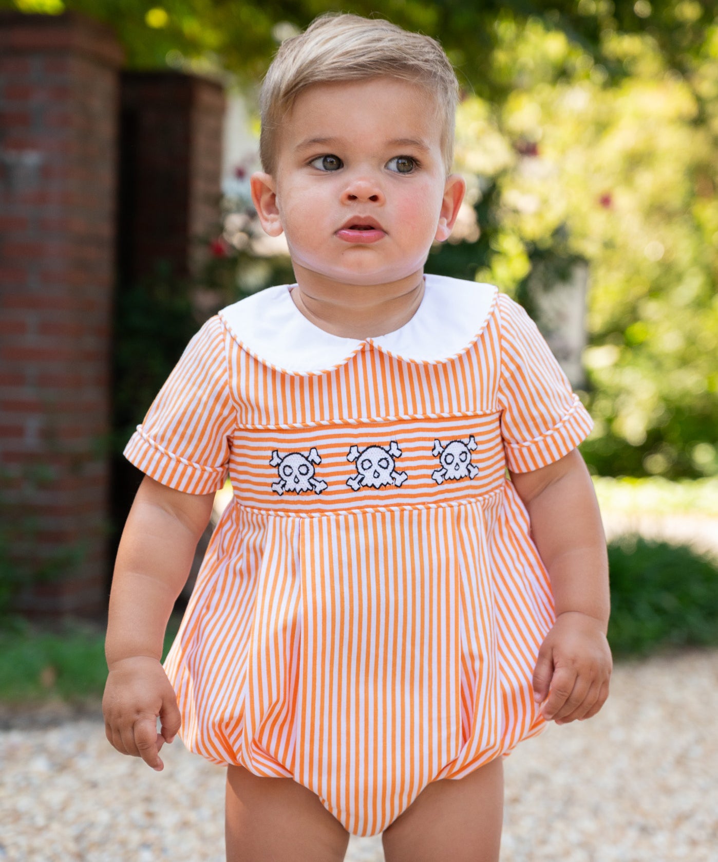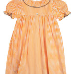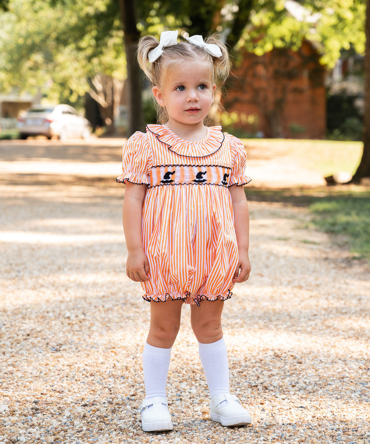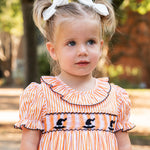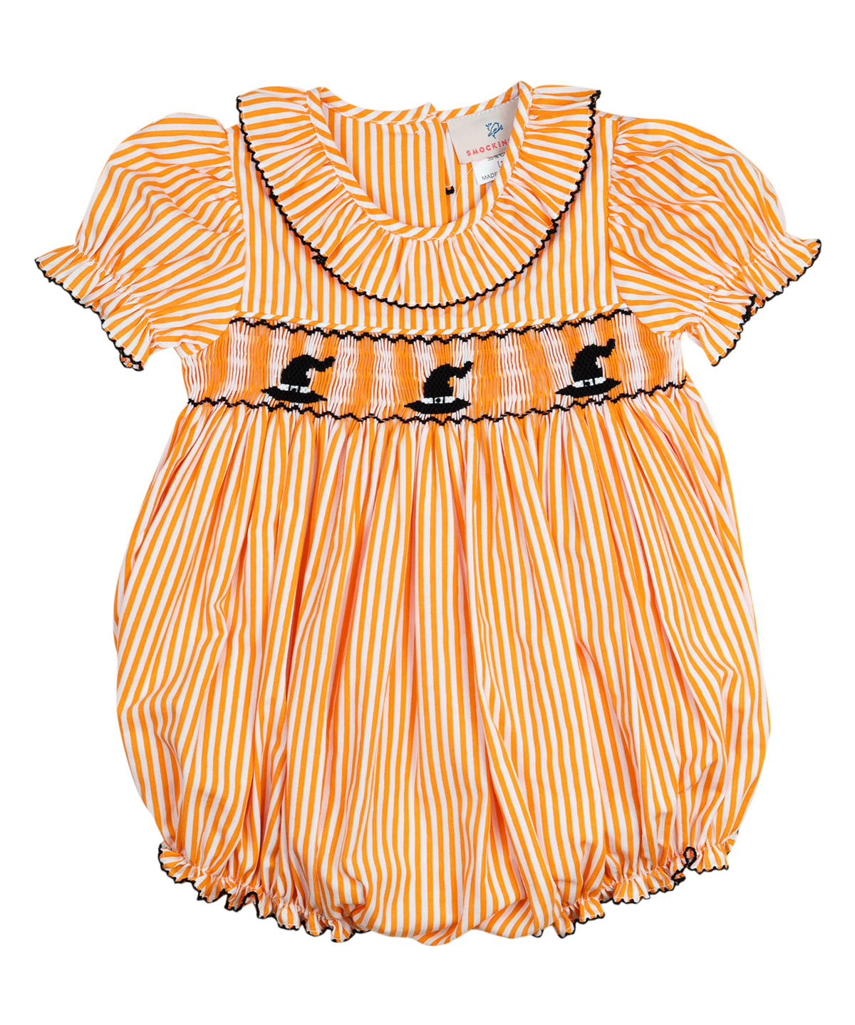 Add some Halloween magic to your little girl’s wardrobe with the Witch Hats Smocked Bishop Dress! Featuring hand-smocked witch hats and stars, this charming dress is made in a soft pumpkin-orange shade with puff sleeves—perfect for Halloween parties or trick-or-treating!