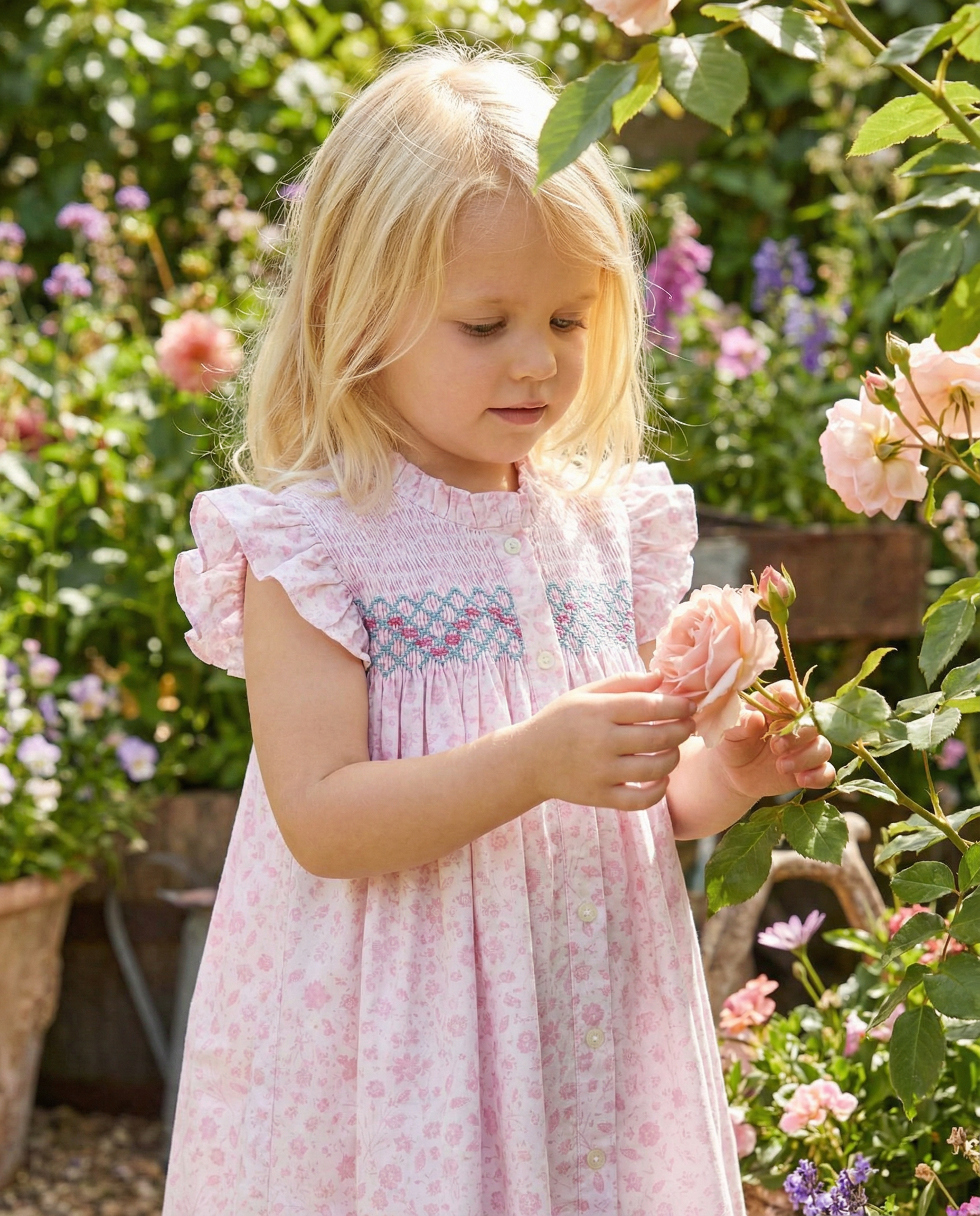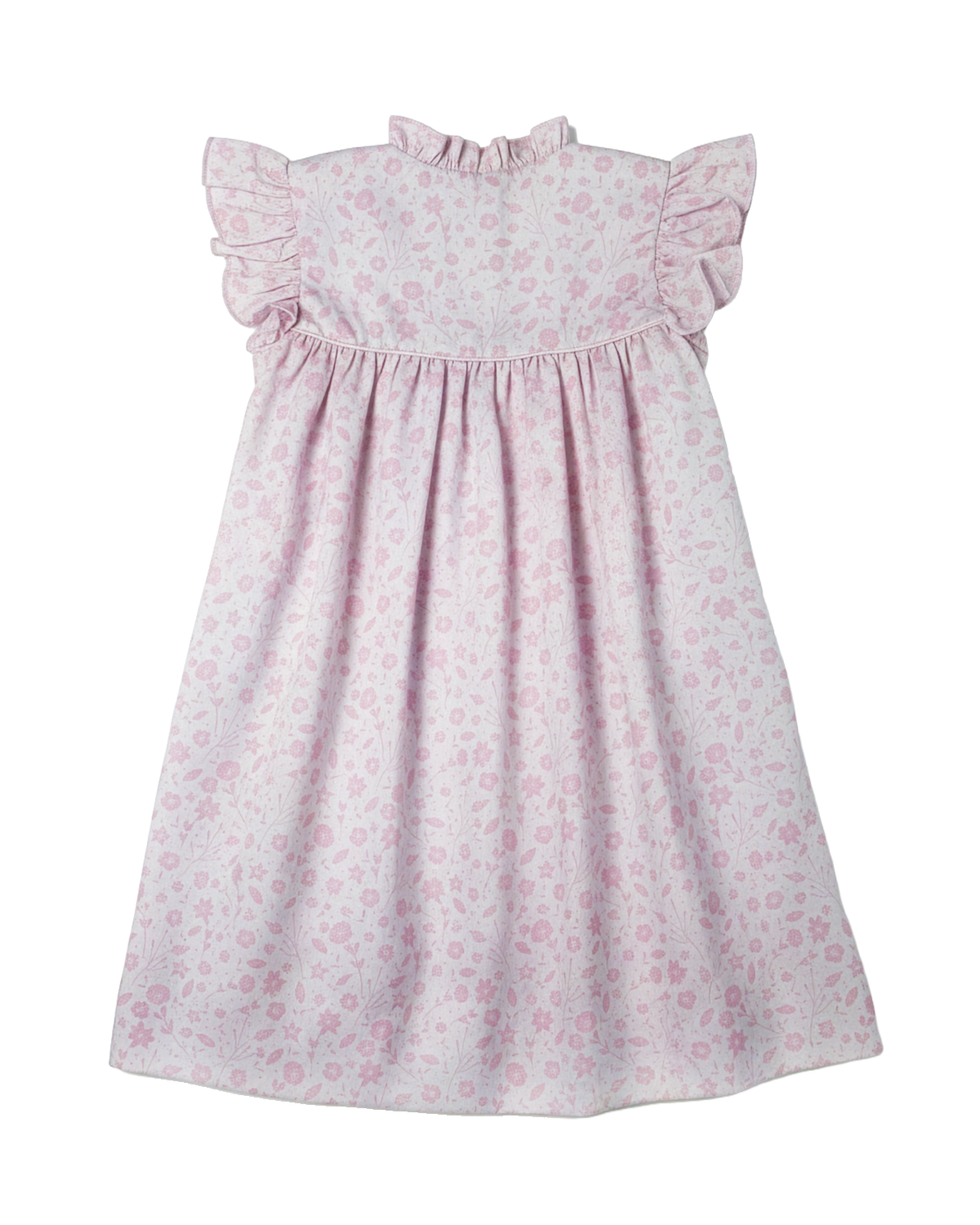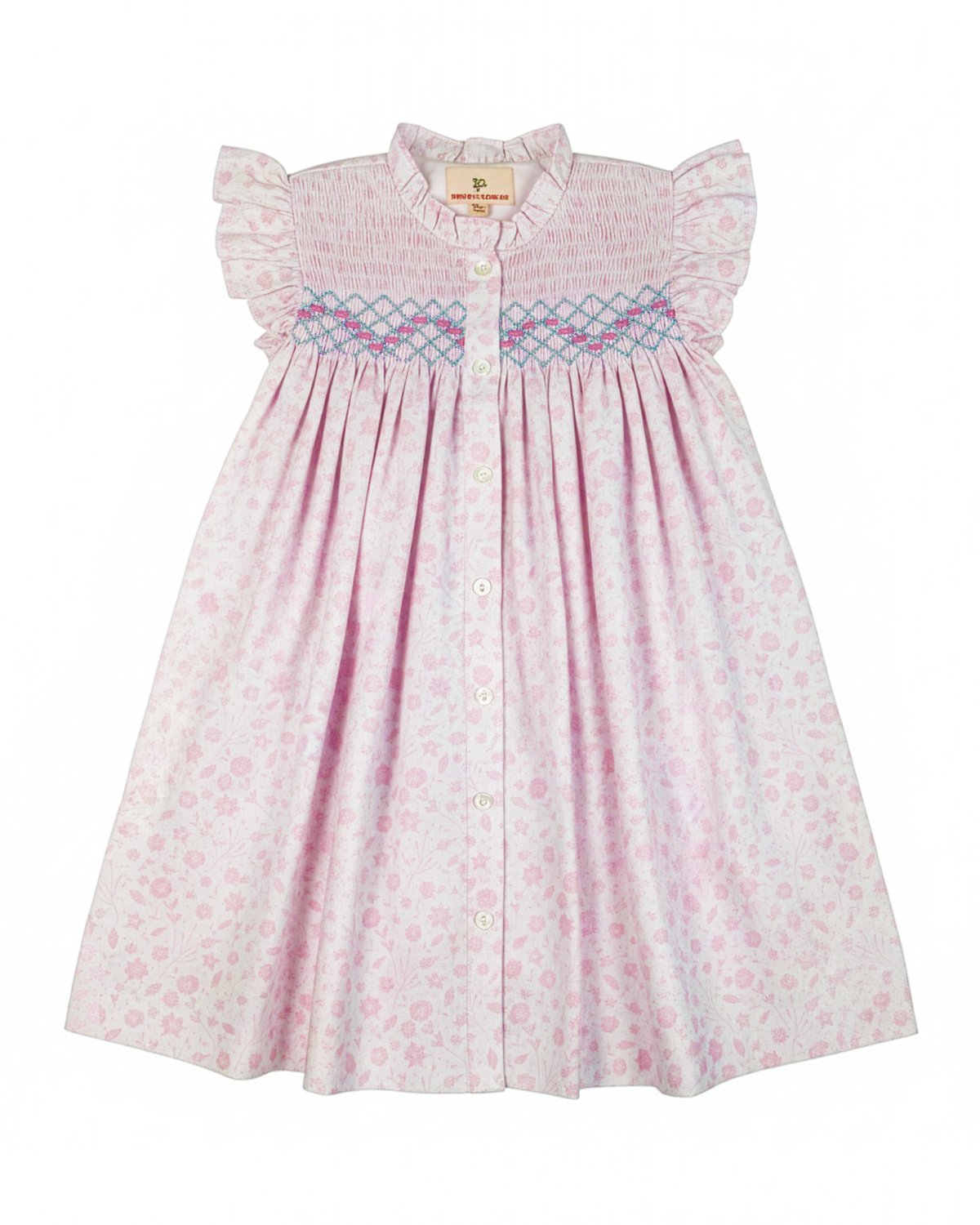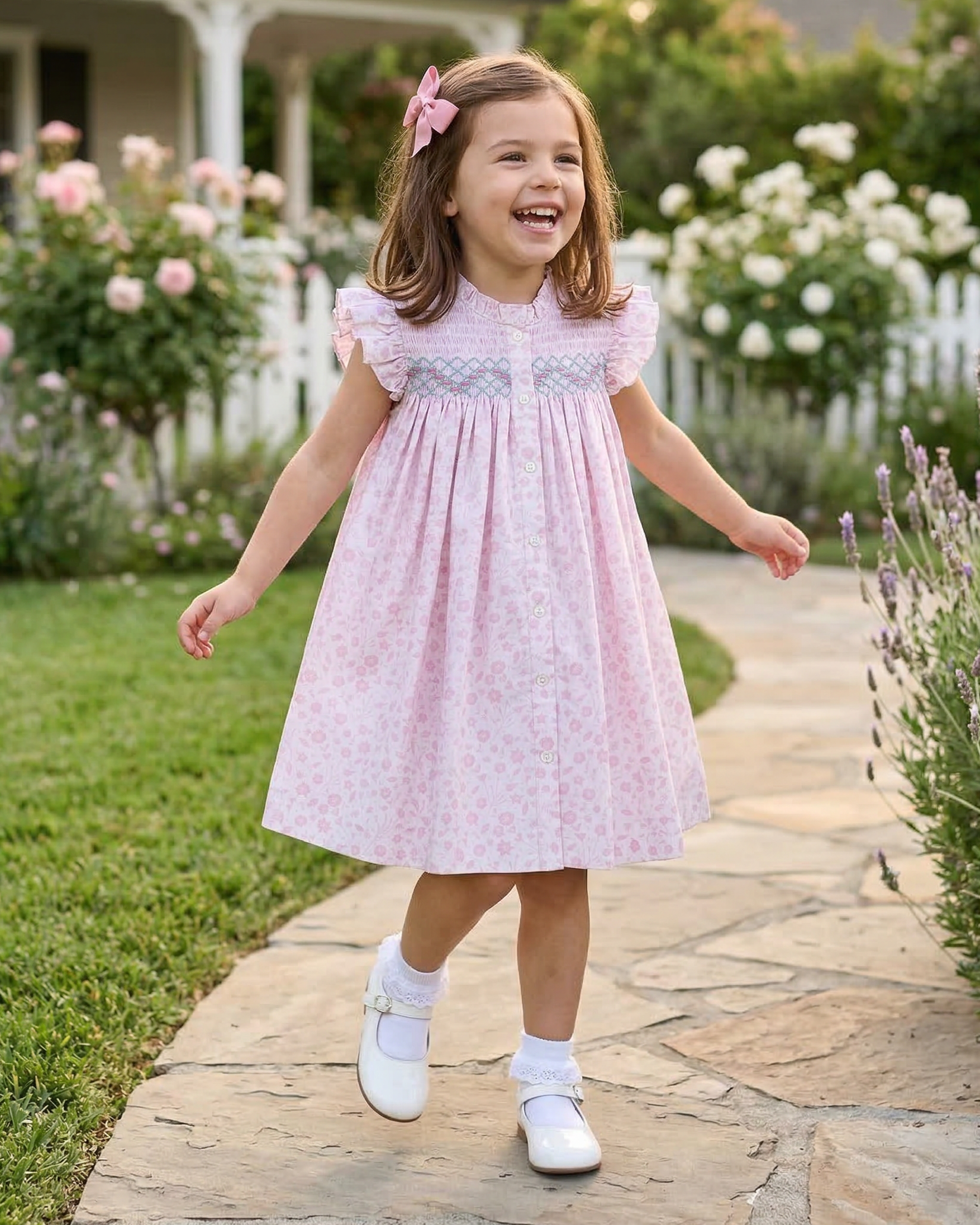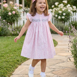 This elegant floral dress features detailed smocking across the bodice and soft angel sleeves for a timeless look. The gathered skirt adds fullness while maintaining comfort. Crafted for easy wear during warm spring days. A stunning Easter dress for church, celebrations, and seasonal portraits.