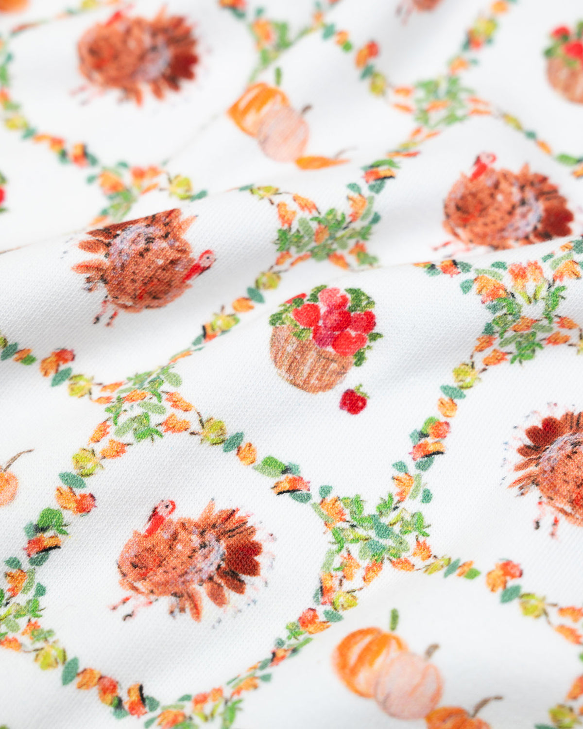 Get cozy in festive fall fashion! The Turkey Time Tartan Pajama Set features a playful turkey grid print with contrast cuffs and pocket details, making it a must-have for Thanksgiving morning traditions. Soft, breathable fabric ensures all-night comfort, whether for snuggles, stories, or a post-feast nap!