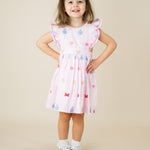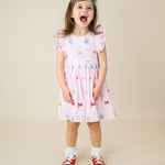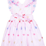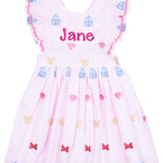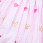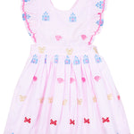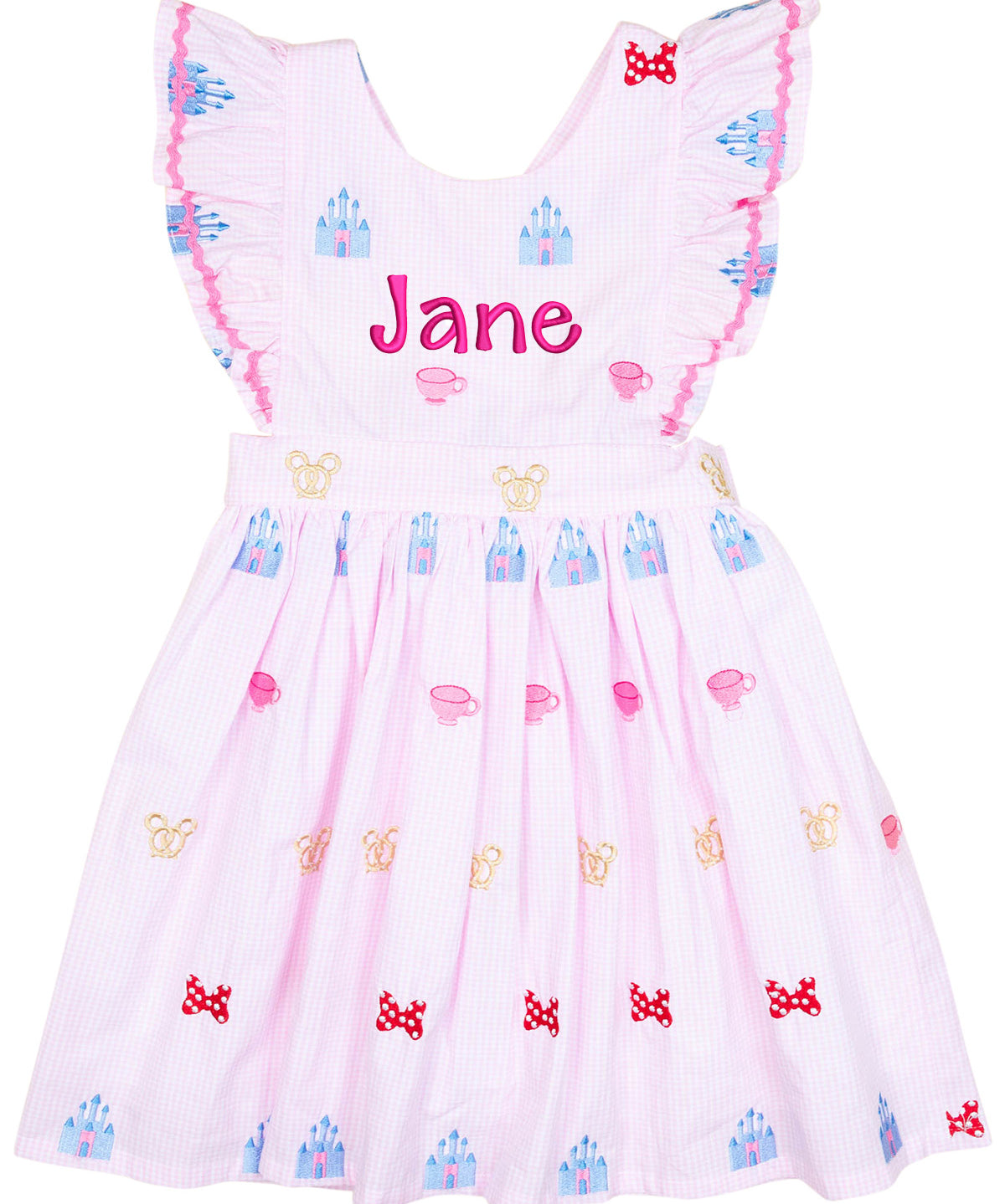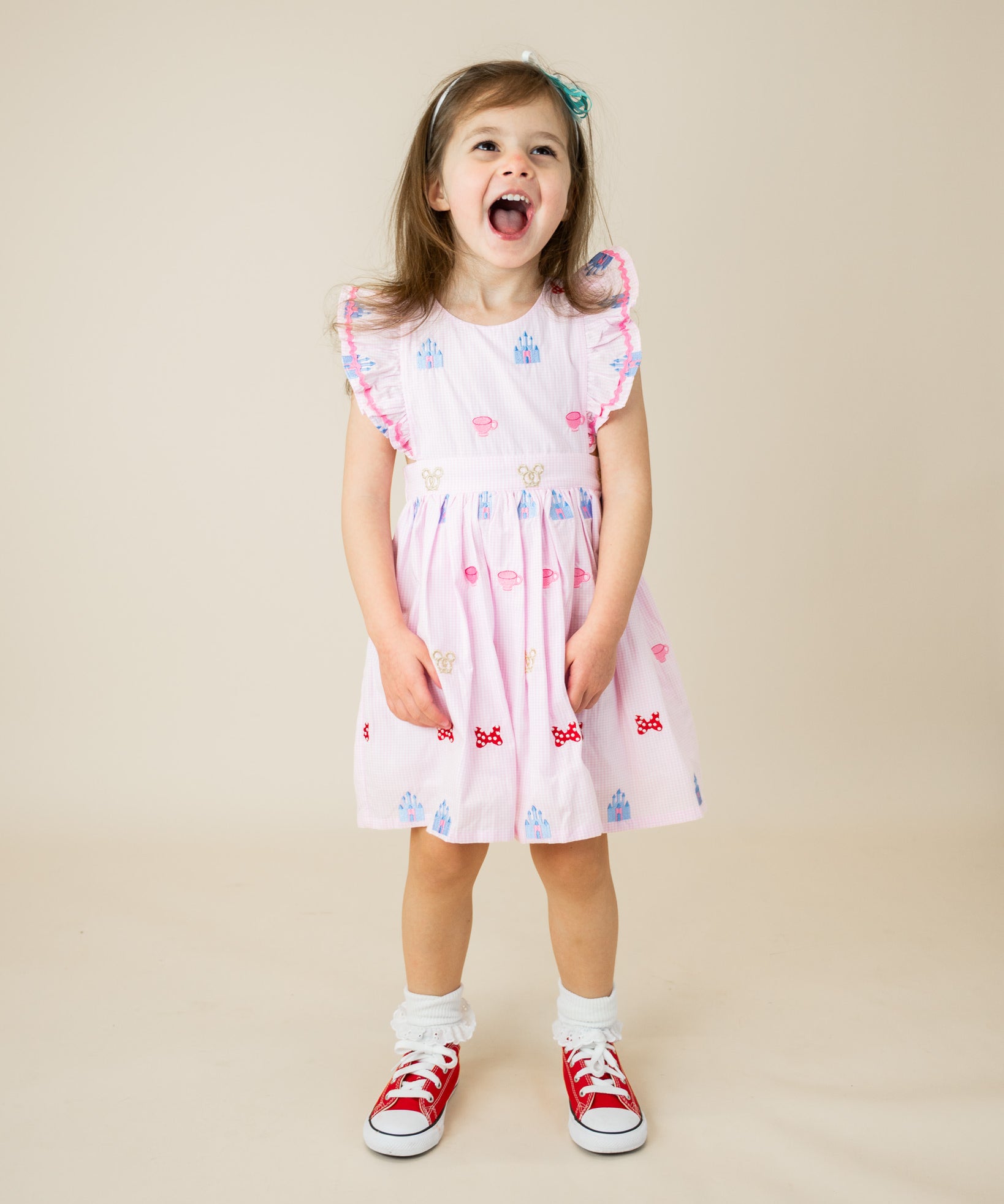 Let the magic of the parks come to life in this embroidered girls dress. This dress feature some mouse favorites throughout and is the perfect outfit for a trip to Disney!
