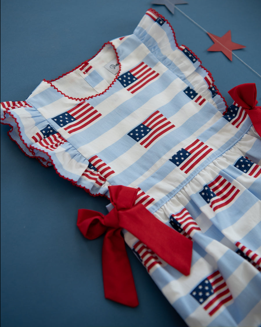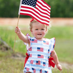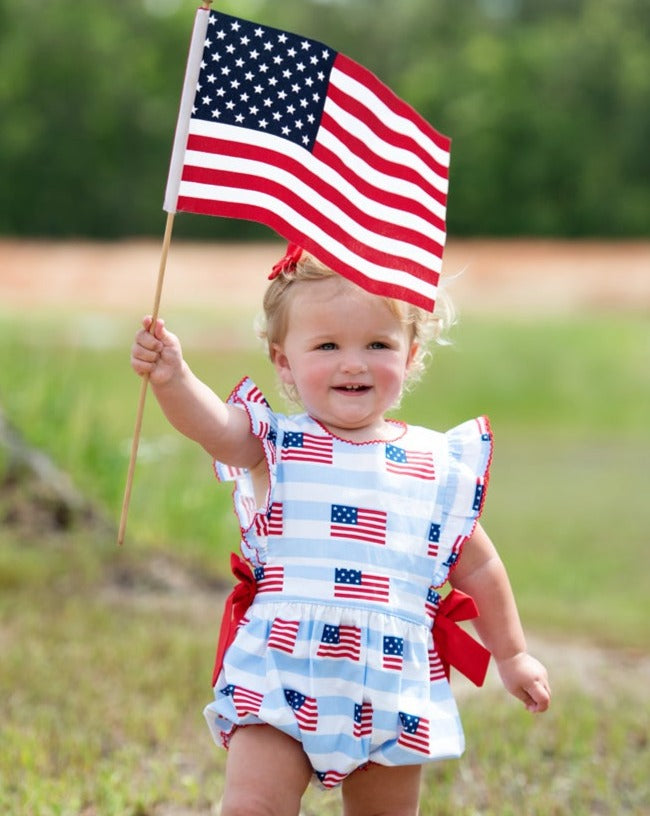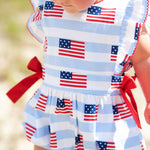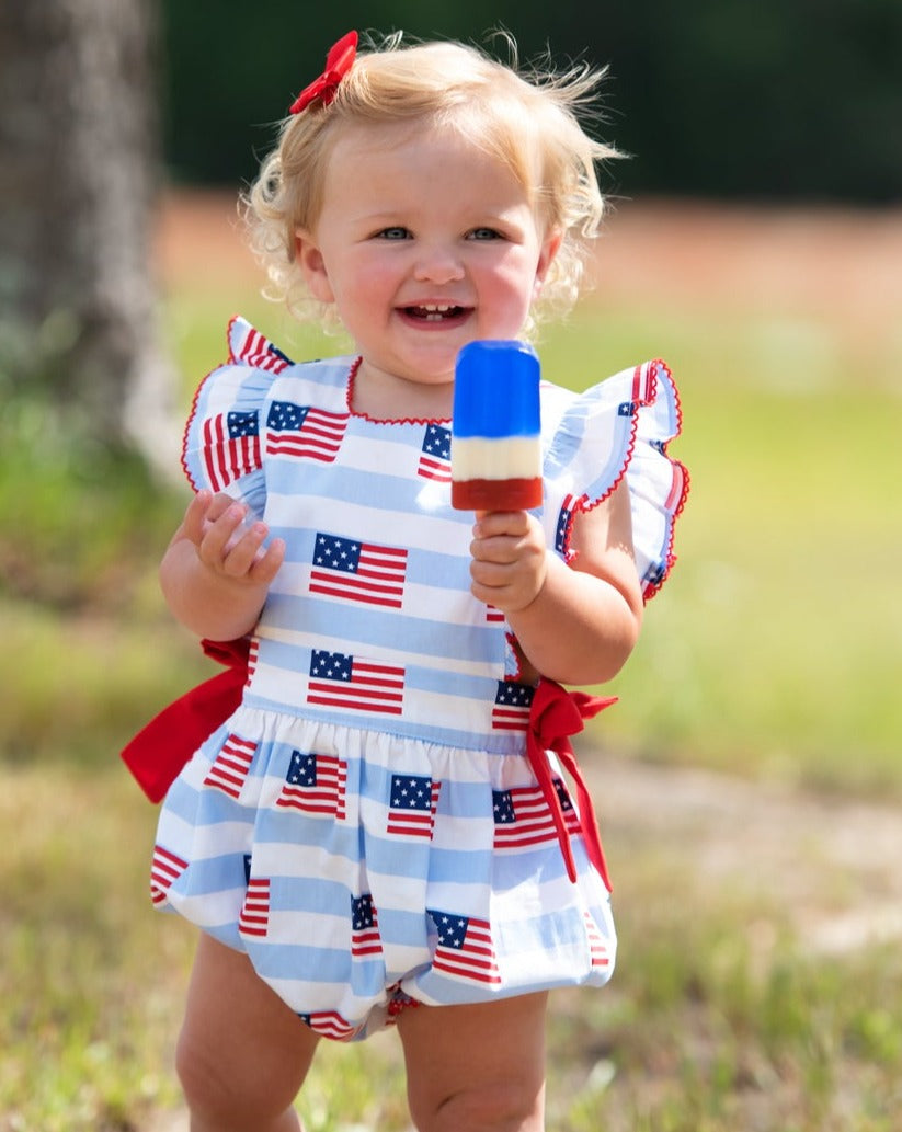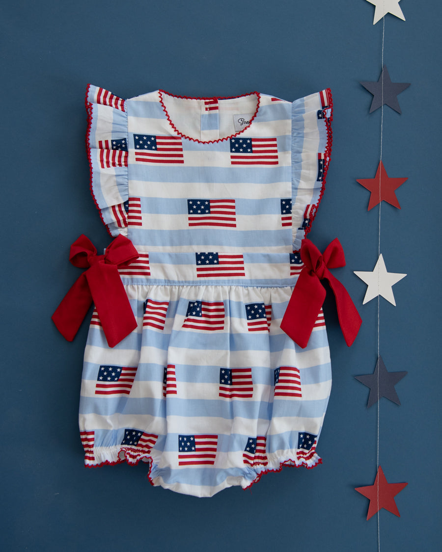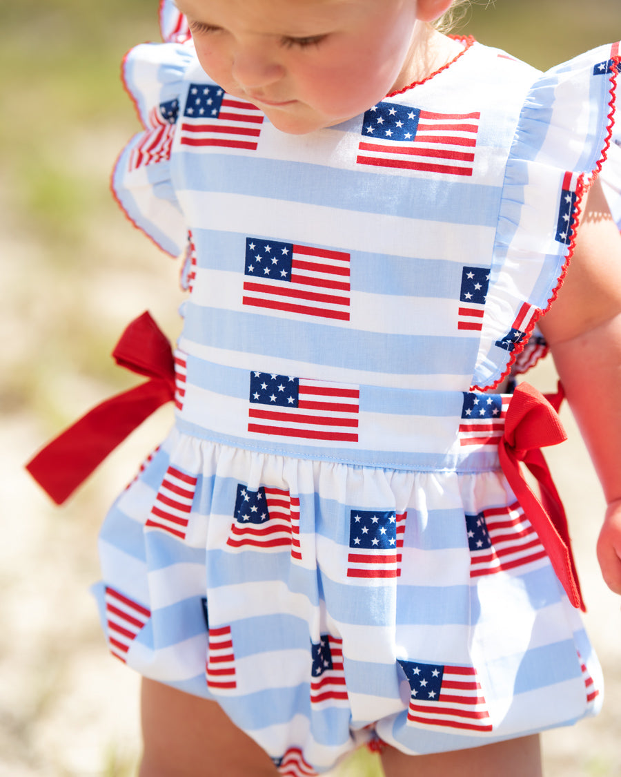 This cute American flag print bubble will be perfect for all your patriotic activities and summer fun. Details include angel sleeves with red picot trim and side bows. Metal snaps in stride. 100% cotton