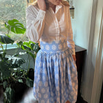 Elevate your spring wardrobe with Chinoiserie Egg Midi Skirt for Women. This high waisted skirt is flattering on all body types. Print is a classic blue and white chinoiserie and has mommy and me matching outfits that coordinate. Skirt has a size zipper