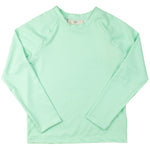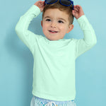 Our rash guard long sleeve in sherbert green provides excellent protection and warmth. This water wear is made of compact knitted fabric that guards your child from the sun's rays, the cold, and scratching. UPF50+. Add a name in vintage cursive, or a monogram for a personal touch