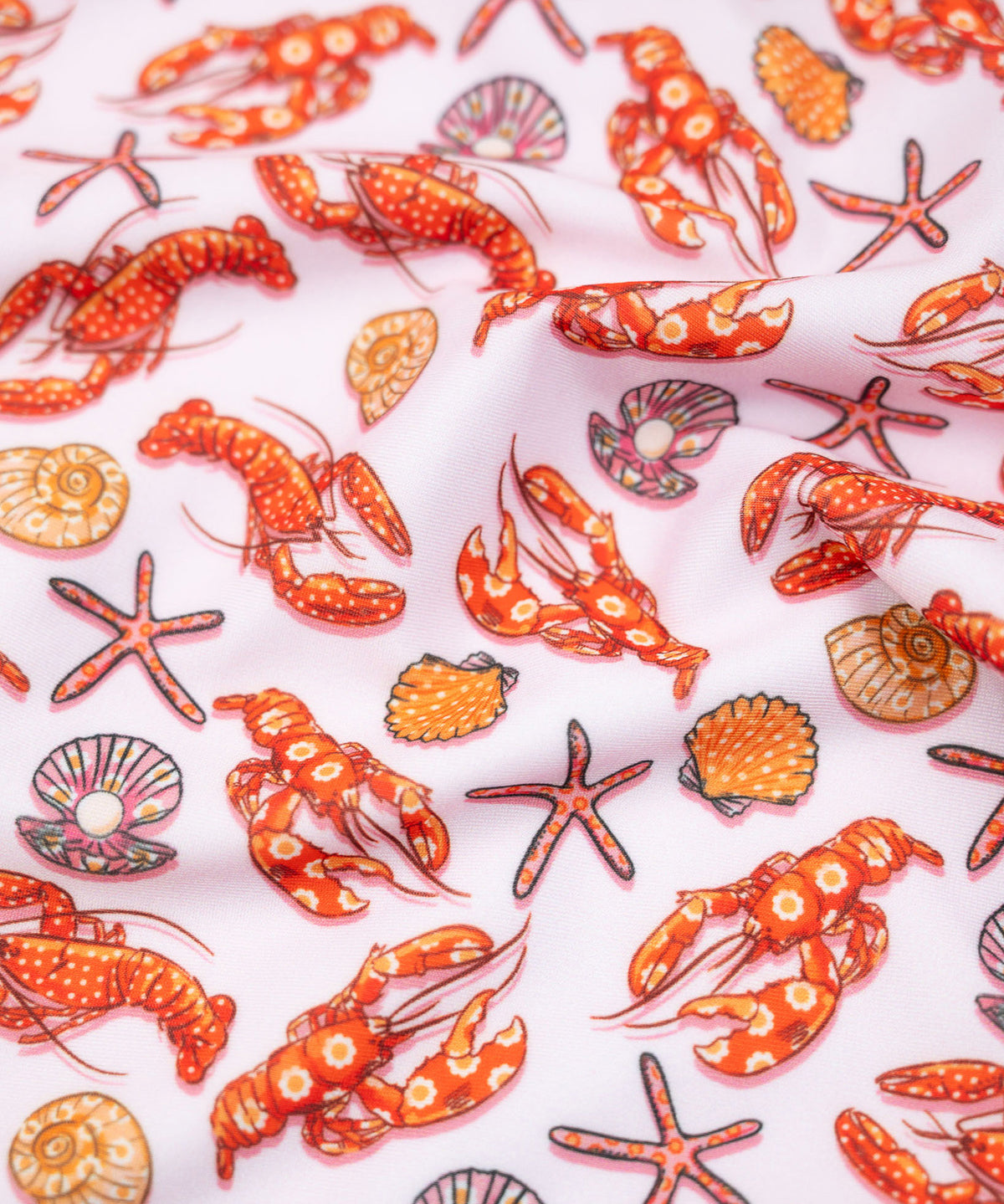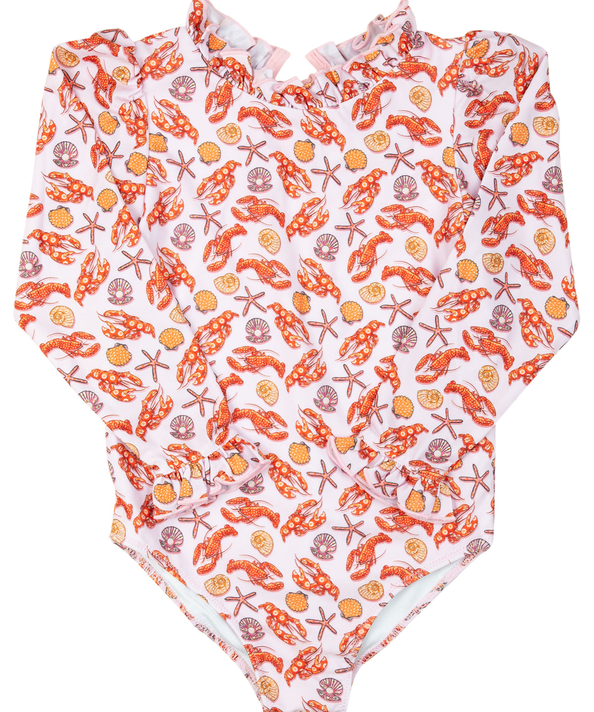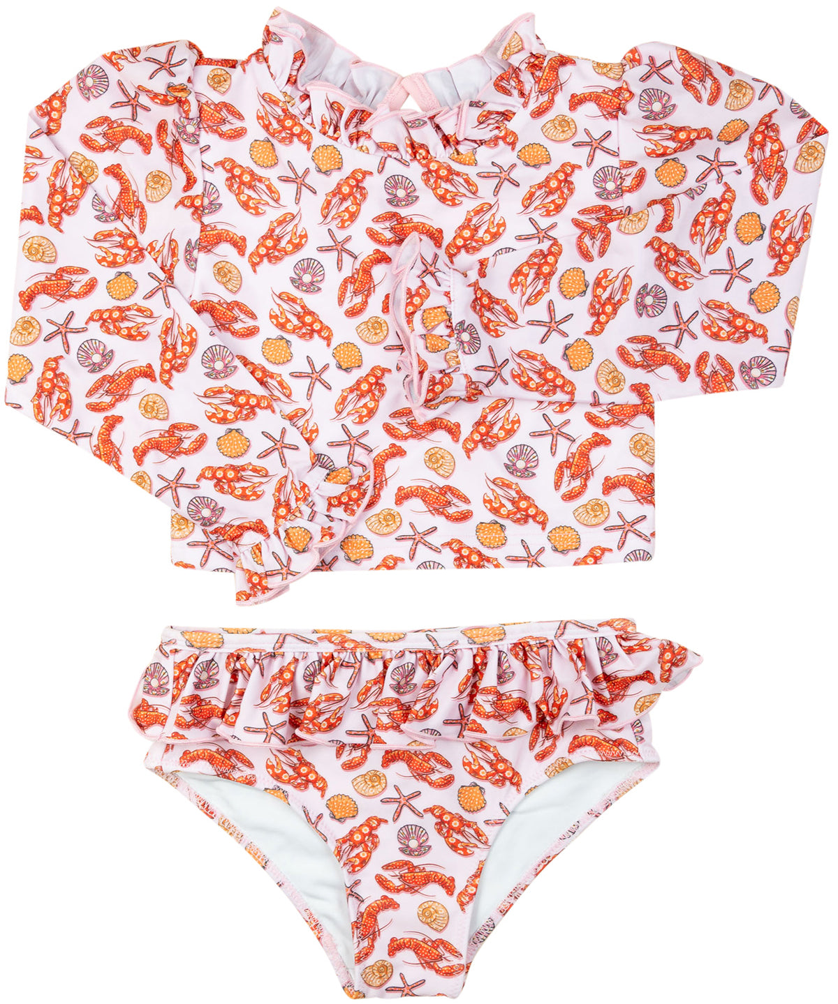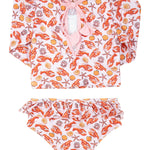 Make waves with our Red as a Lobster Long Sleeve Bikini, a chic swimsuit set perfect for sunny adventures! This two-piece bikini features a classic red, white, and pink palette with a lobster and shell pattern that celebrates Americana charm. Designer details include a long-sleeve rash guard top for extra sun protection, paired with matching bottoms for a flattering and secure fit. Whether at the beach or poolside, this stylish bikini ensures your little one makes a splash in comfort and style!