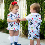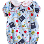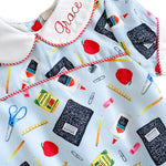 School is back in session and we have all your favorite school supplies on this adorable bubble. Bubble features custom school supplies print with a large rounded peter pan collar, red gingham piping, and short puff sleeves. Buttons in the back with mother of pearl buttons. The bubble is fully lined and has metal snaps in stride for easy changing. Monogram show in vintage cursive font with red thread.
