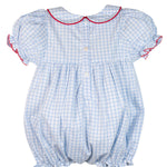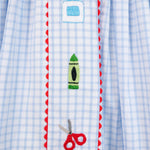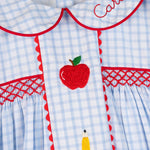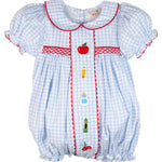 The cutest school supplies ever! This bubble features classroom favorites embroidered down the center, classic red smocking, short puff sleeves and a peter pan collar with red trim. Snaps in the stride for easy changing. Add a name to the collar in vintage cursive for a personal touch!