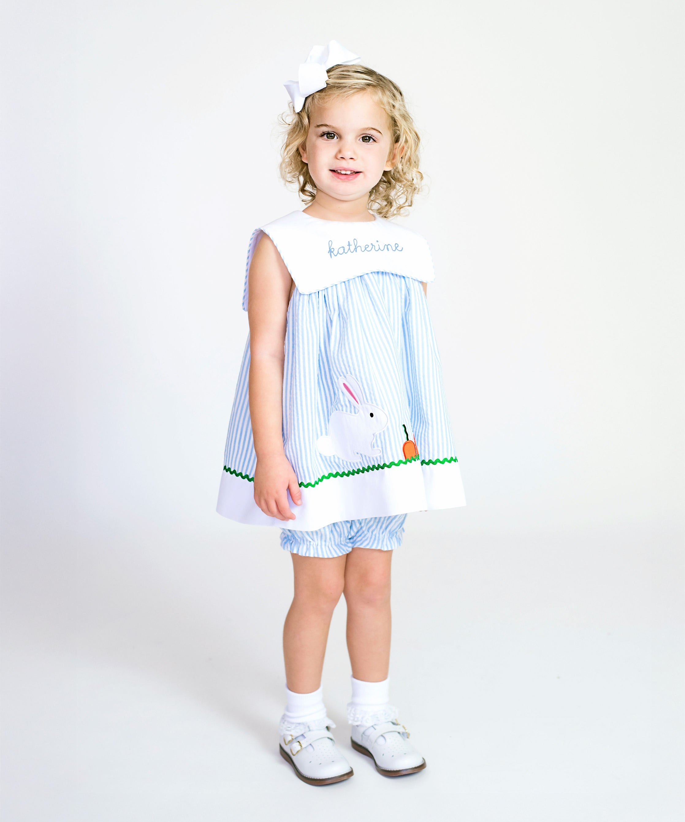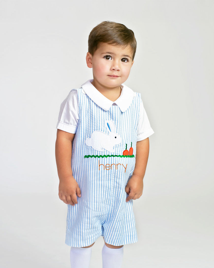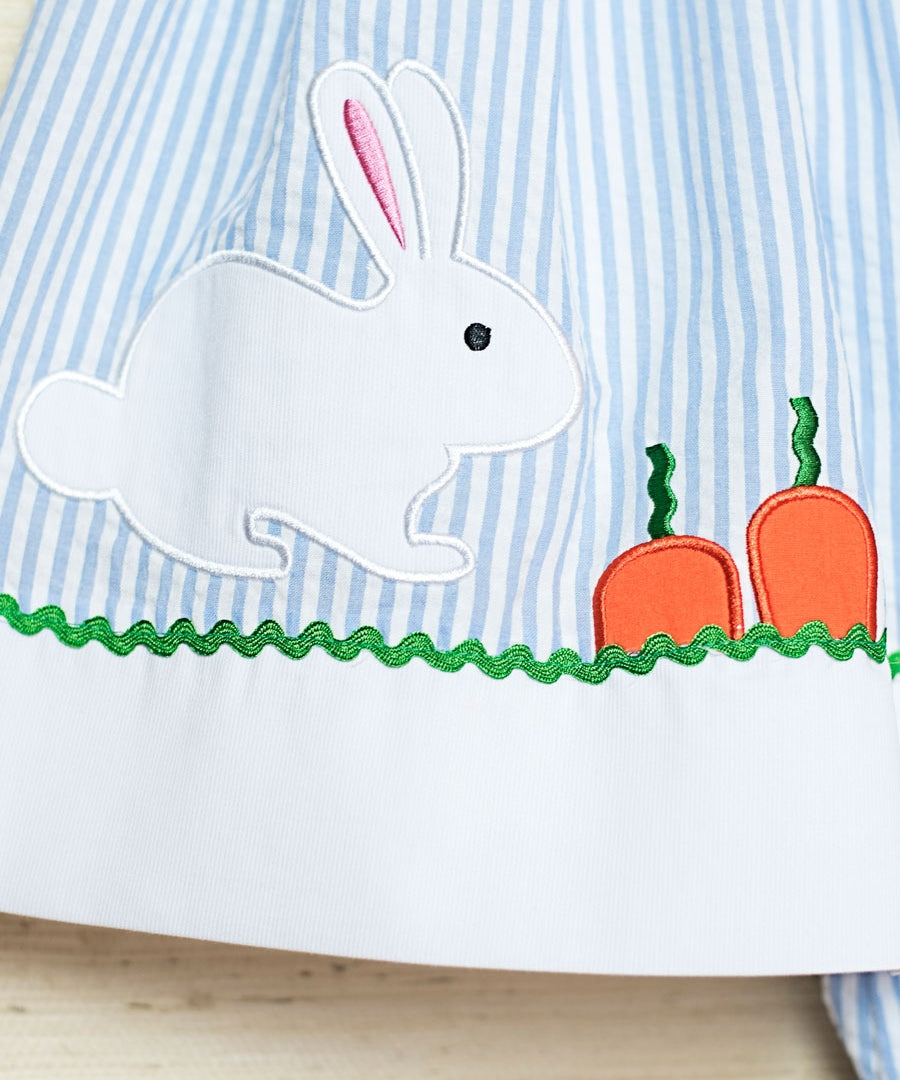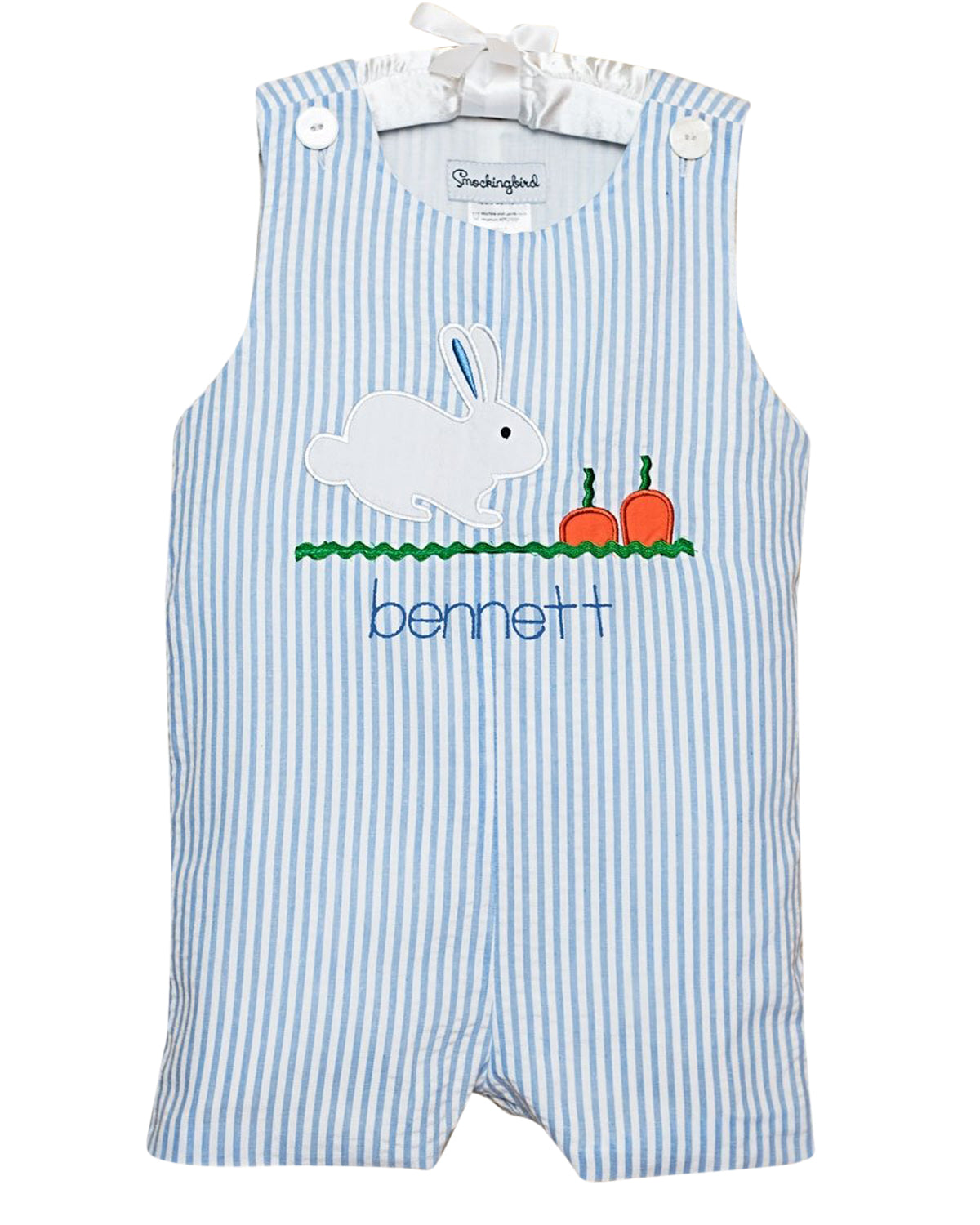 We love this little shortall for Easter! With an applique bunny and carrots on blue seersucker shortall, this Easter favorite is perfect for all your Easter festivities. Metal snaps in stride. Add a name for a personal touch.