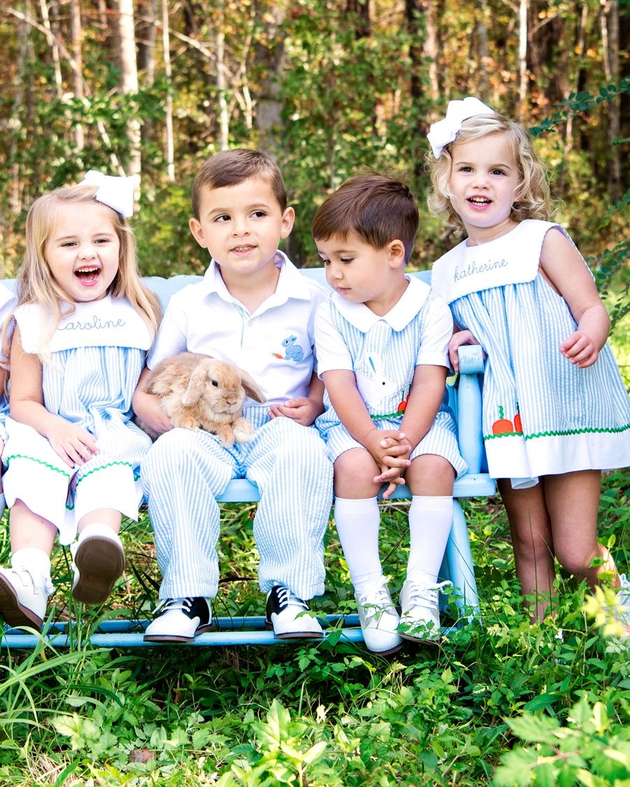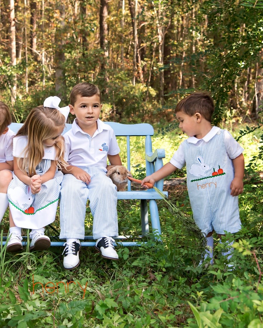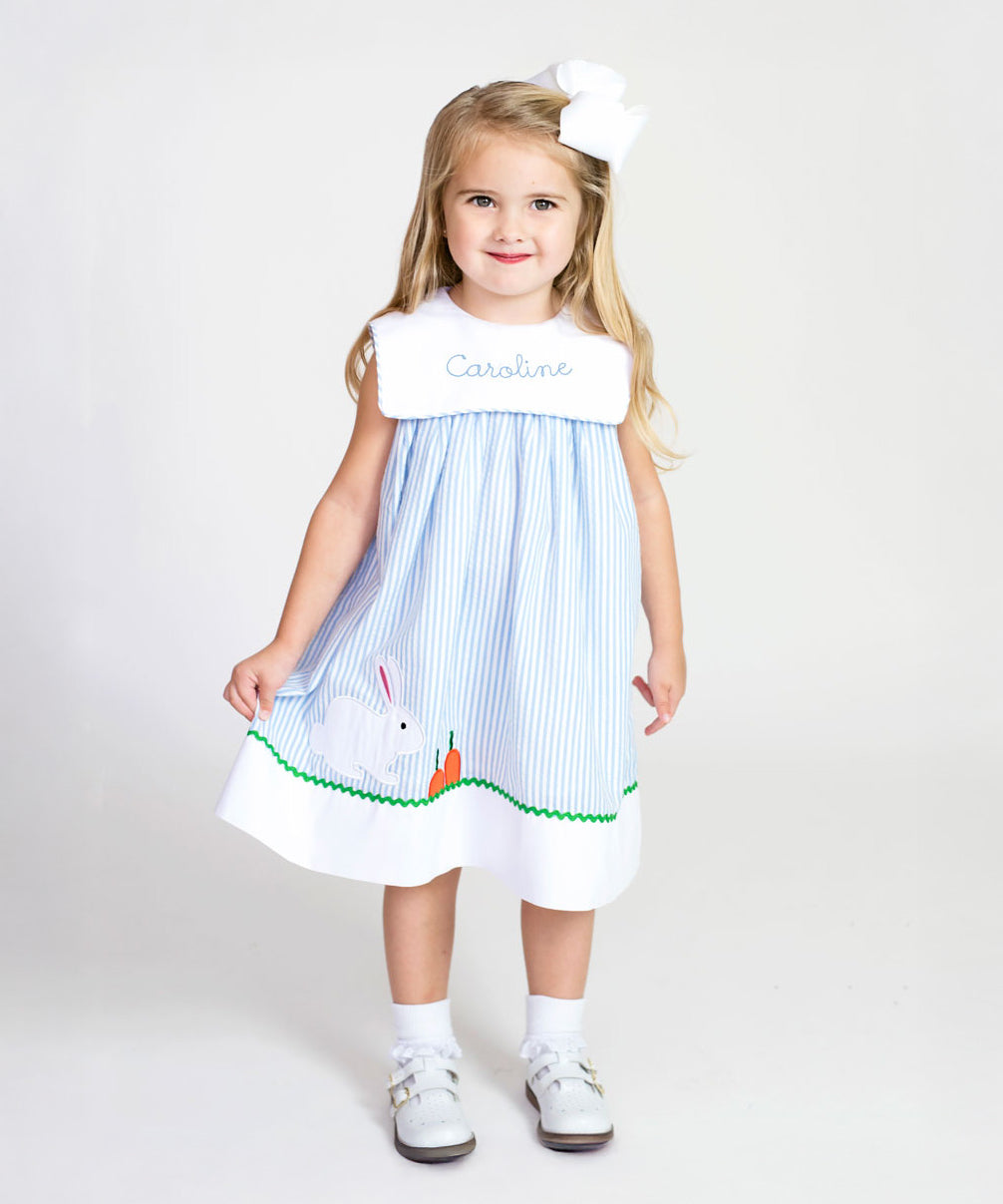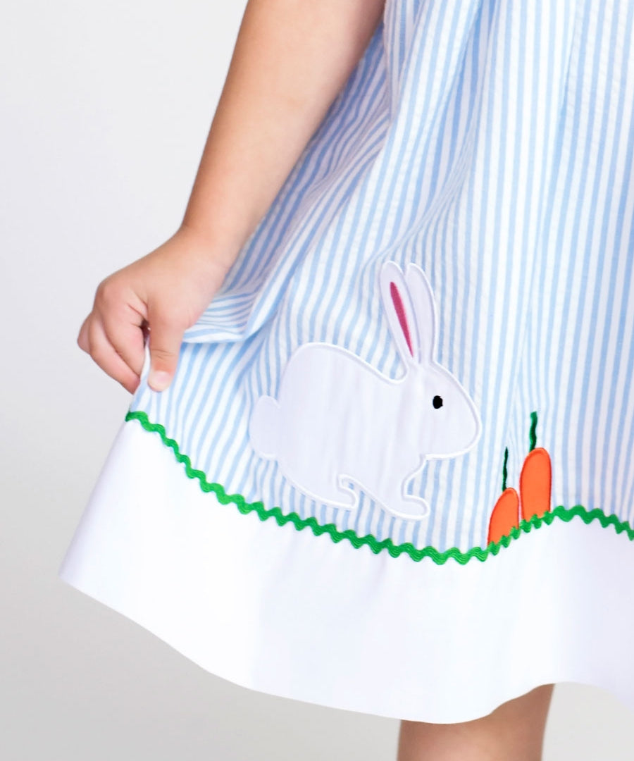 We love this little shortall for Easter! With an applique bunny and carrots on blue seersucker shortall, this Easter favorite is perfect for all your Easter festivities. Metal snaps in stride. Add a name for a personal touch.