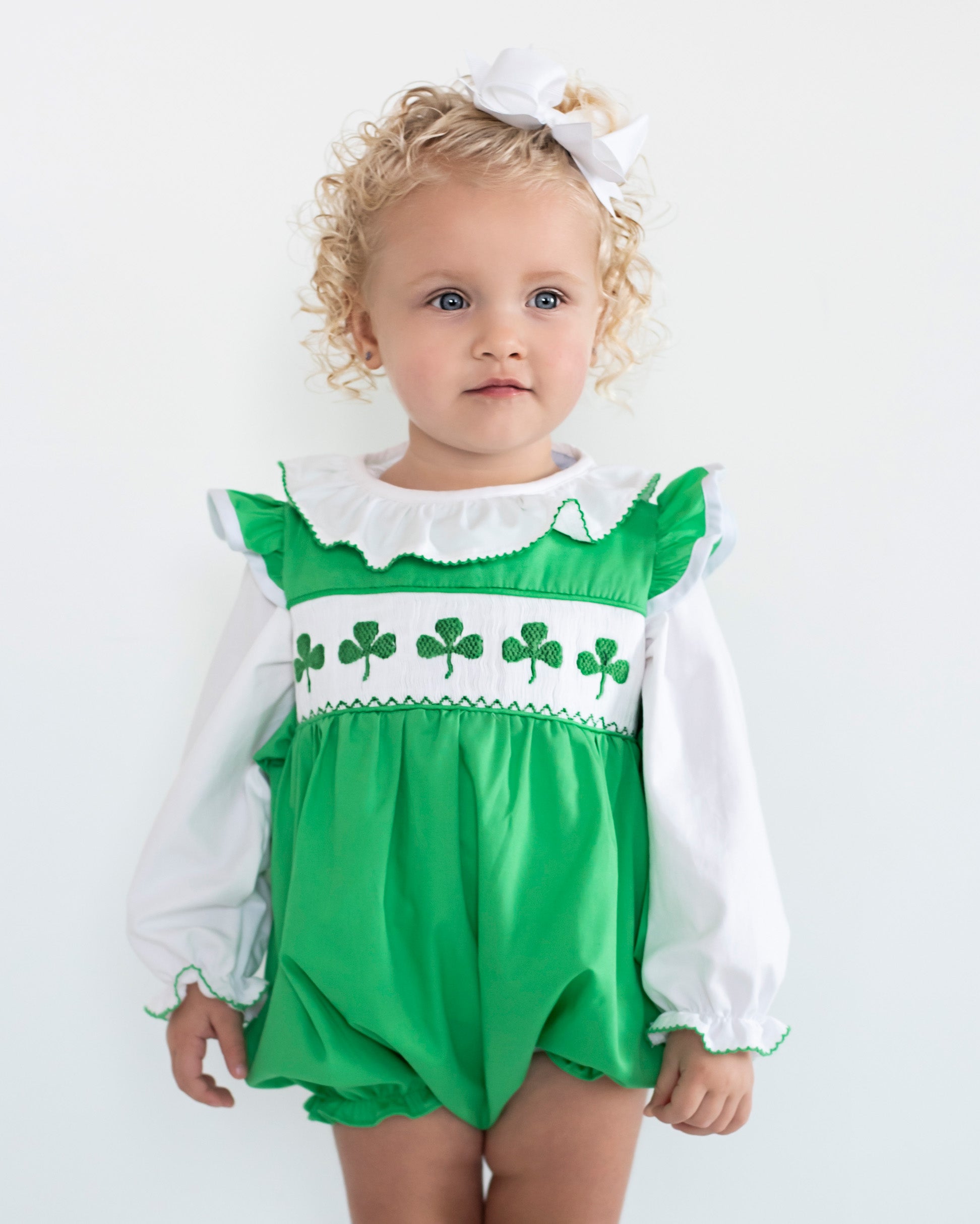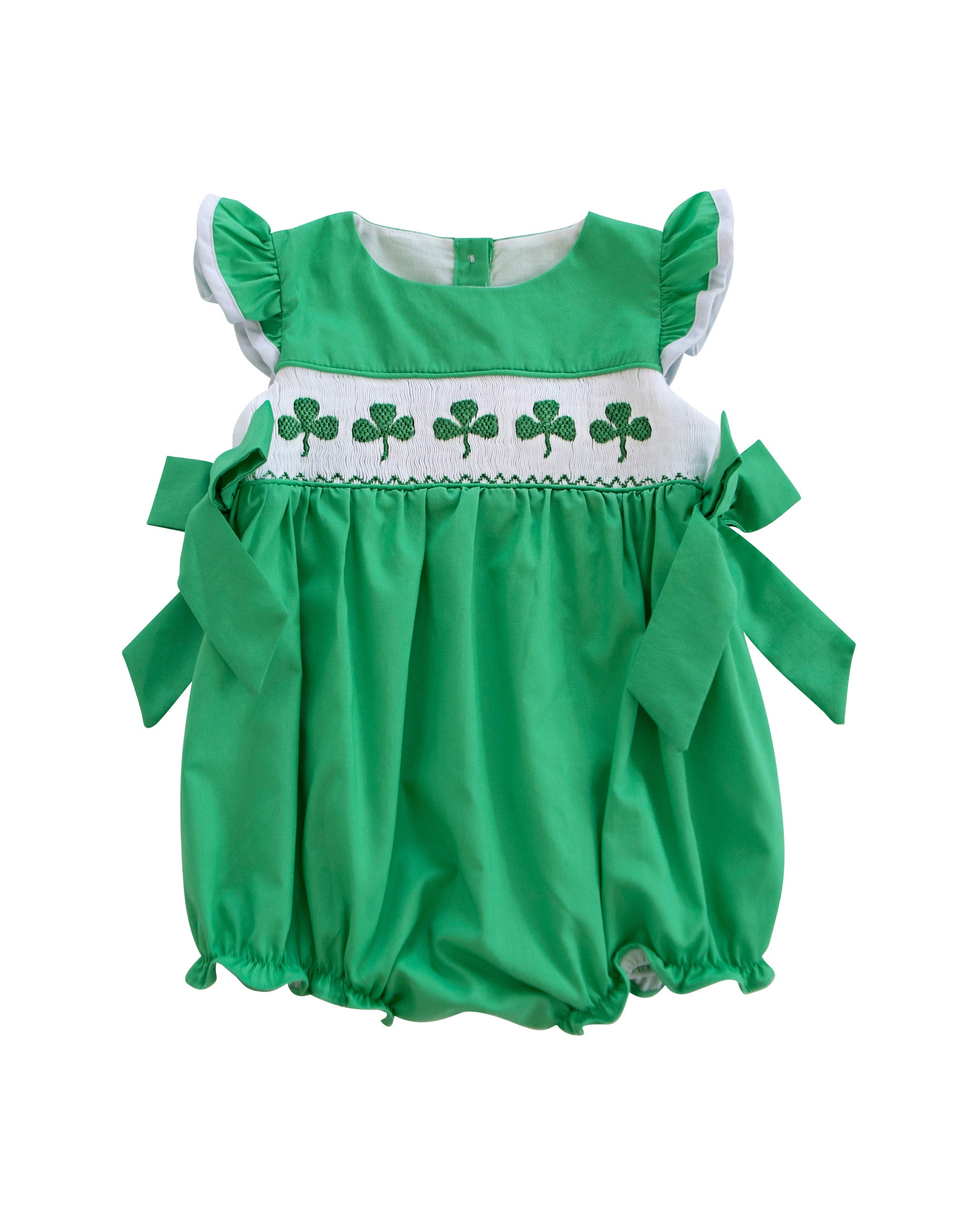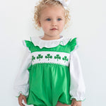 A playful and stylish choice for your baby, this bubble features adorable shamrock smocking in a soft green knit fabric. The classic bubble silhouette is both comfy and cute, making it ideal for St. Patrick's Day parties, spring outings, or any festive celebration. Dress your little one in this charming piece for an effortless touch of Irish spirit!