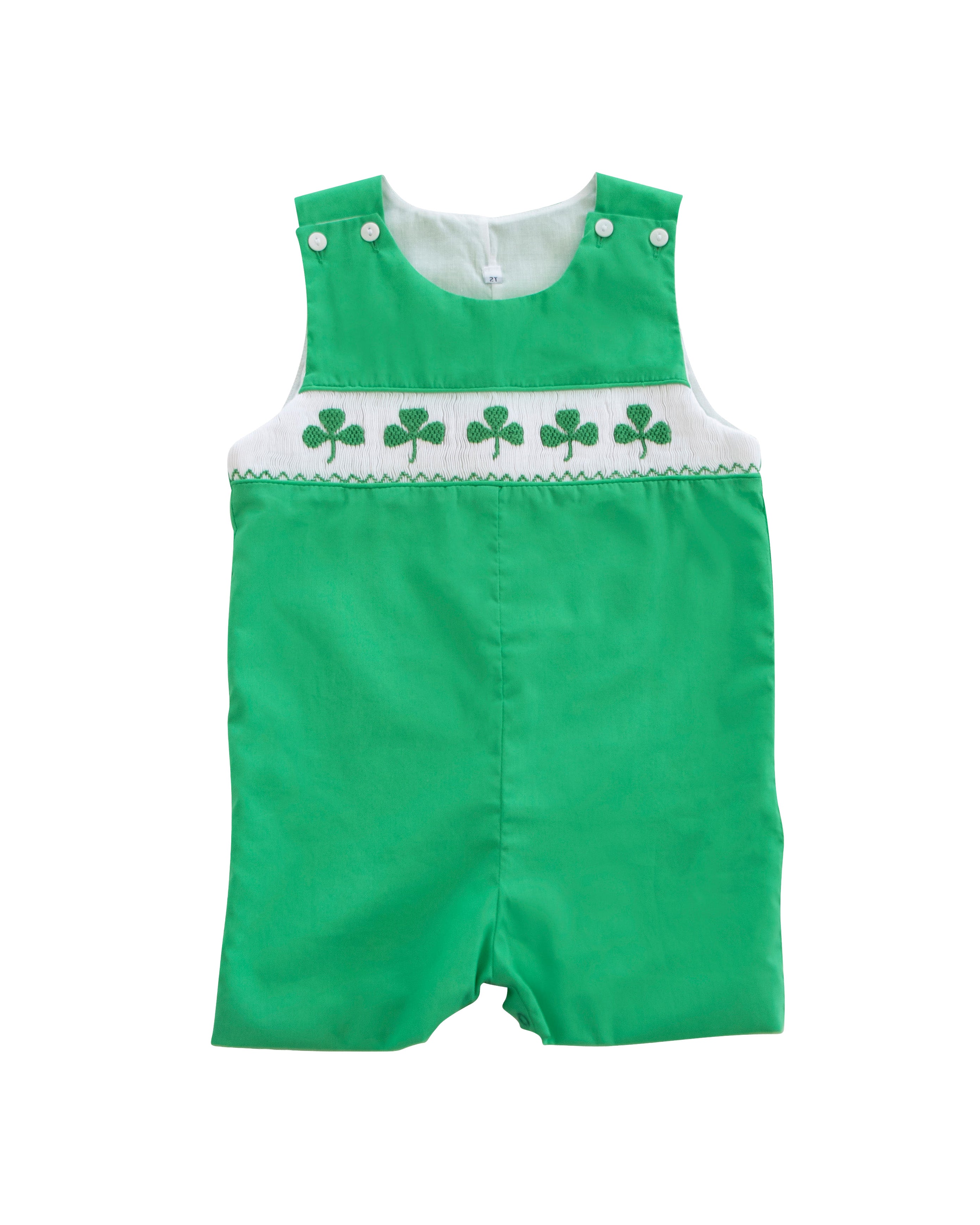 Perfect for St. Patrick’s Day playdates and springtime adventures, this green knit shortall features playful shamrock embroidery and a comfortable, breathable fit. The smocked design adds a touch of Irish elegance, making it an ideal choice for St. Patrick's Day celebrations or casual outings with family and friends.