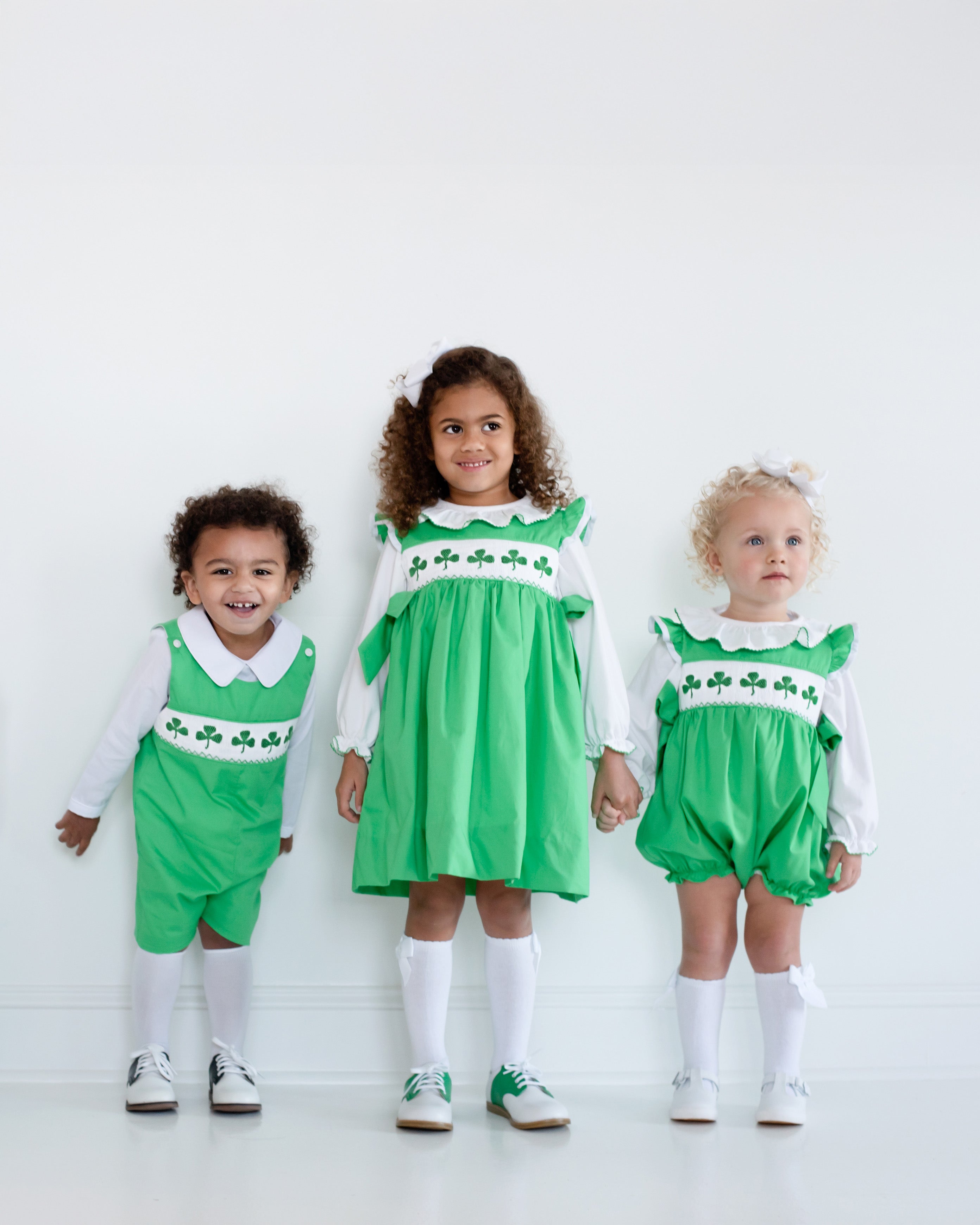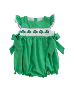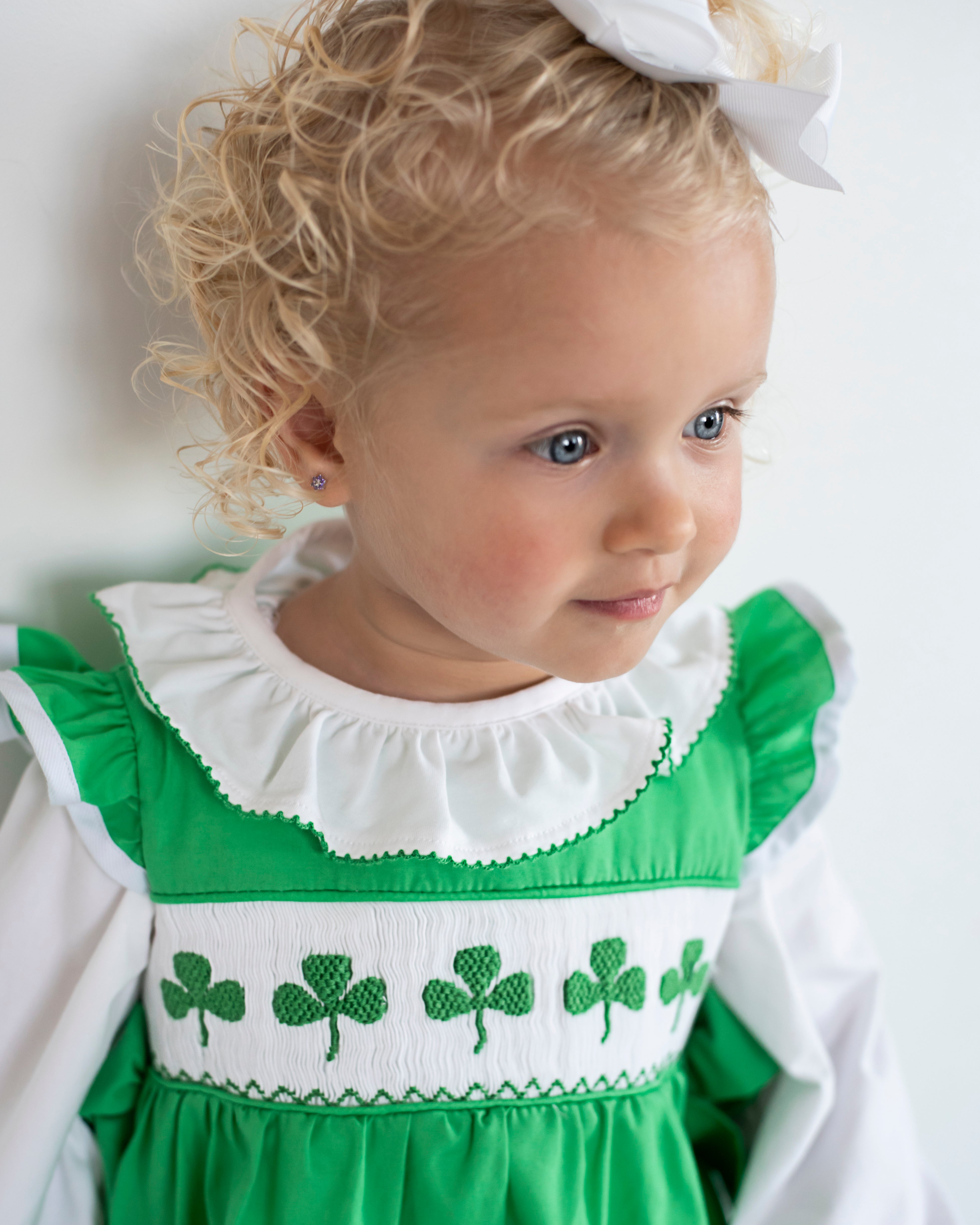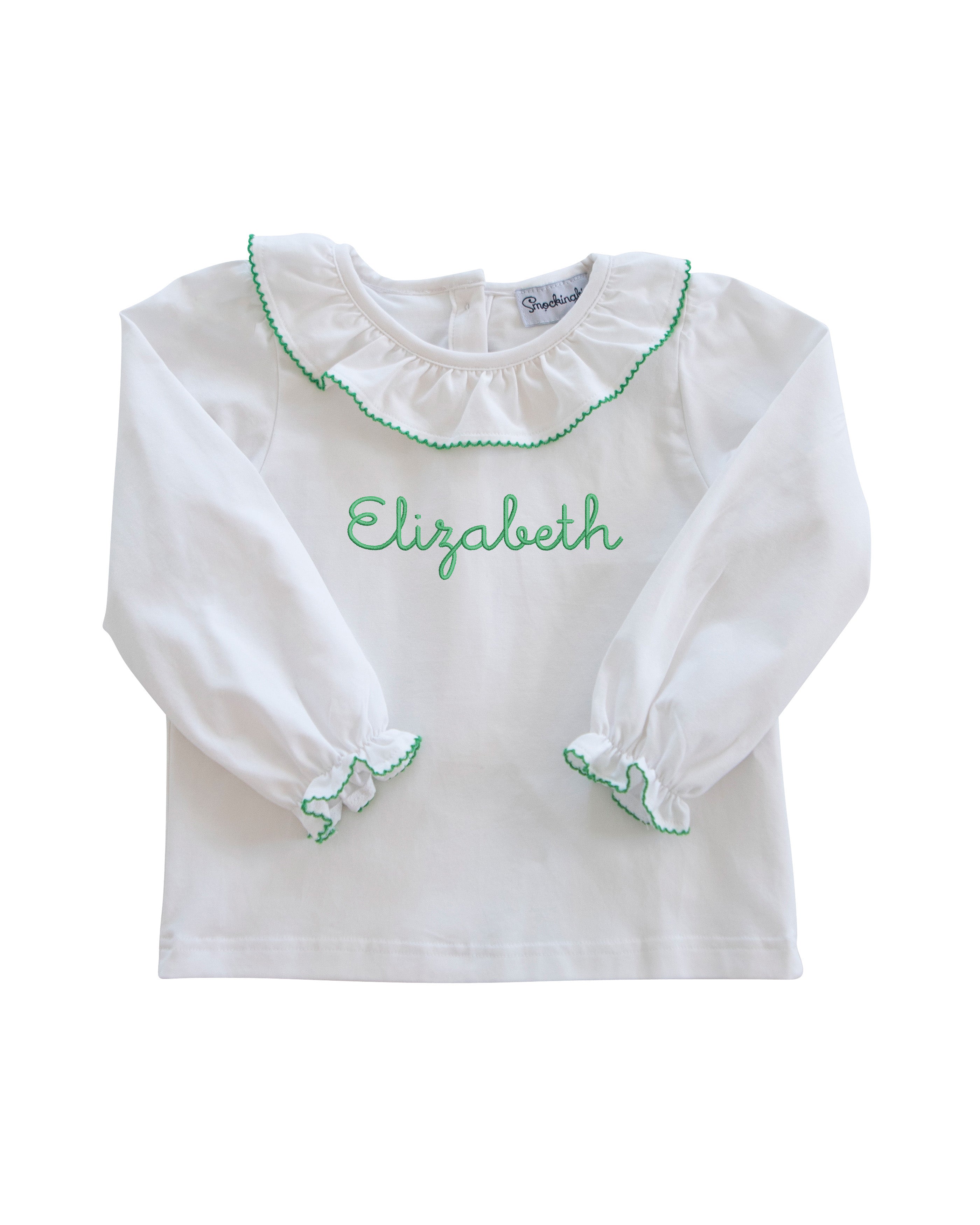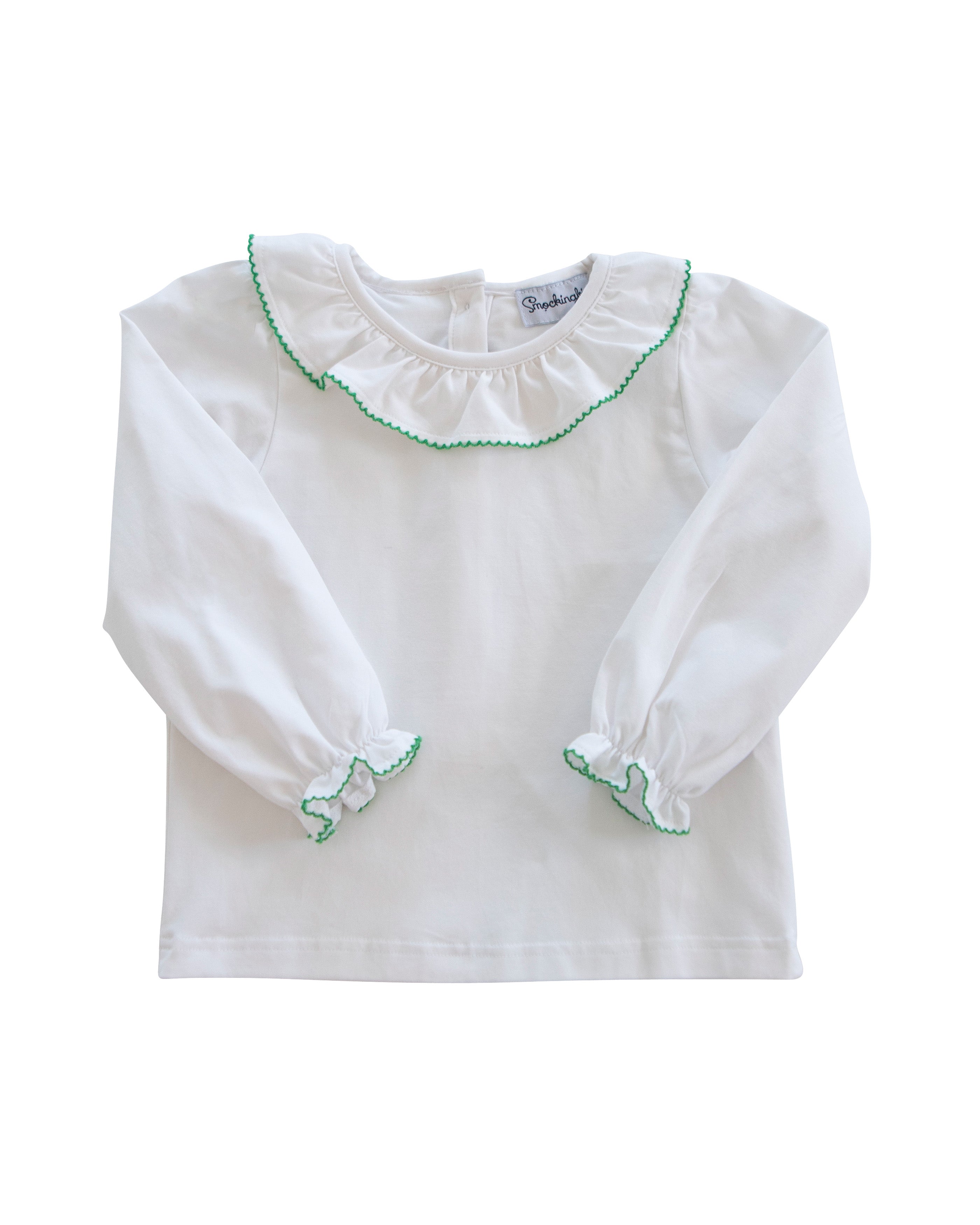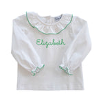 This white long sleeve blouse is a perfect compliment with anything. Not only does it have a green trim, but also has a ruffle collar. Bubble sold separately.