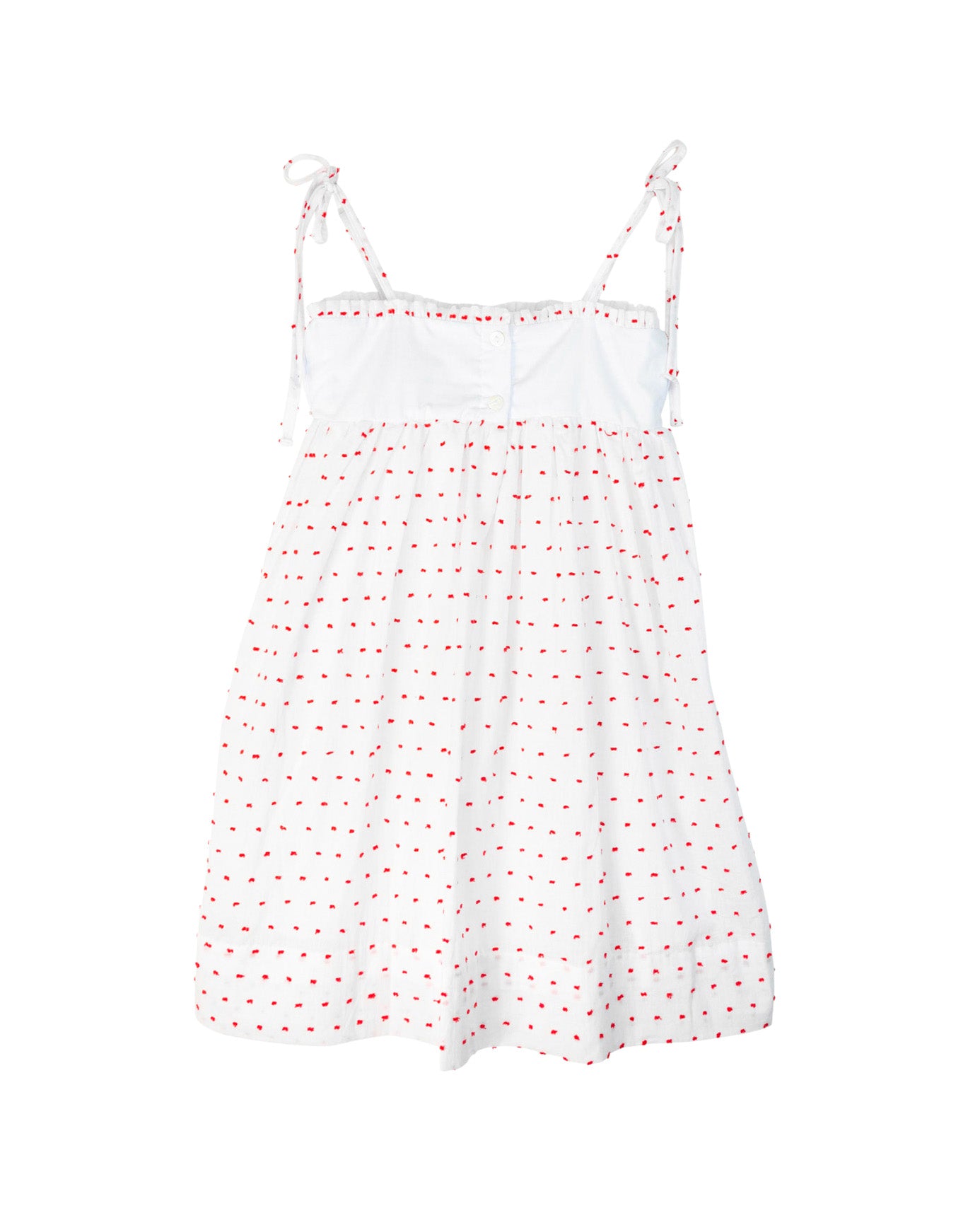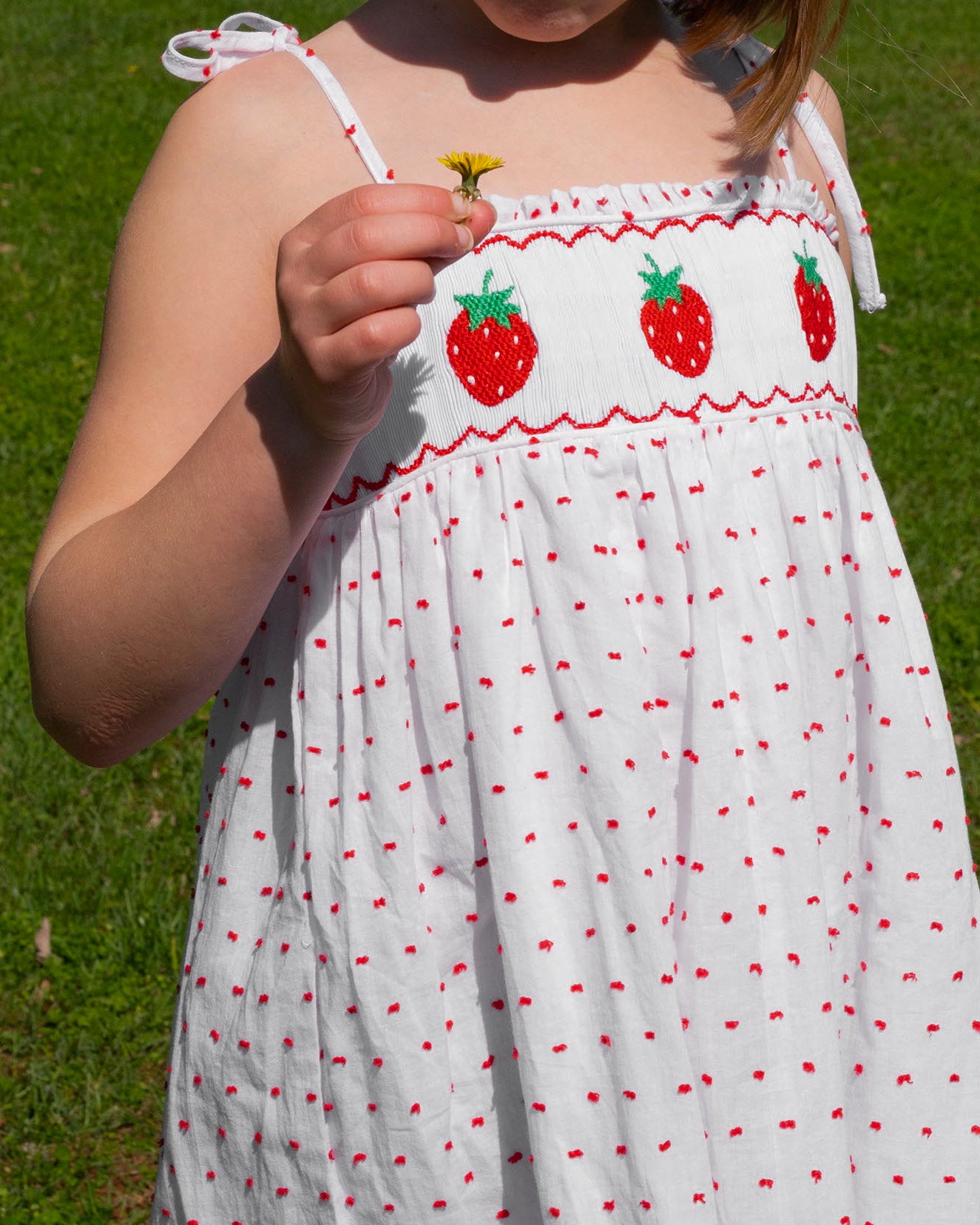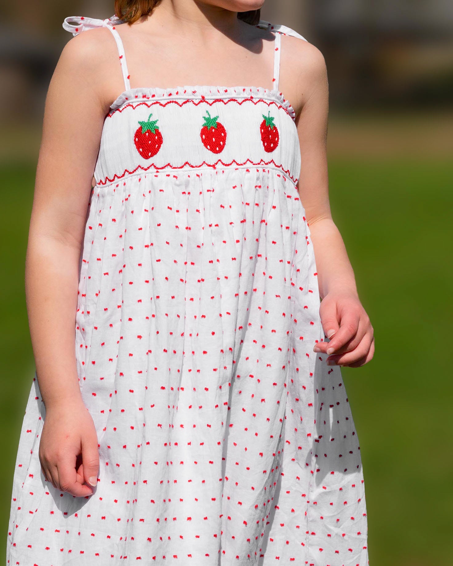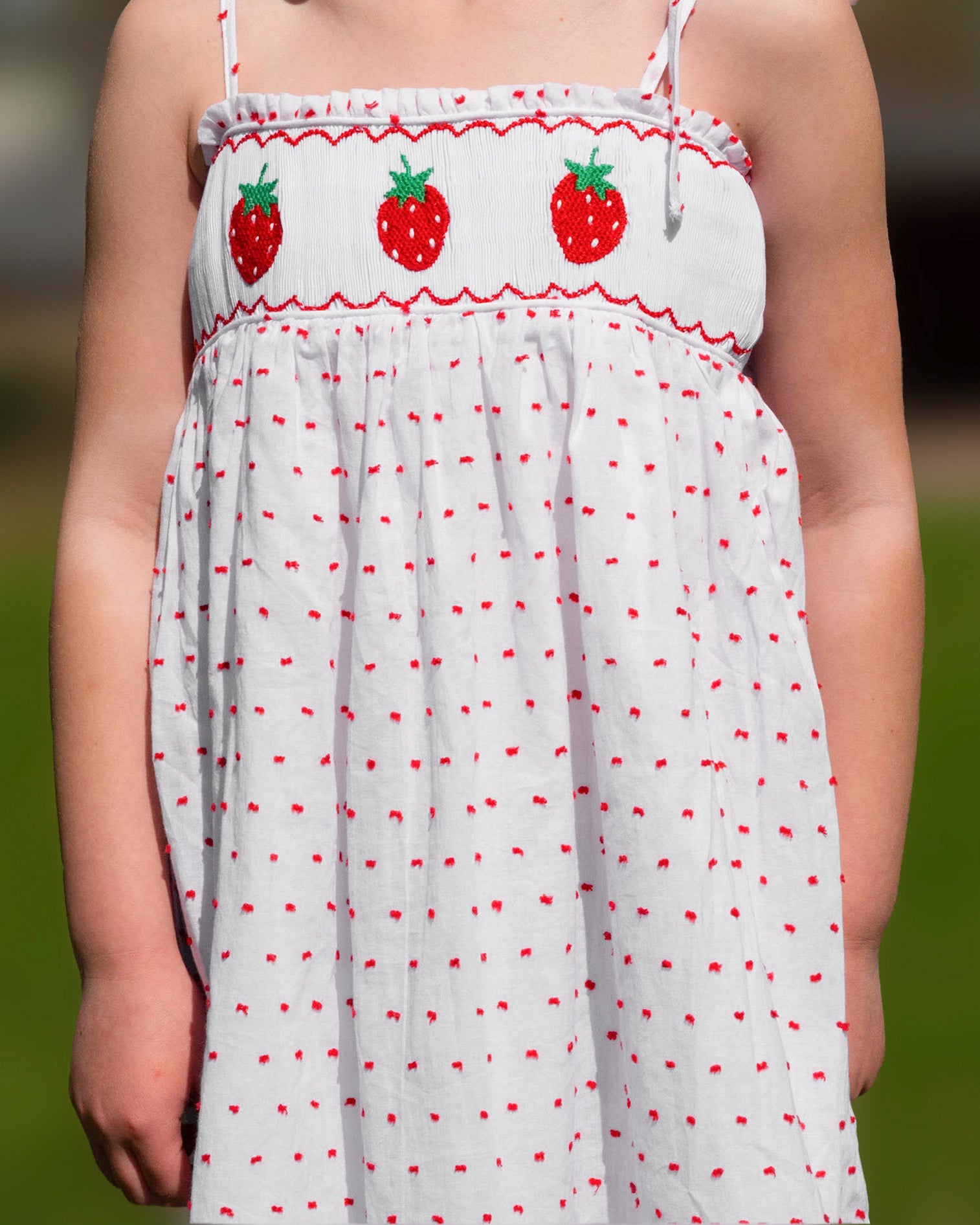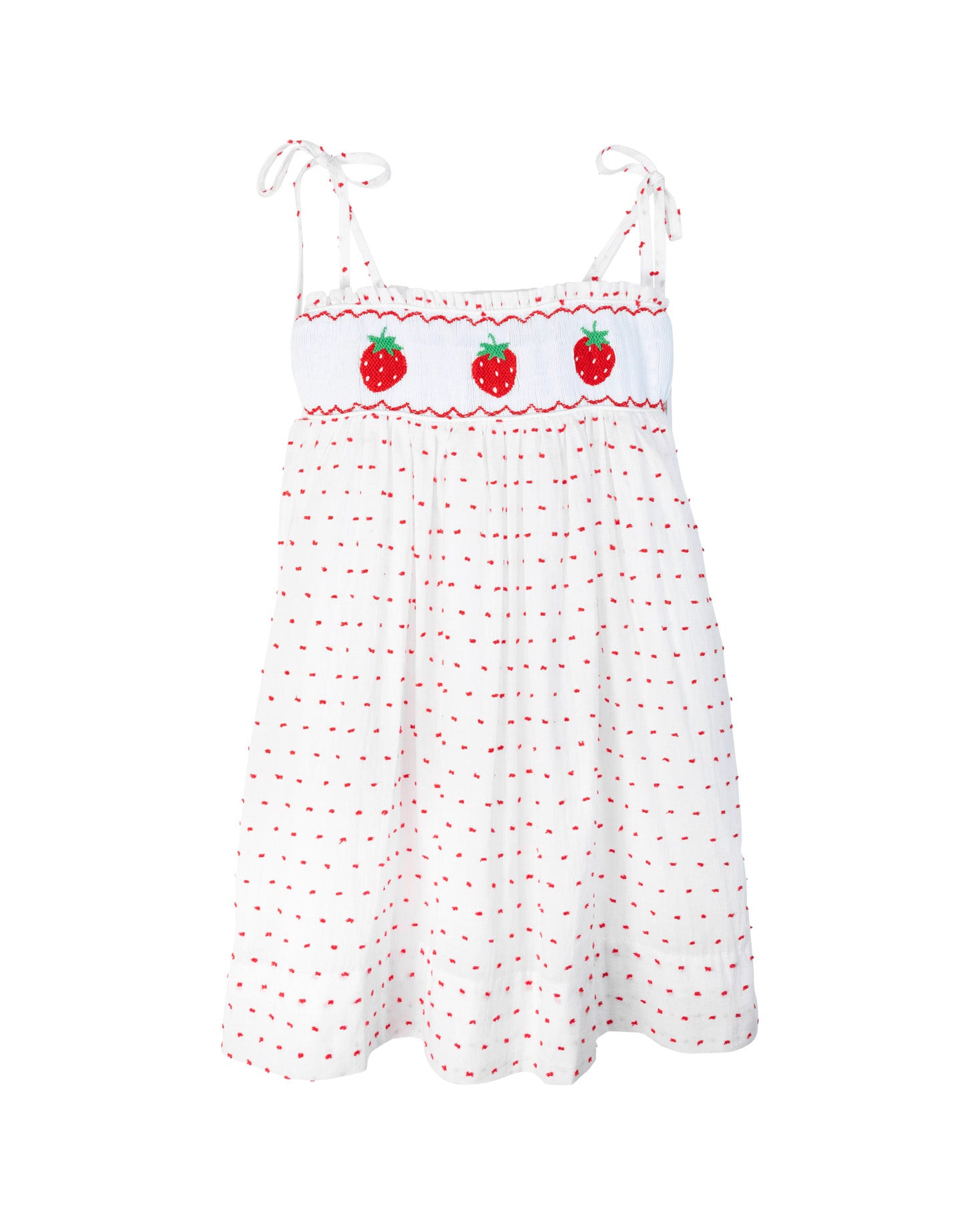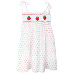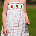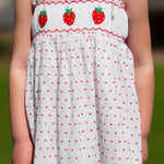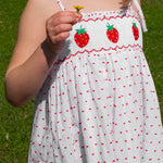 A BERRY sweet favorite! This Strawberries Smocked Swiss Dot Dress features hand smocked strawberries across the chest, adjustable tie straps, and classic swiss dot fabric. Perfect for summertime fun with friends.
