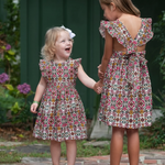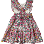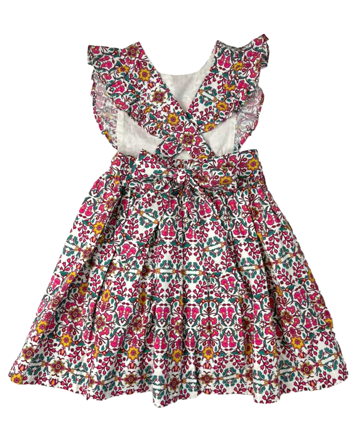 This vibrant penny dress features a playful tutti frutti floral block print full of cheerful color. The lively pattern brings a fresh and joyful feel to every wear. Perfect for warm days and special occasions. The dress features criss cross straps in the back with adjustable buttons and a tie in the back for the perfect fit. A delightful choice for brightening any wardrobe.
