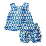 This blue ikat bloomer set brings effortless summer charm with its timeless pattern. Designed for warm-weather days, it’s perfect for outings, vacations, and special moments. Light and comfortable for all-day wear. A classic bloomer set that captures easy seasonal style.