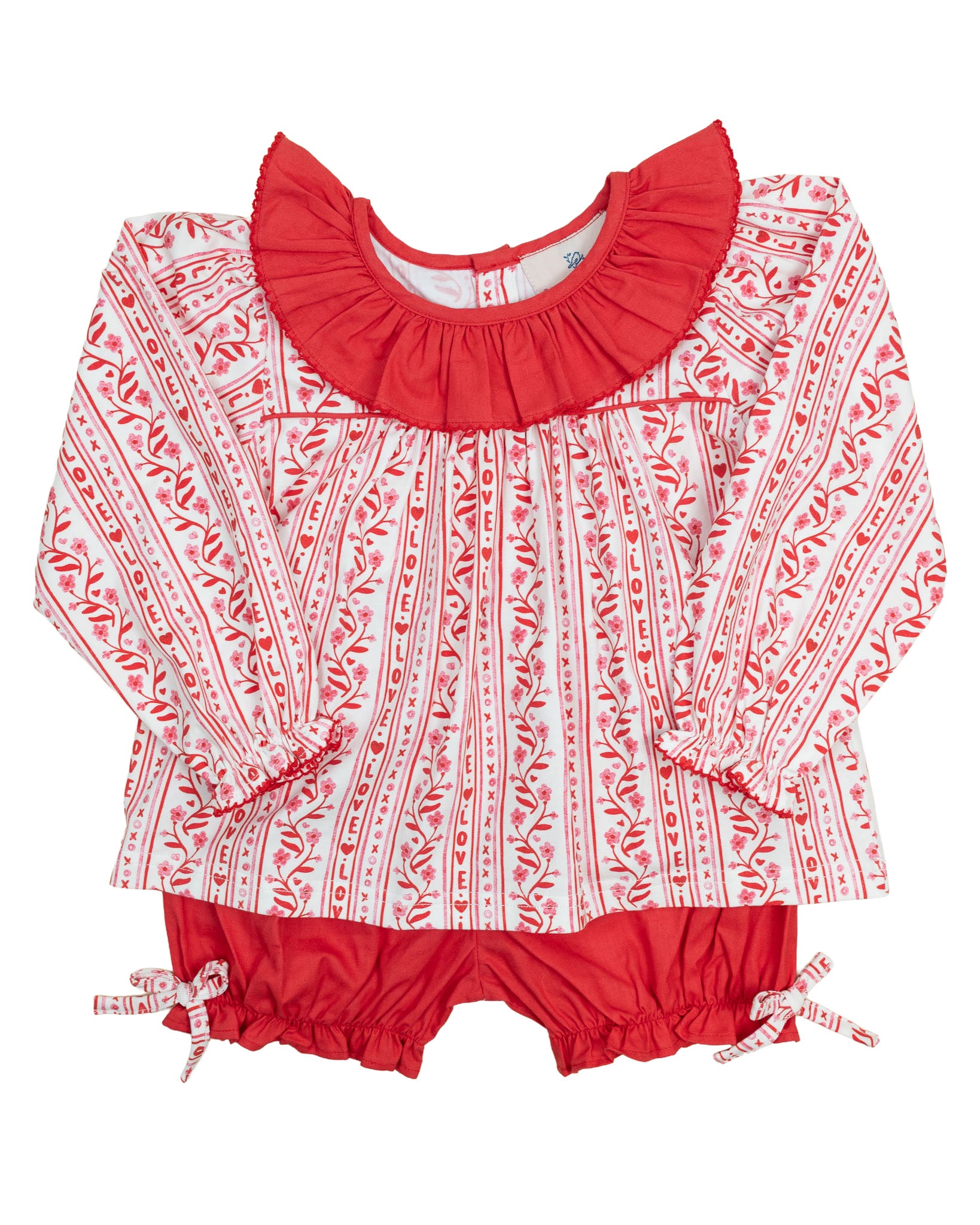 Say hello to Valentine-ready sweetness with our Be Mine Blossoms Bloomer Set. Featuring a dainty floral print and soft red bloomers trimmed with tiny bows, this darling duo captures the spirit of love in every stitch. Perfect for cozy days, playdates, or any occasion worth a little extra charm.