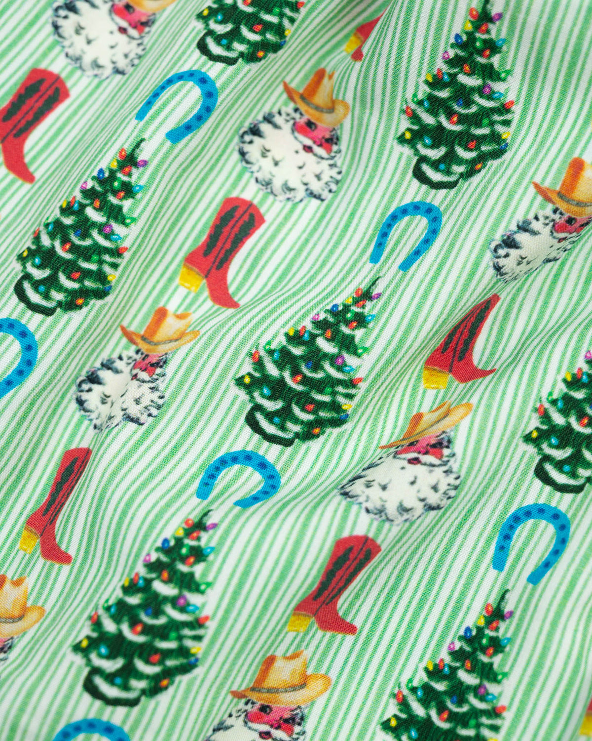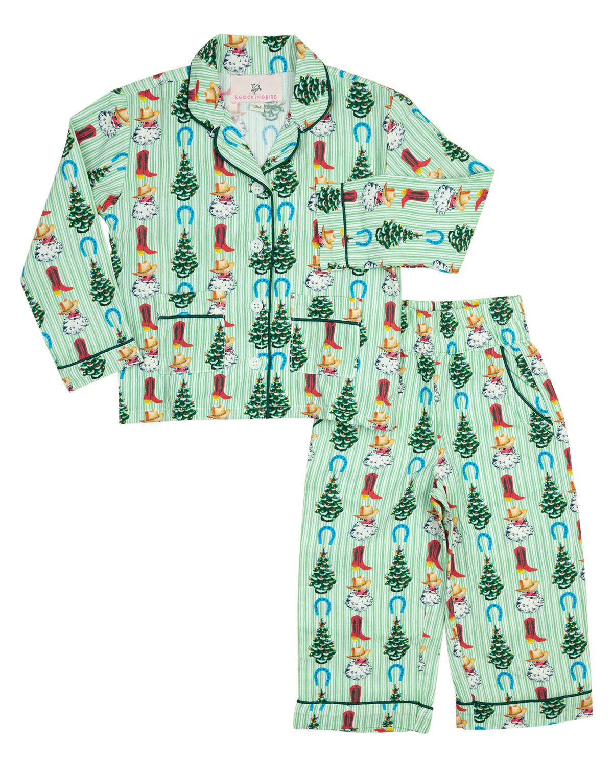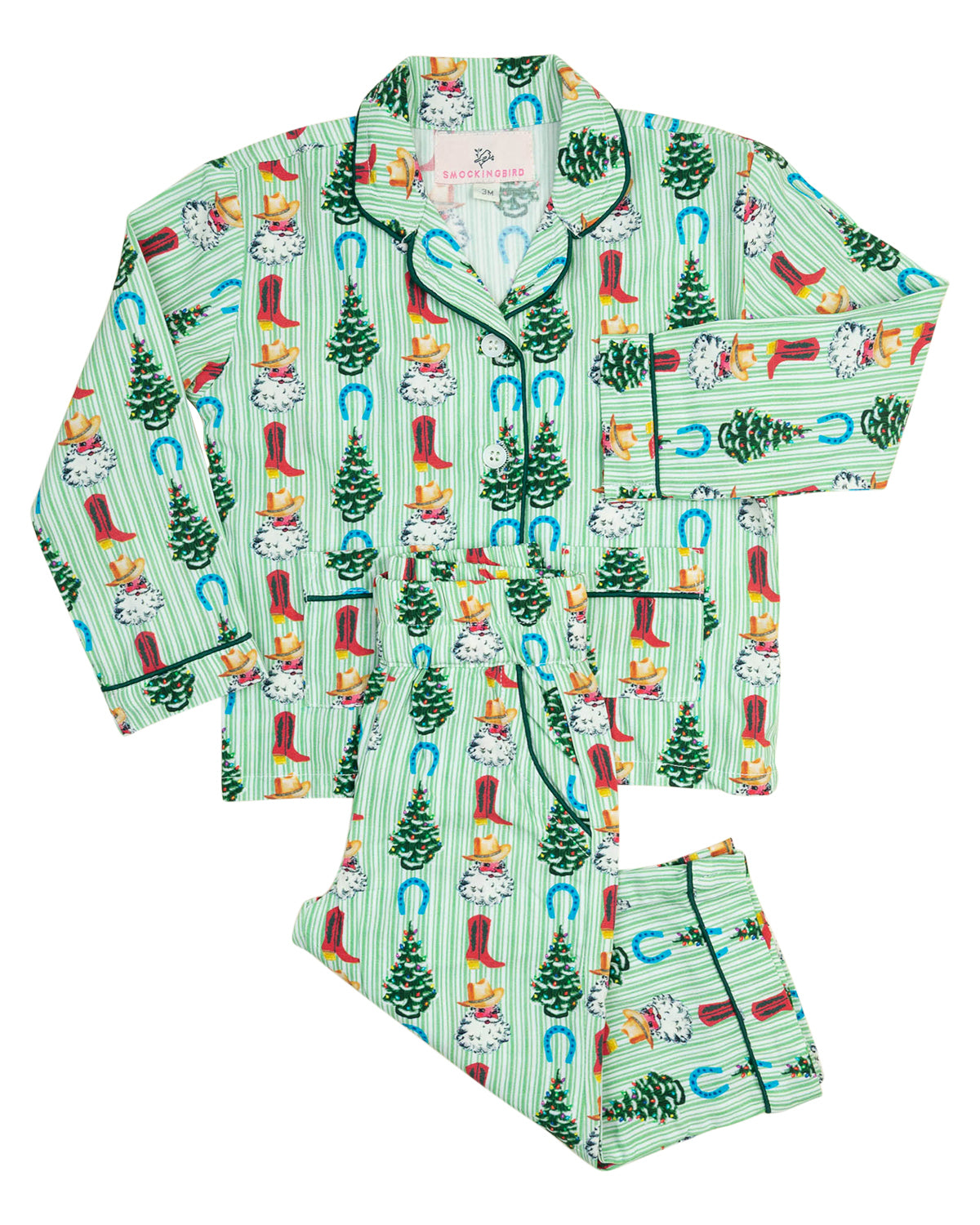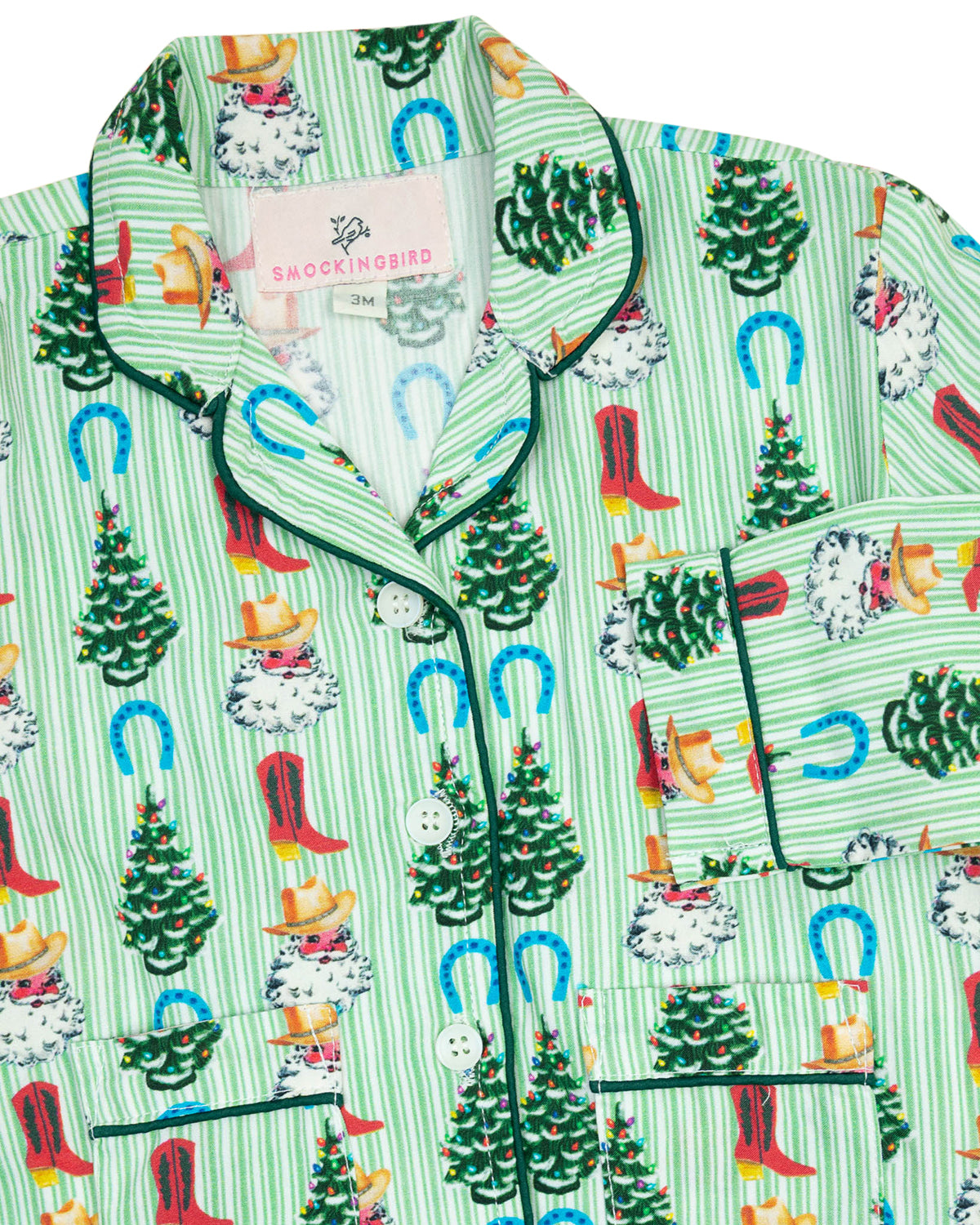 Celebrate Christmas mornings in style with the Cowboy Christmas Green Stripe Pajama Set. Featuring festive stripes and a cowboy-inspired print, these pajamas are soft, breathable, and fun. Perfect for family photos, bedtime stories, and Christmas Eve traditions, they’re made to keep kids cozy and cheerful.