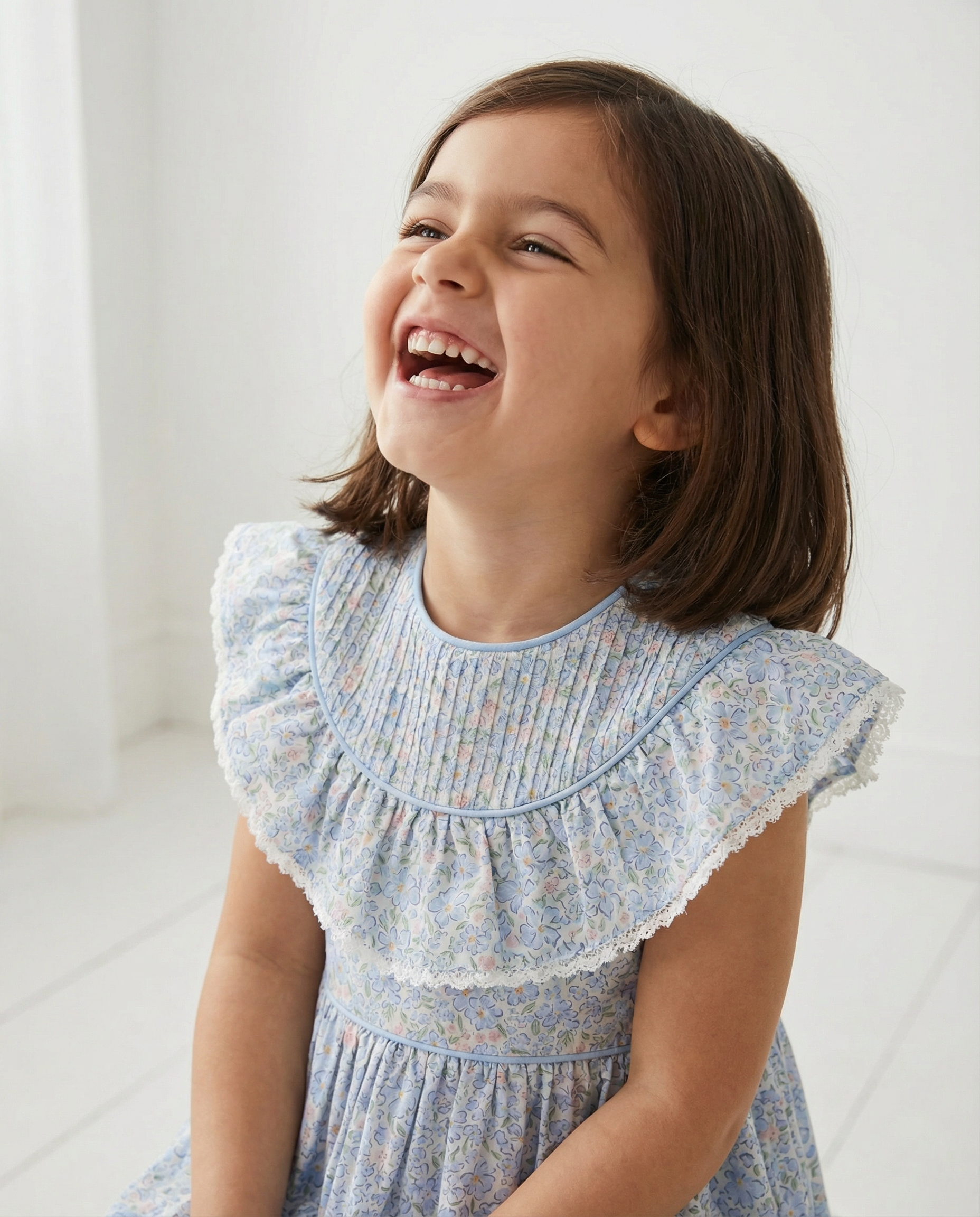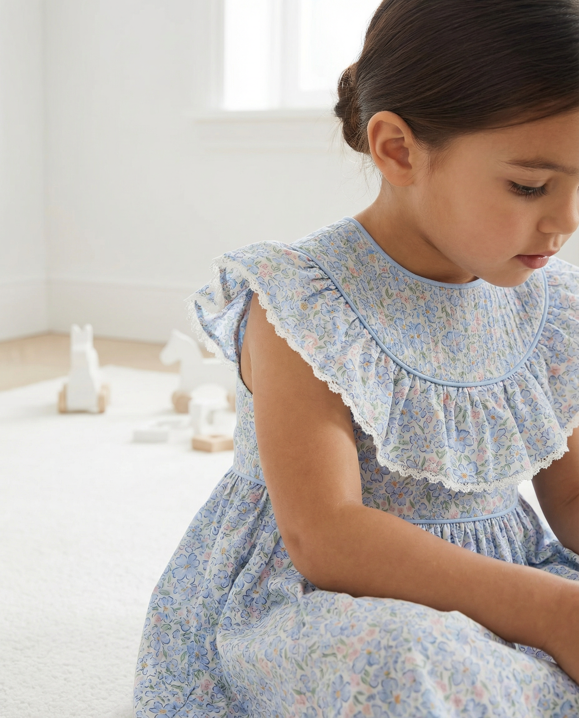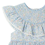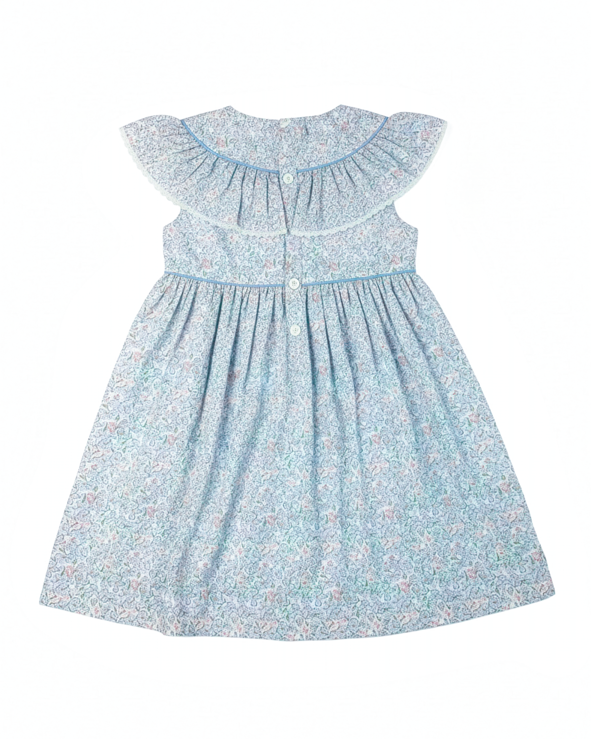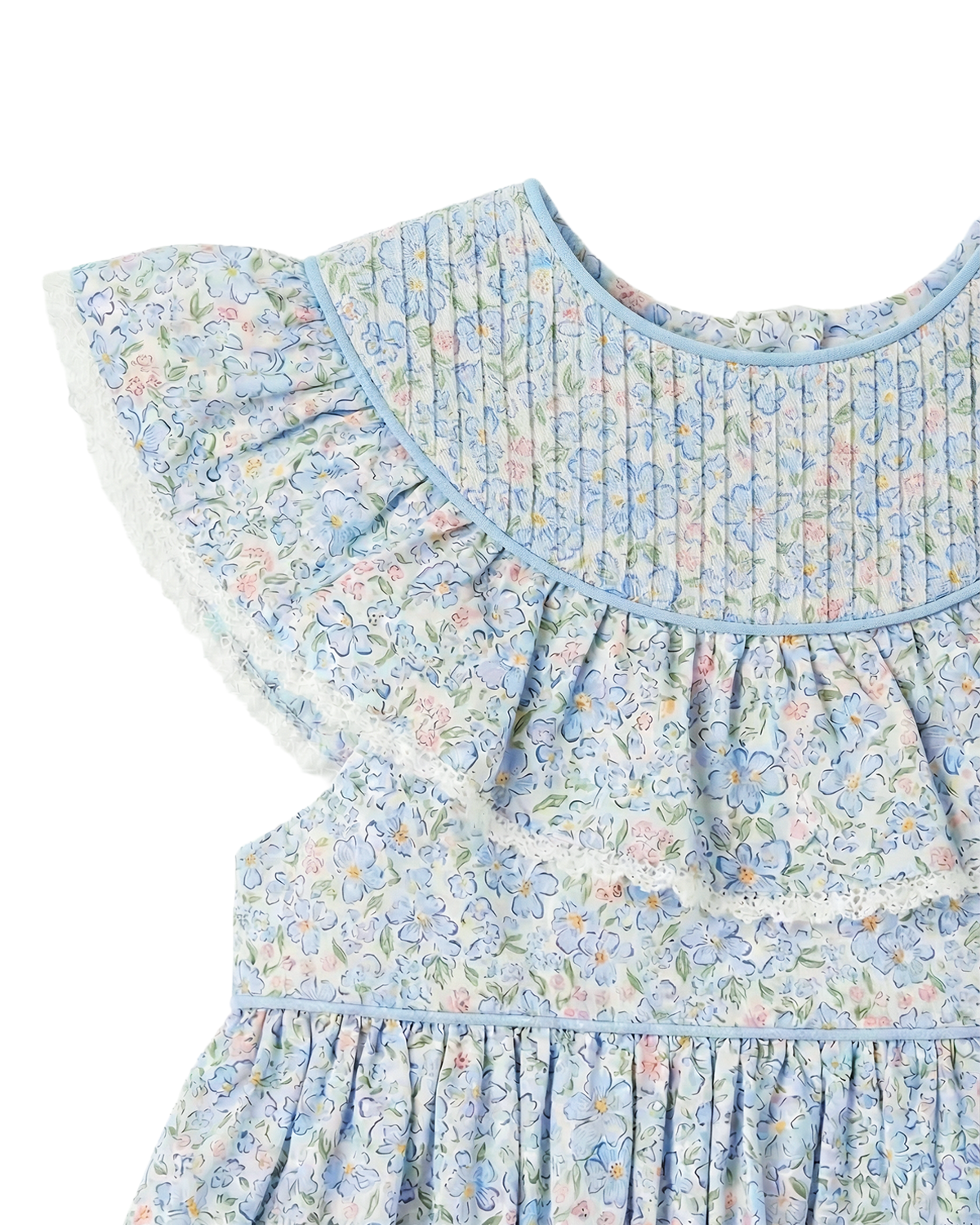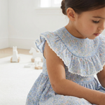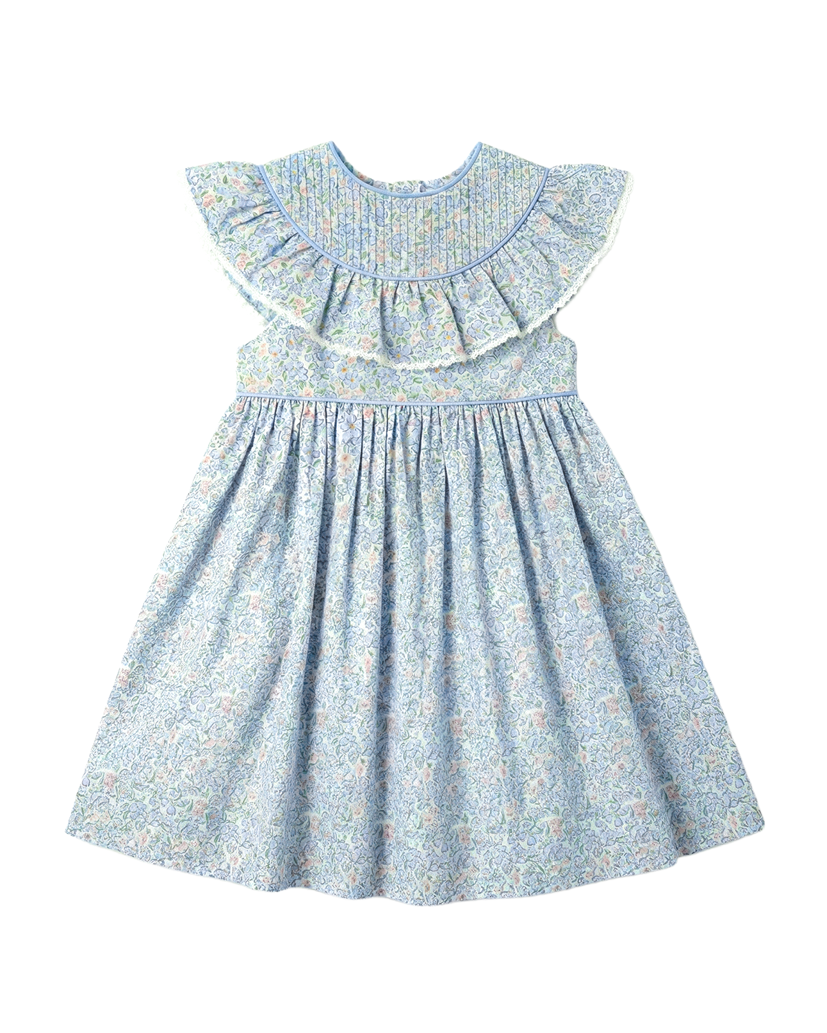 This sweet dress showcases a beautifully detailed pleated collar accented with delicate trim. Designed with a softly gathered silhouette for a classic and comfortable fit. The light spring print makes it perfect for the season. A timeless Easter dress for church services, spring celebrations, and family photos.