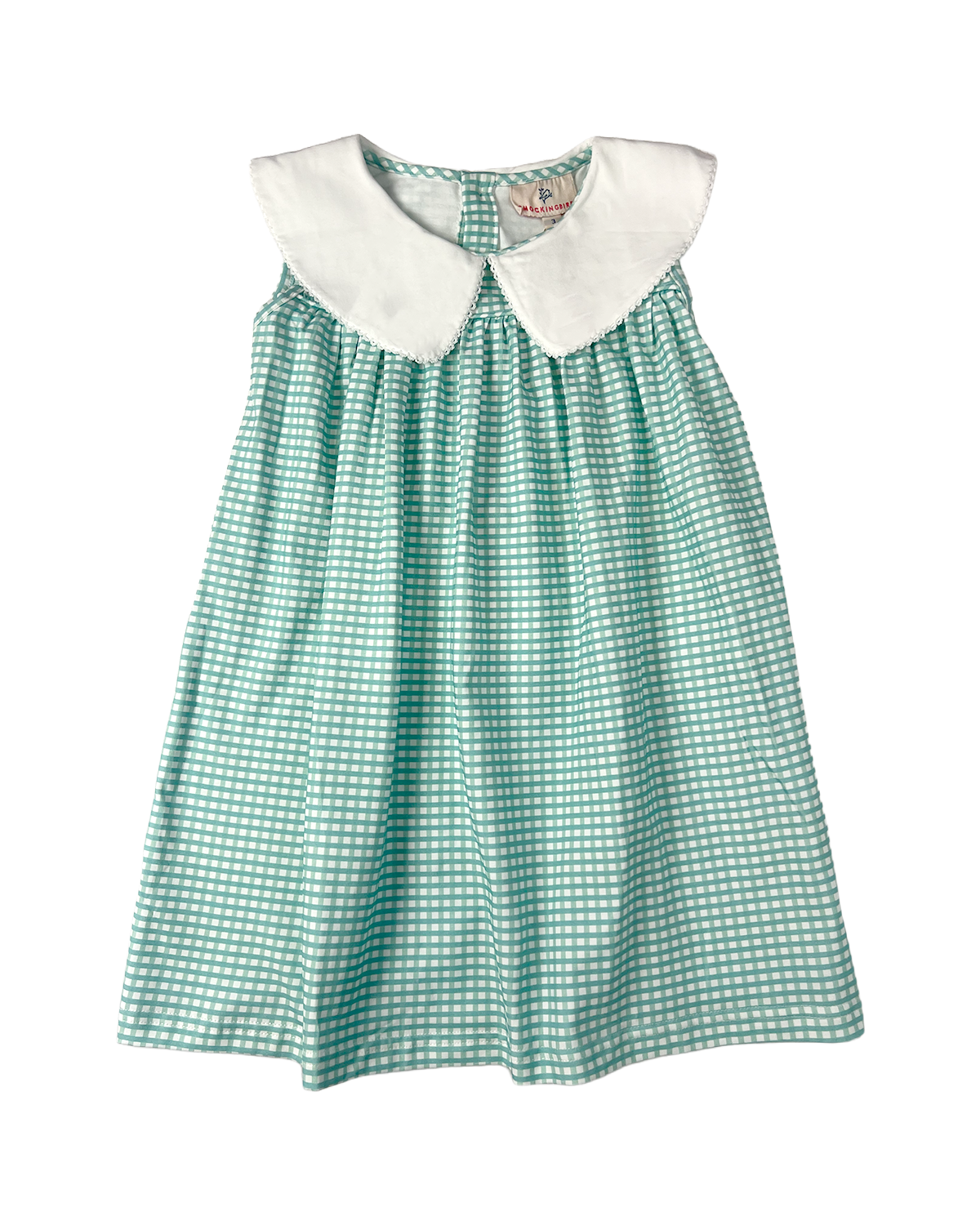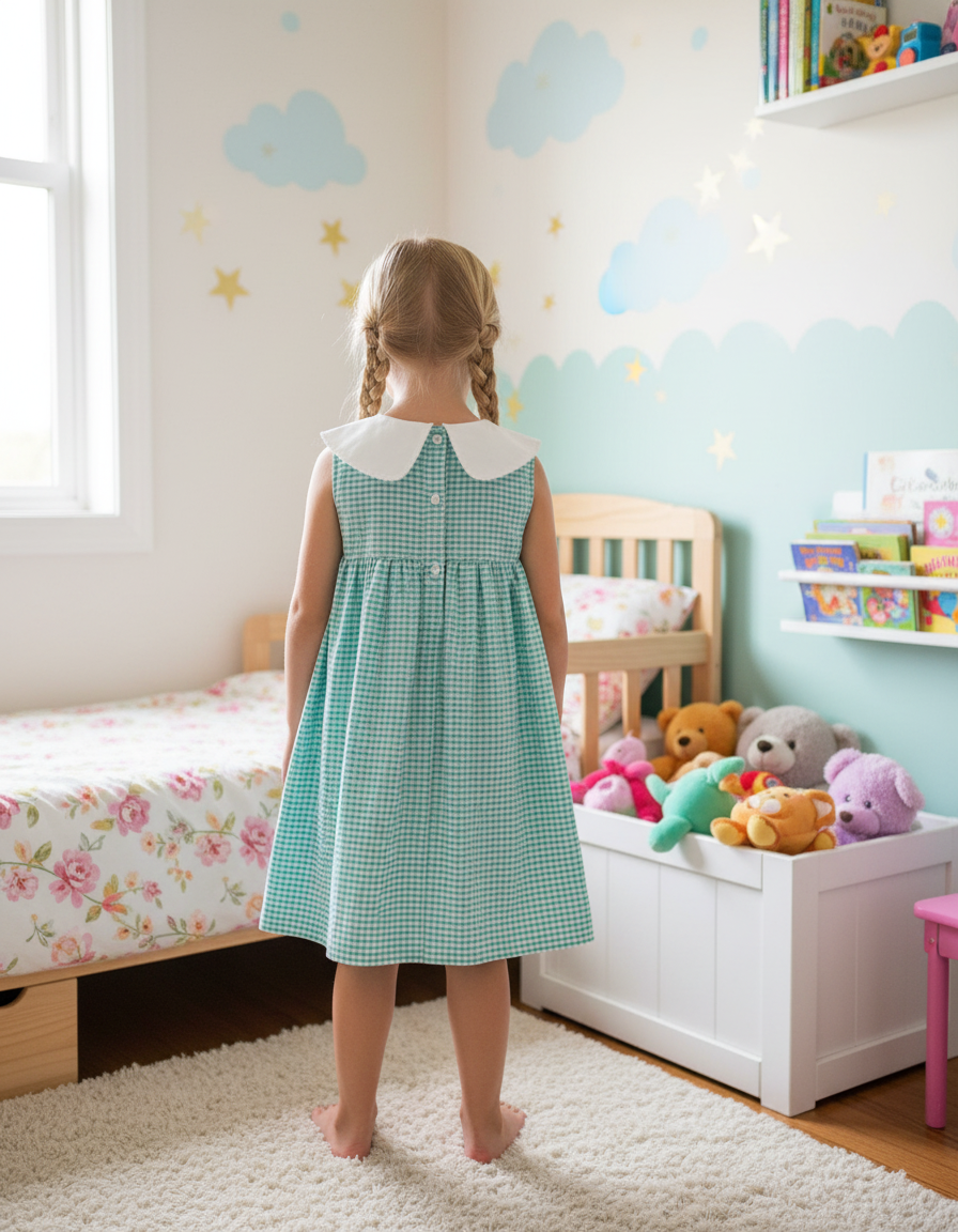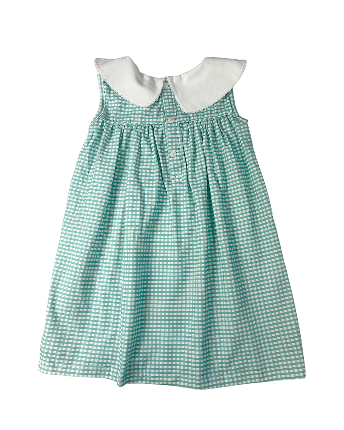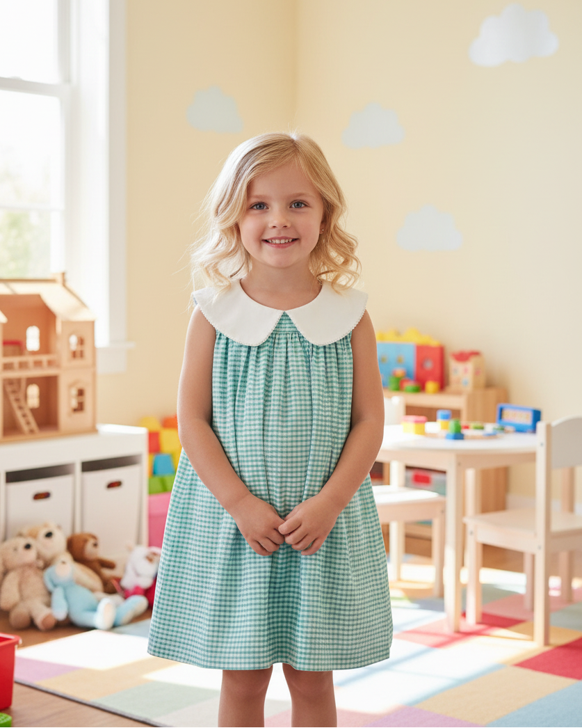 This beautiful knit dress features a soft garden green gingham pattern with a classic oversized white collar. Designed with a relaxed fit and gently gathered skirt, it provides comfort while maintaining a traditional look. The stretchy knit fabric allows for easy dressing and all-day wear. Perfect for school days, portraits, and seasonal celebrations.