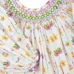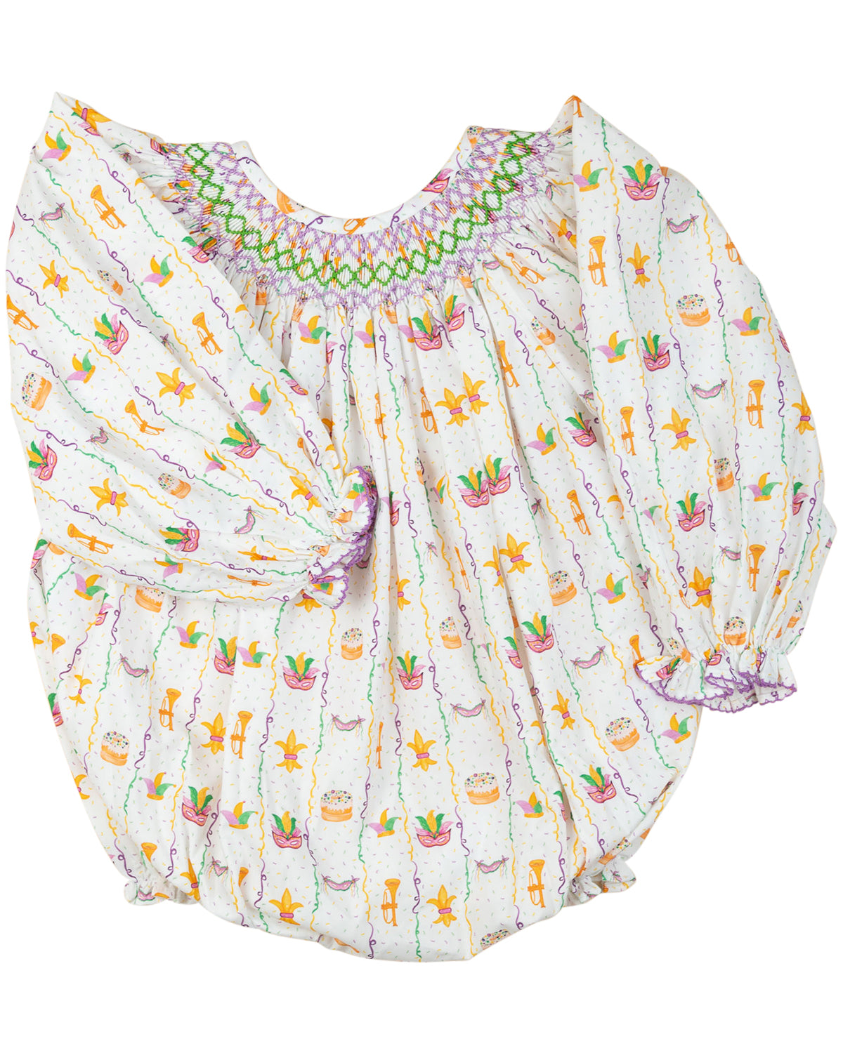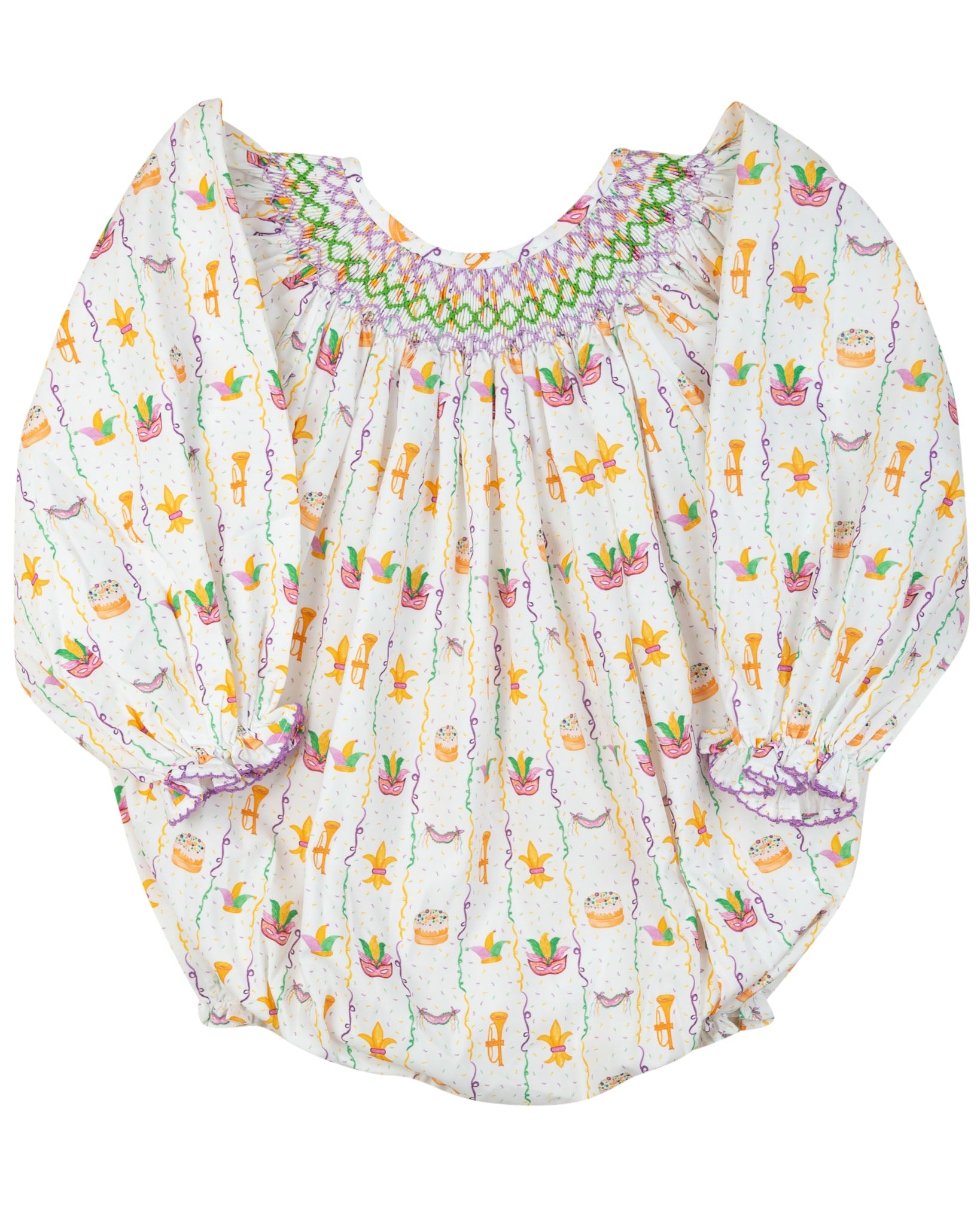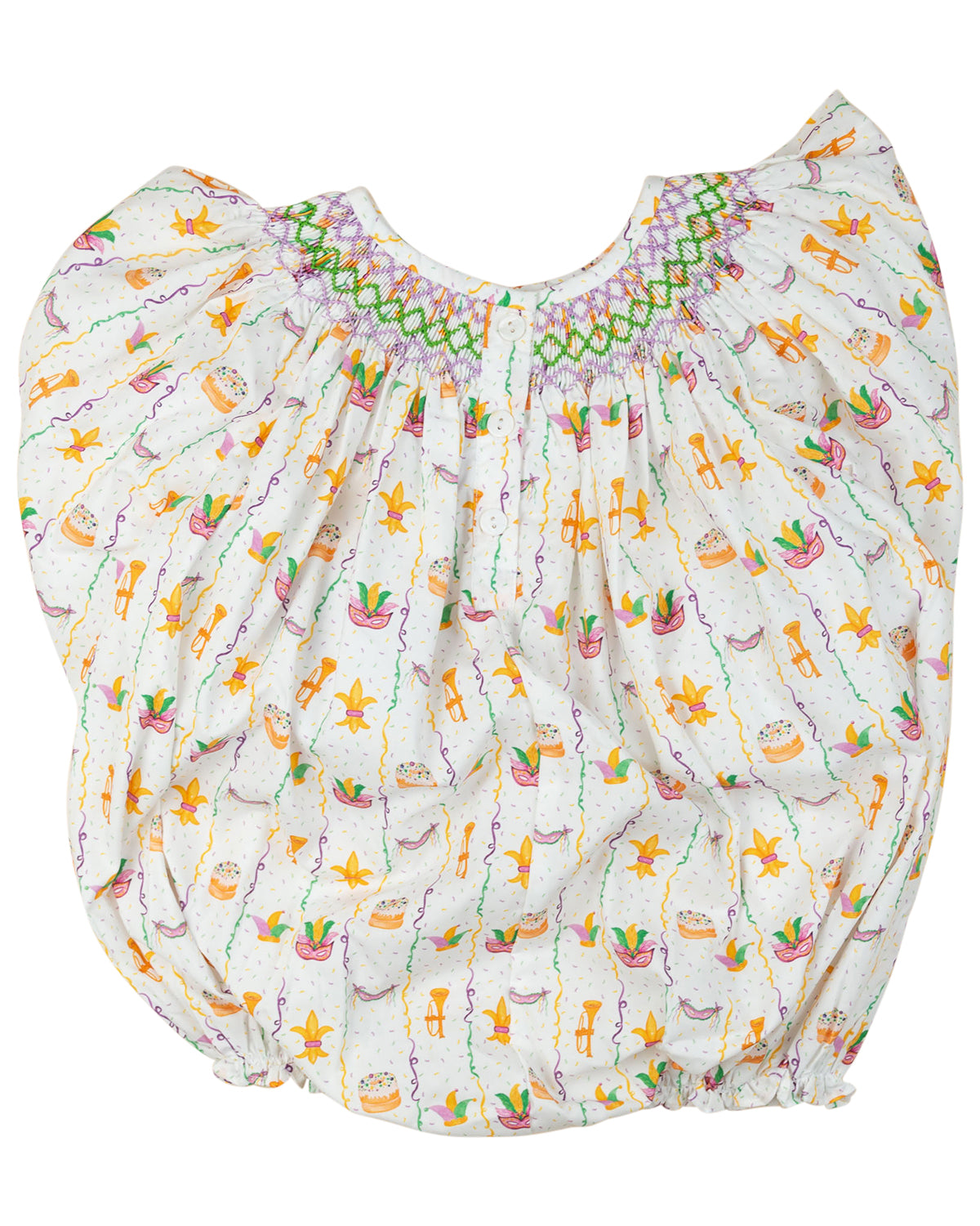 Bring the spirit of Mardi Gras to your baby’s wardrobe with our adorable Mardi Gras Smocked Bubble! This sweet one-piece features a lively party print, delicate smocking, and ruffled details for a timeless look. With snap closures for easy changing, it’s as practical as it is precious for all-day celebrations.