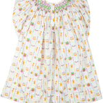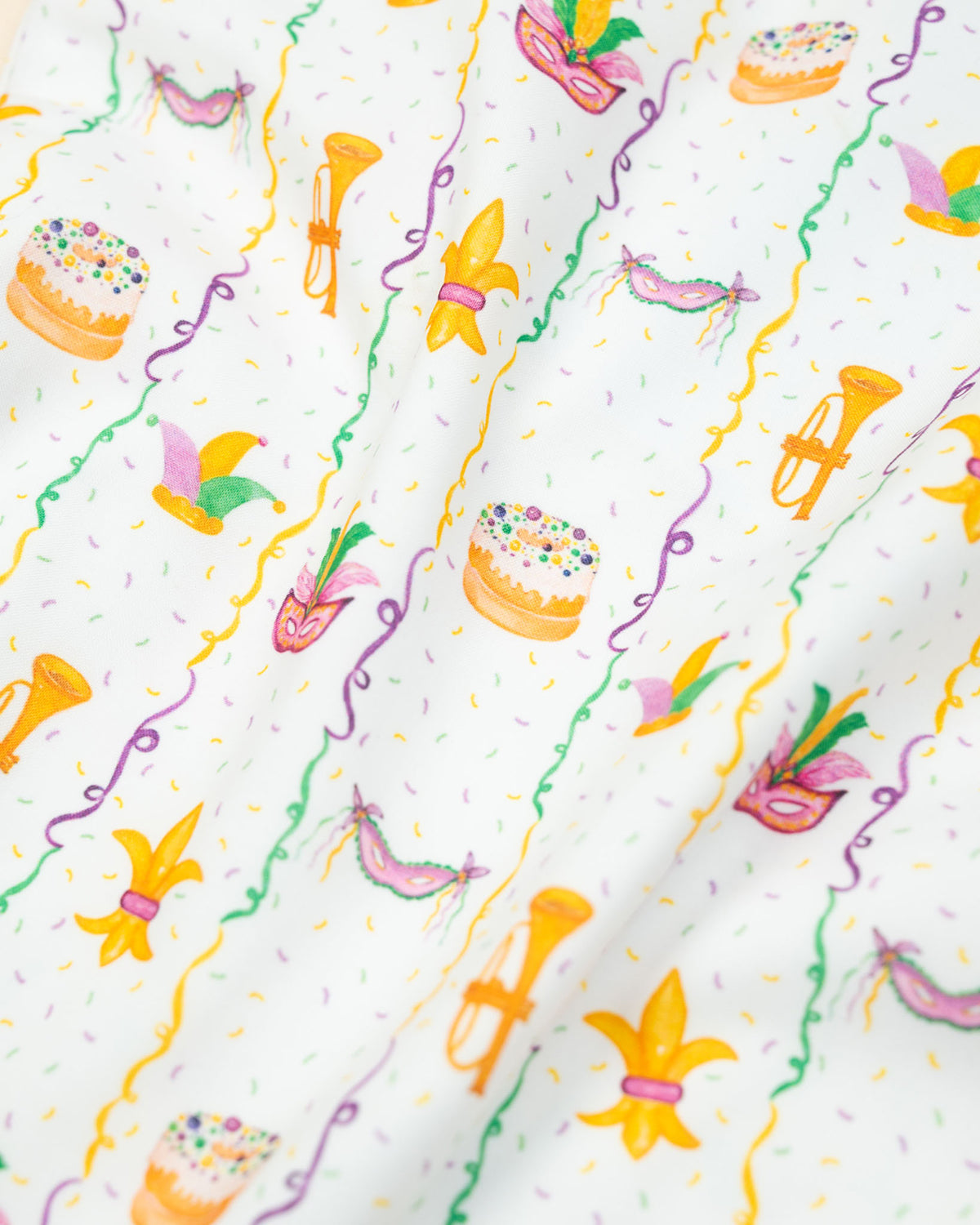 Let the good times roll with our festive Mardi Gras Smocked Dress! Featuring a playful Mardi Gras-inspired print with crowns, masks, and beads, this dress is perfect for celebrating in style. Designed with a classic smocked neckline, long sleeves, and a twirl-worthy silhouette, it ensures comfort and charm for your little one during any festive occasion.
