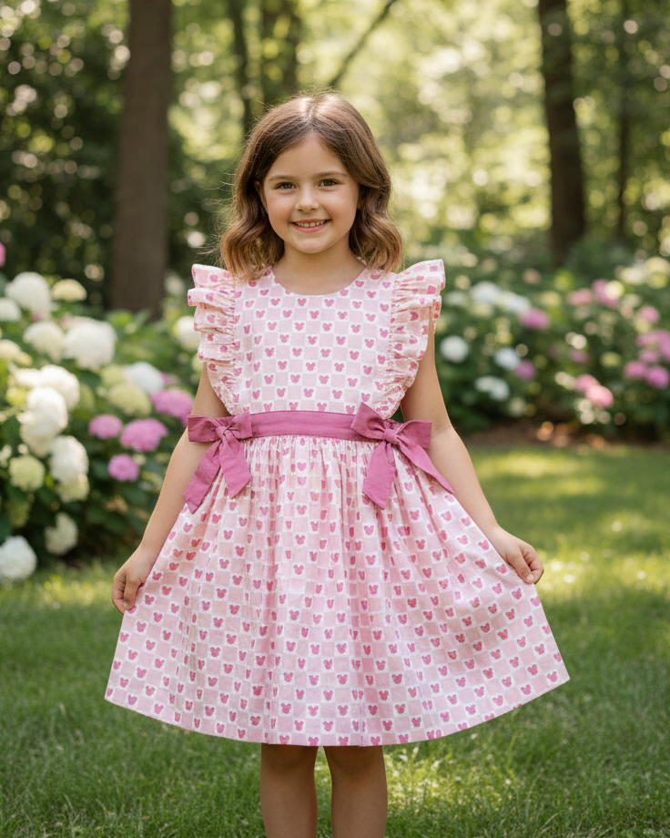 This sweet sun dress features a soft pink print accented with delicate mouse-inspired details for a magical Disney touch. Designed with flutter sleeves and waist tie bows, it creates a charming and polished look. The lightweight fabric keeps little ones cool and comfortable throughout the day. A beautiful choice for park visits, vacations, and special moments.